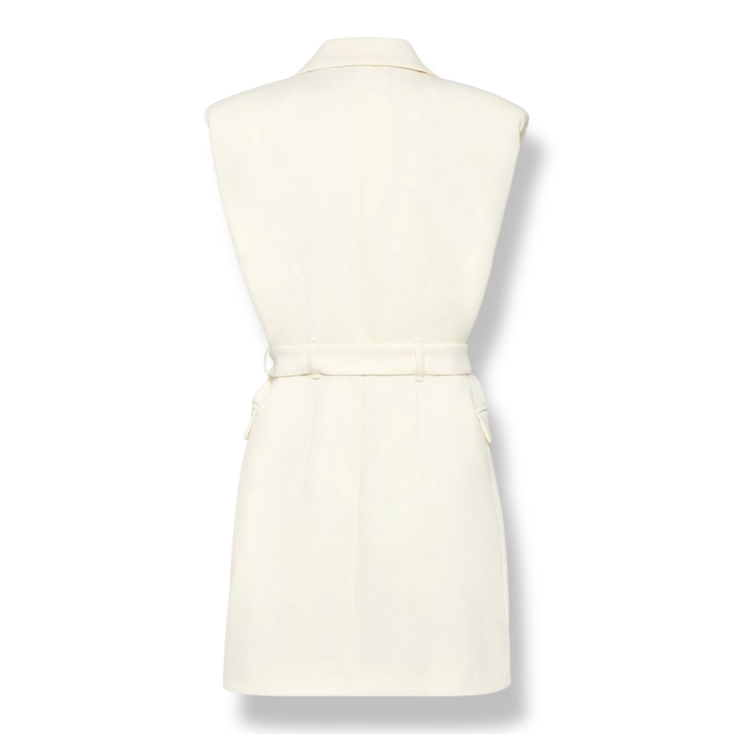 - Sleeveless ivory dress, double-breasted blazer style, with tone-on-tone belt at the waist.