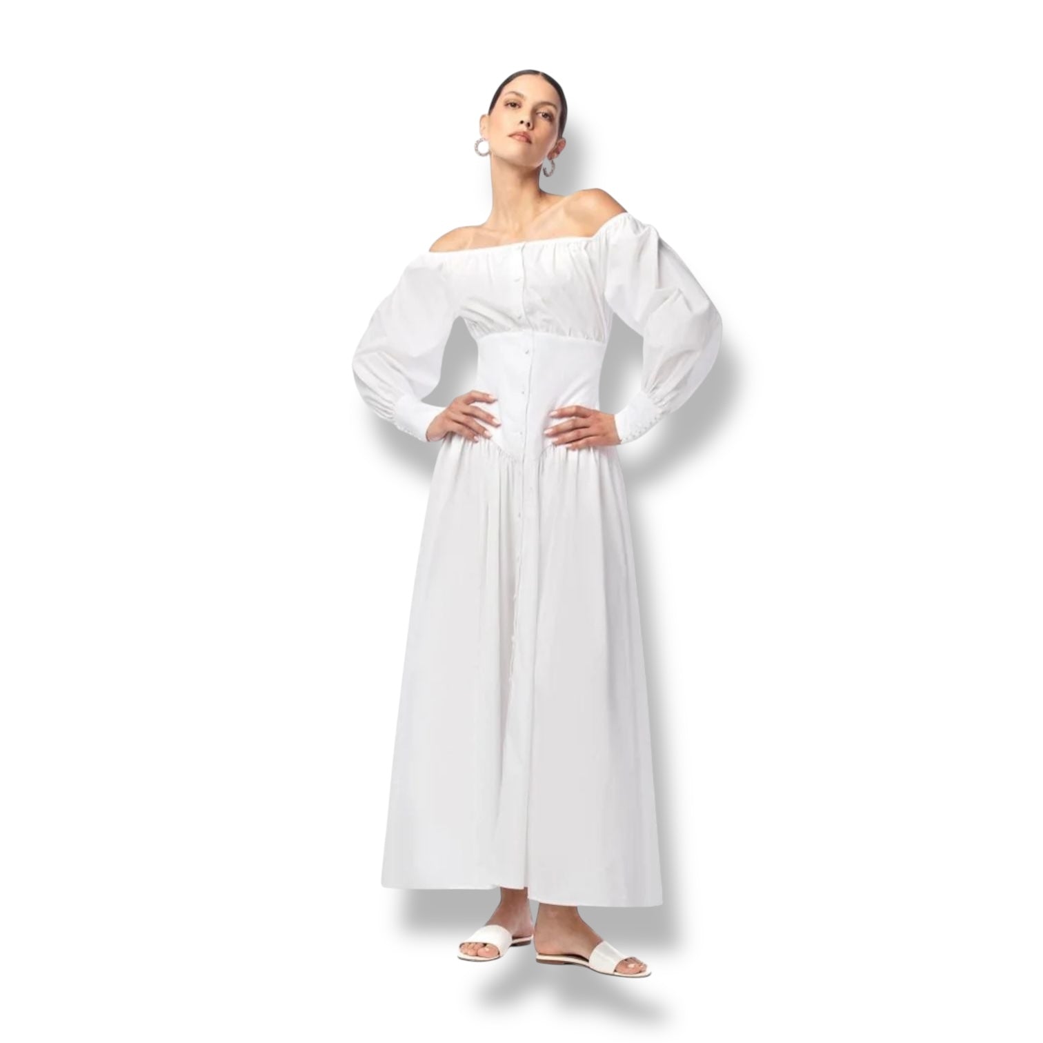 - Long white dress with off-the-shoulder design, front button fastening and wide-cut balloon sleeves.