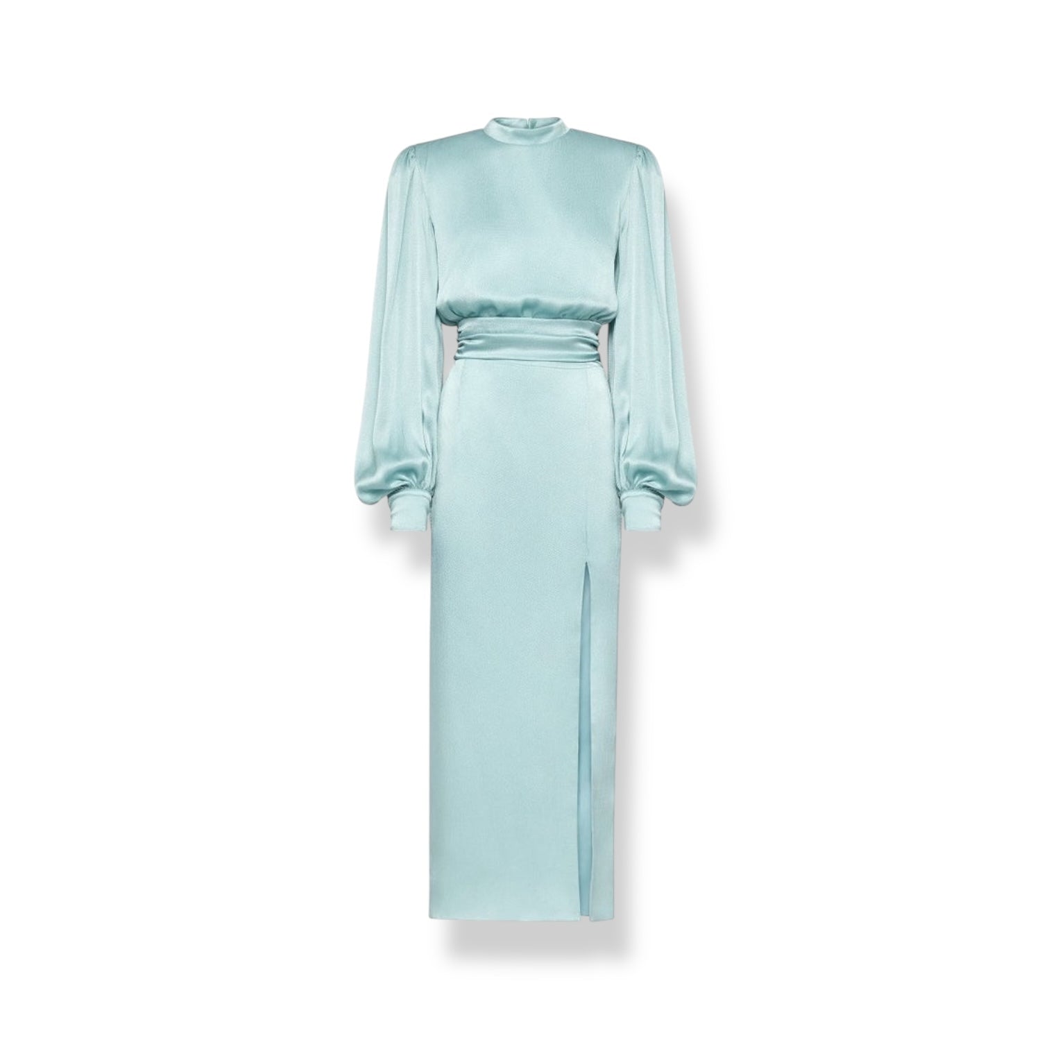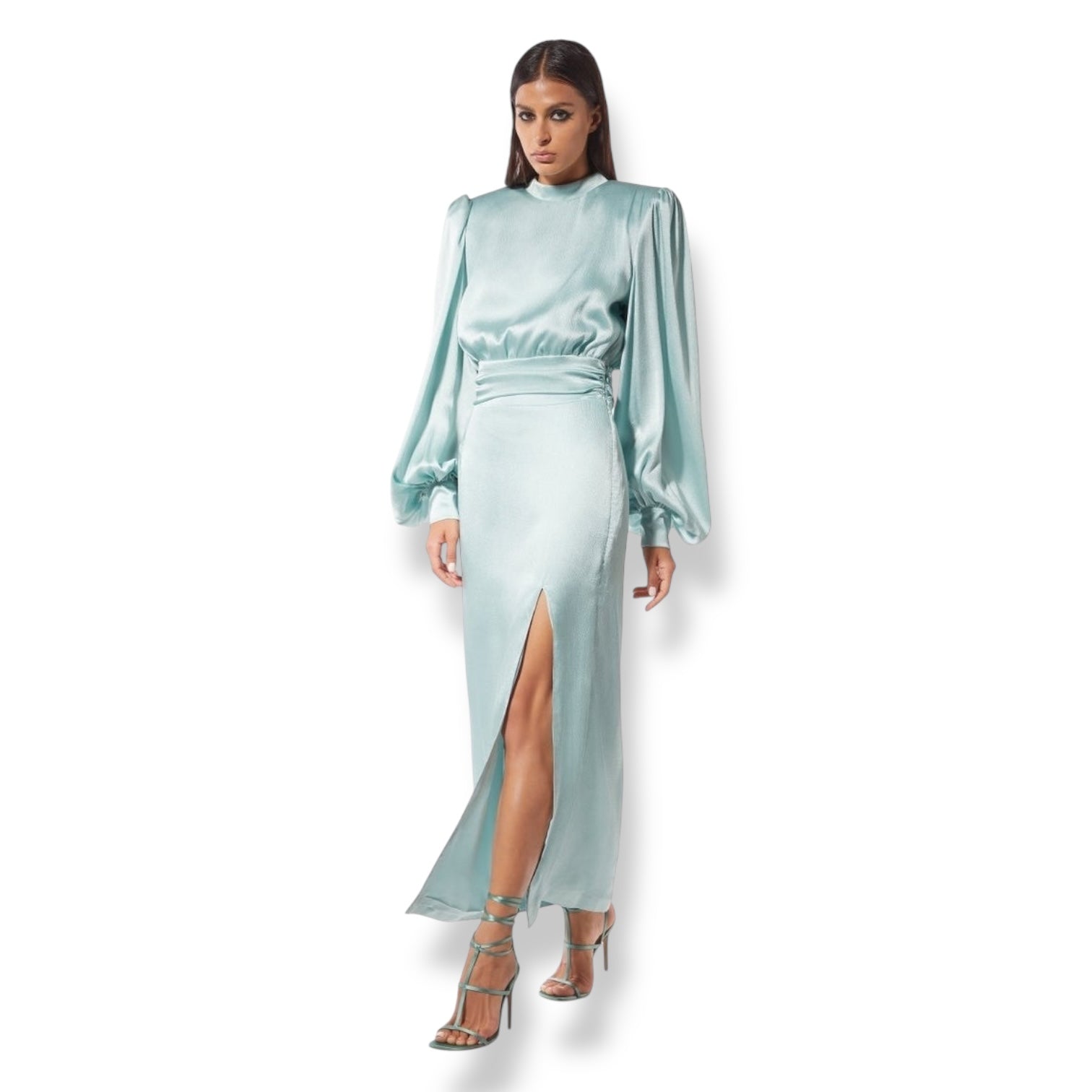 - Details: Long puff sleeves, draped detailing, waistline enhanced by a draped belt, straight skirt with side slit, keyhole back fastening, hidden side zip