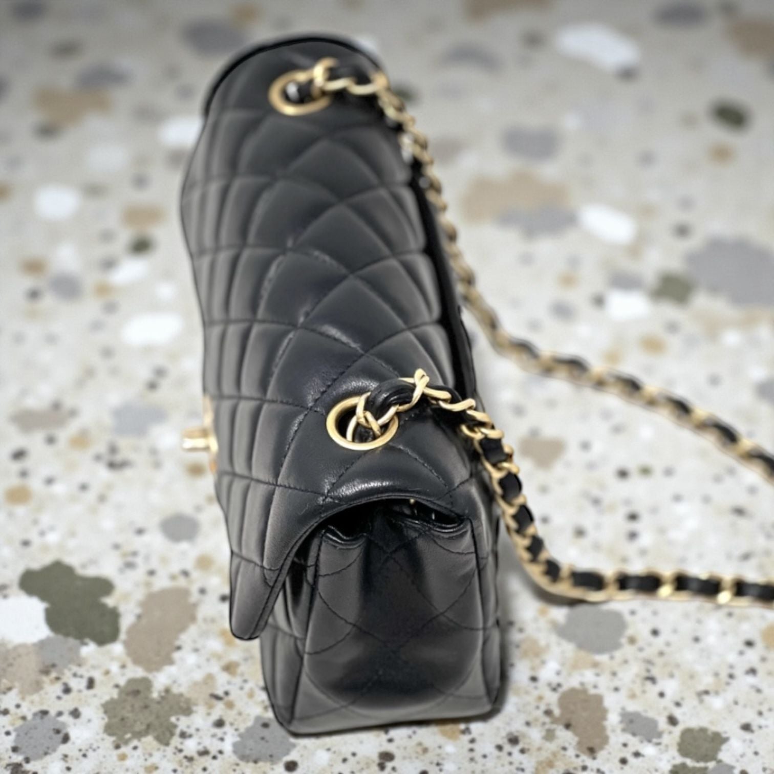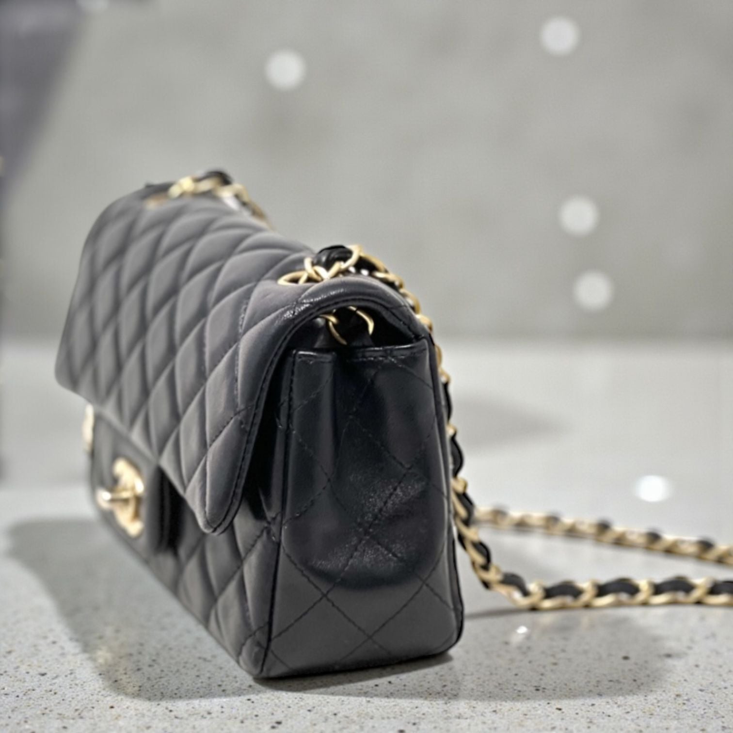 Elegante e iconica, la Chanel Classic Mini in pelle nera trapuntata rappresenta uno dei modelli più amati della Maison. La silhouette compatta e senza tempo è arricchita dalla chiusura CC dorata e dalla caratteristica catena intrecciata in pelle e metallo.