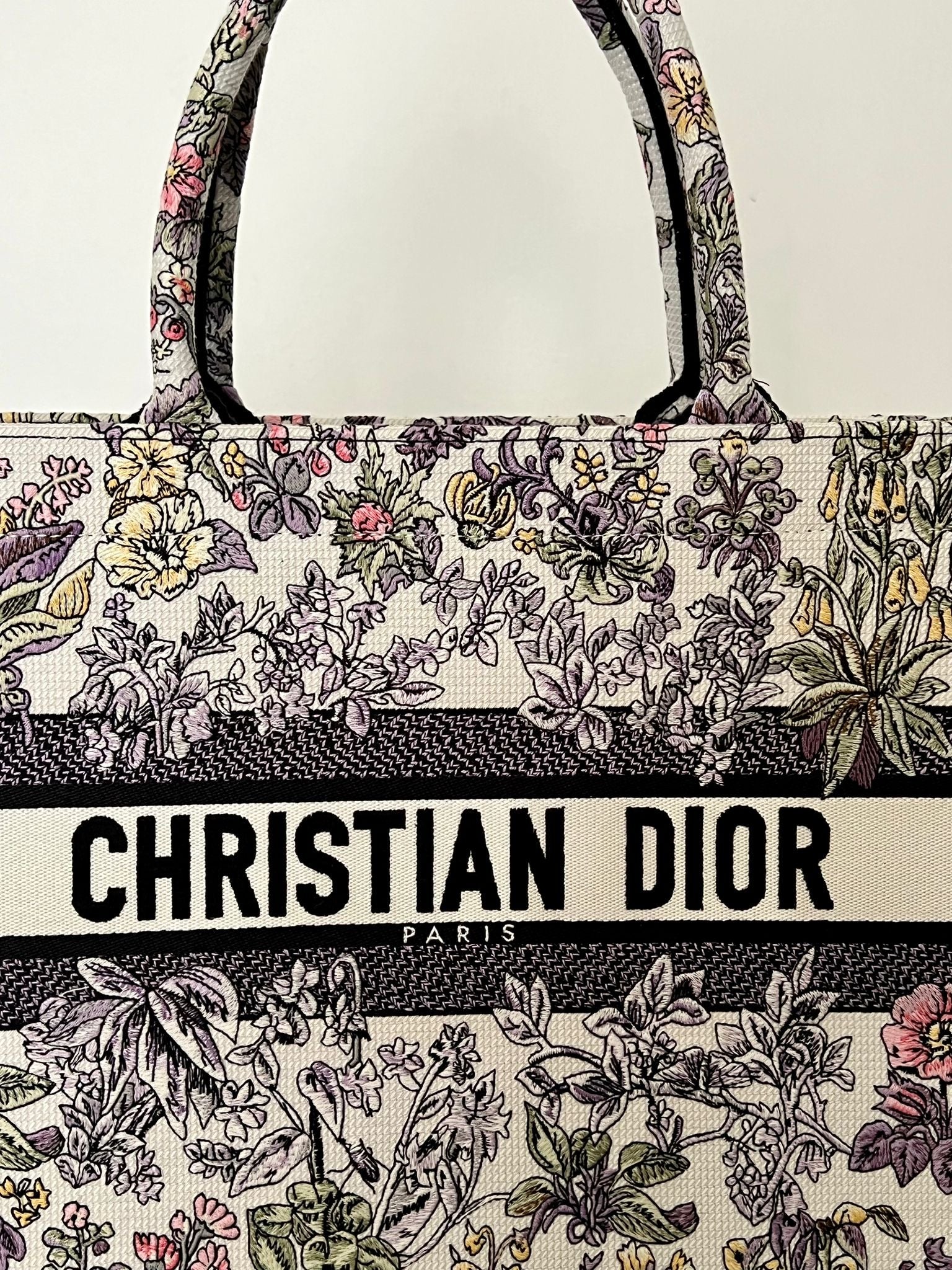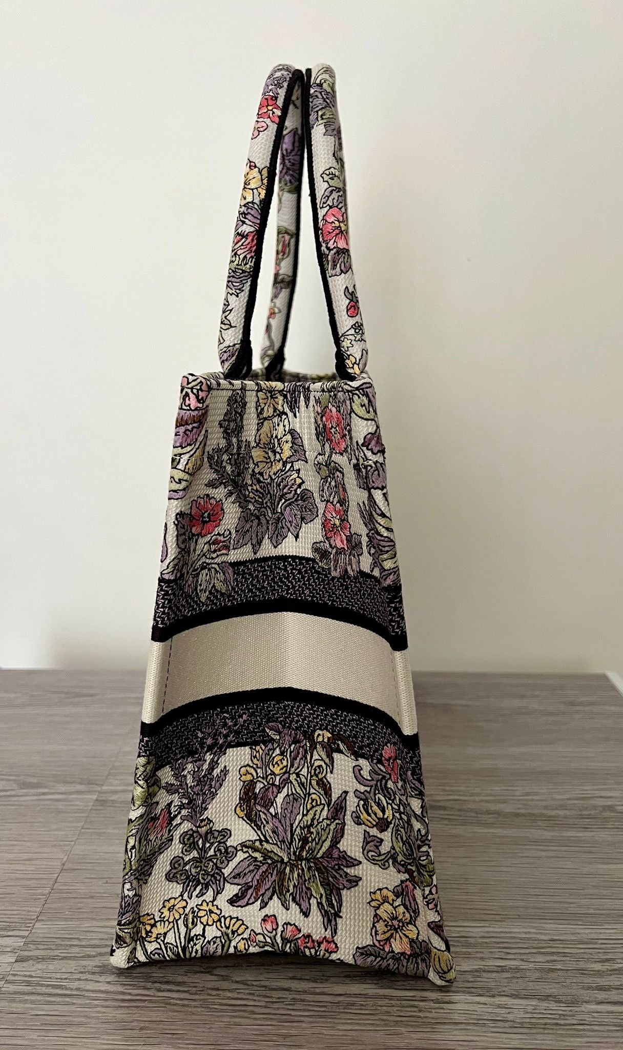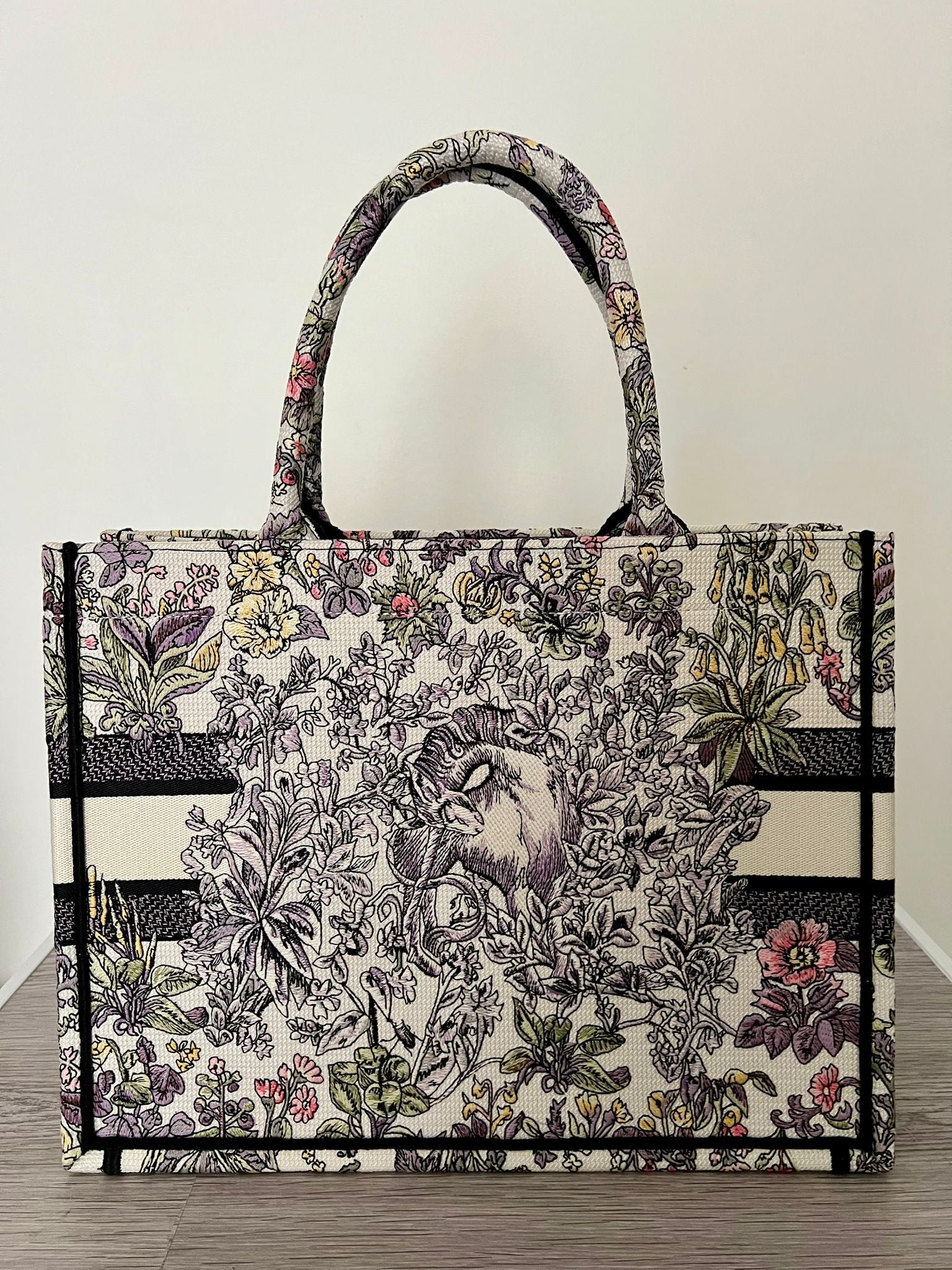 The Dior Book Tote medium is an iconic bag featuring a structured silhouette and the famous ecru and gray Toile de Jouy embroidery that embellishes every detail. The motif, featuring stylized animals and trees, highlights Dior's craftsmanship, combining elegance and functionality.
