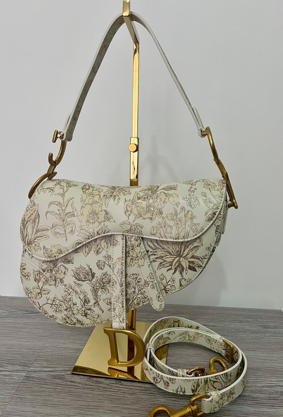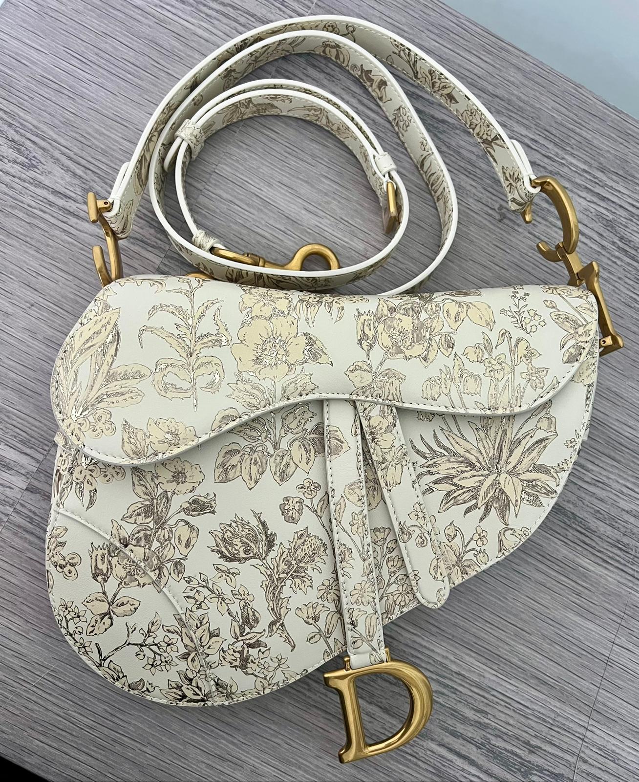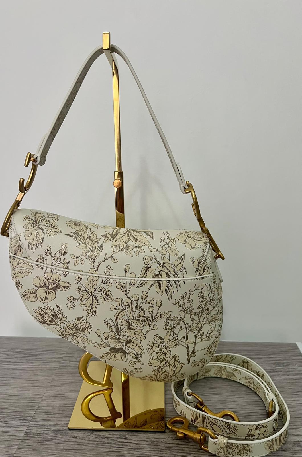 Elegant shoulder bag in milky white calfskin , embellished with a raised beige millefiori motif . Soft lines and a saddle silhouette for a refined look, perfect from day to night.