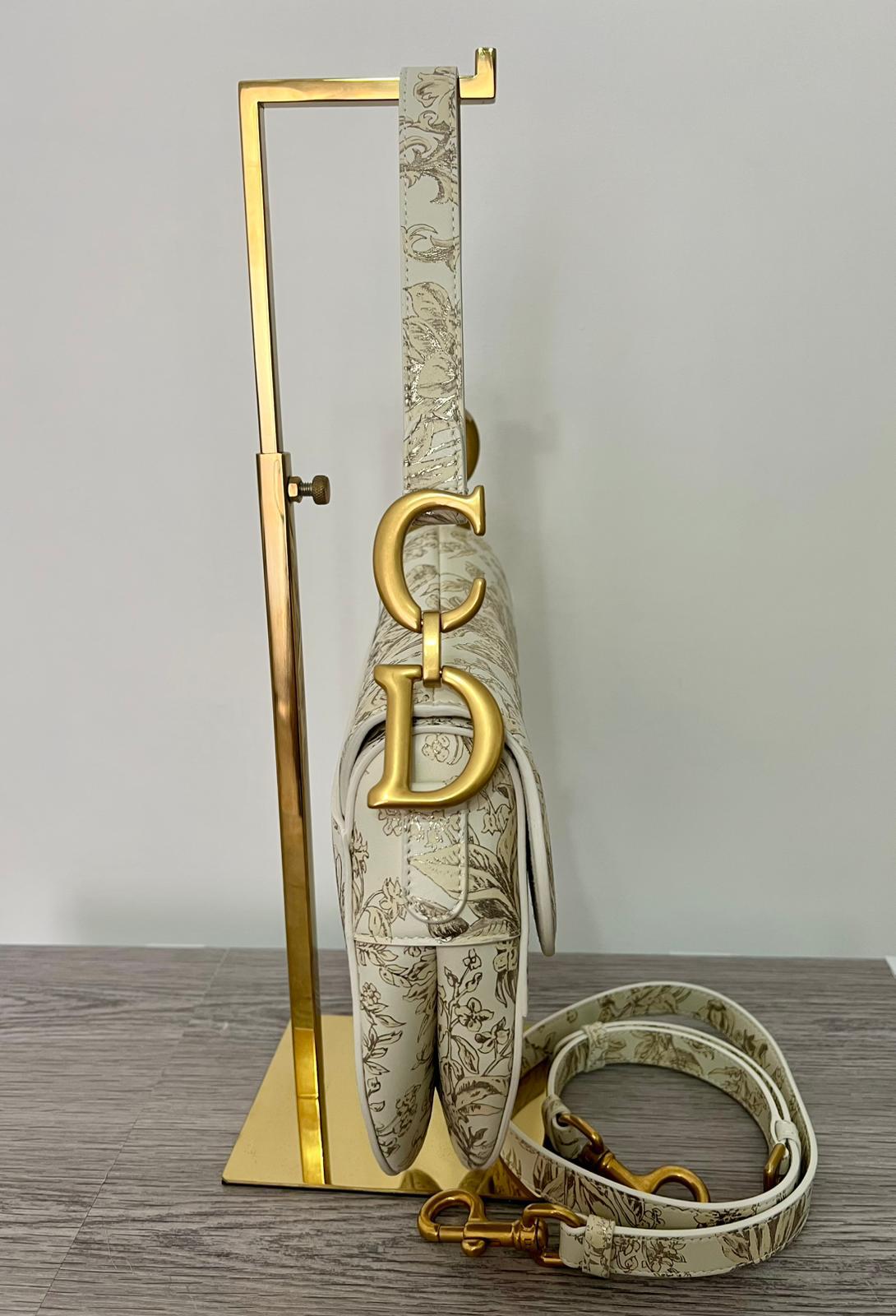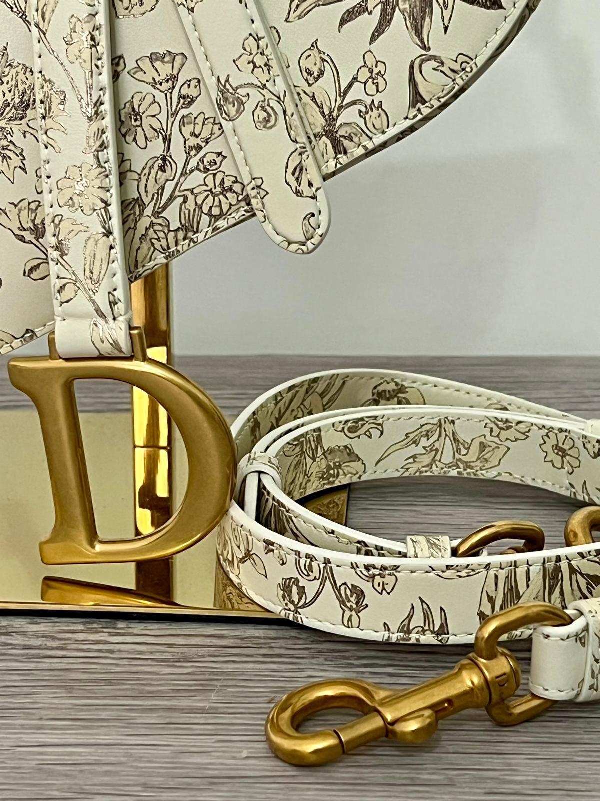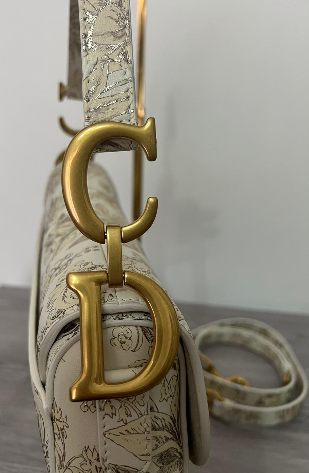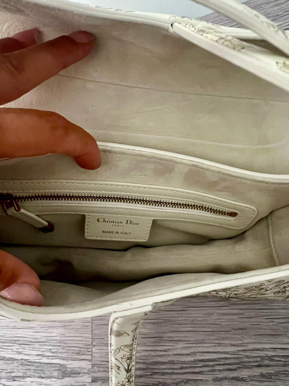 Elegant shoulder bag in milky white calfskin , embellished with a raised beige millefiori motif . Soft lines and a saddle silhouette for a refined look, perfect from day to night.