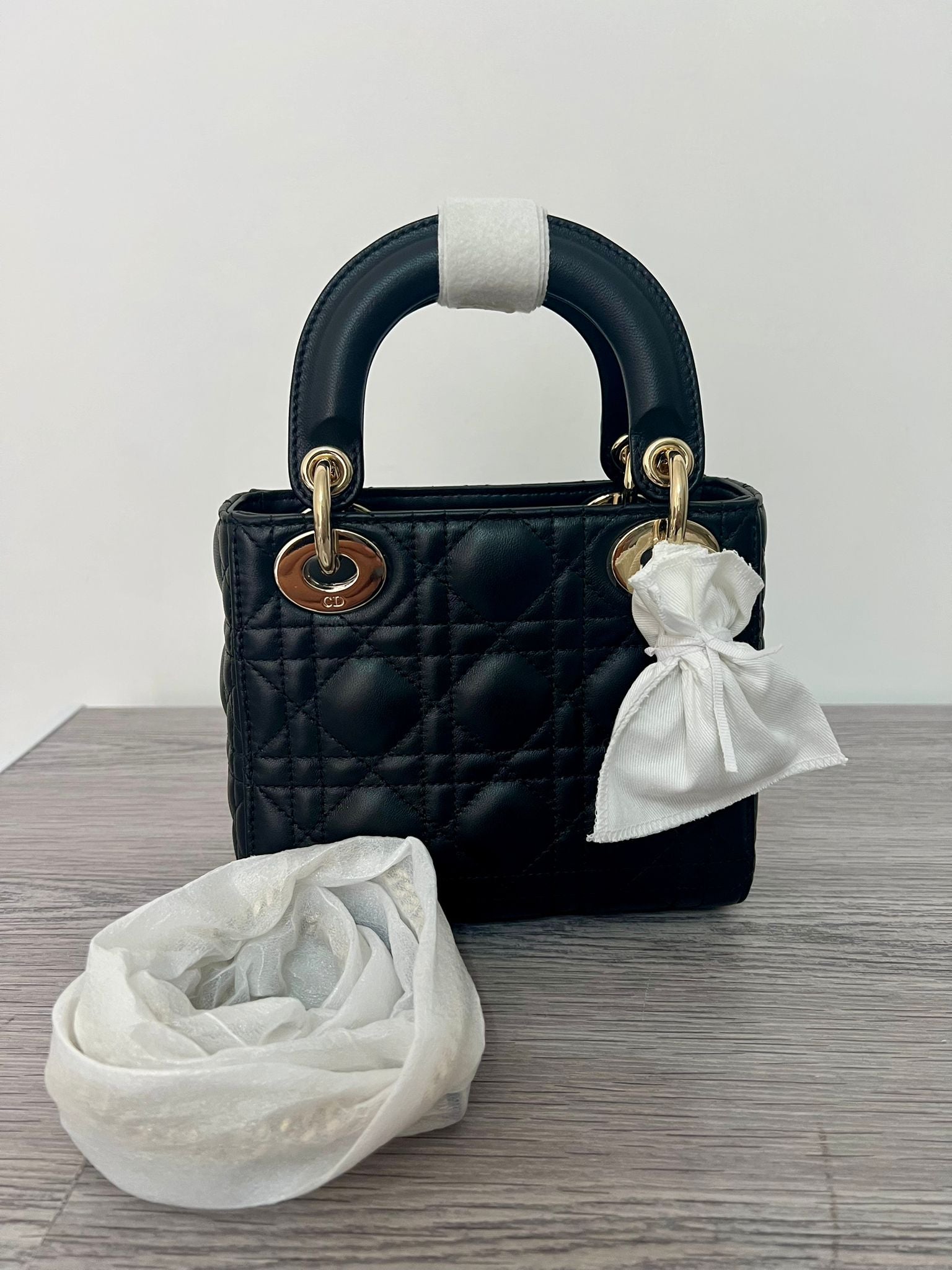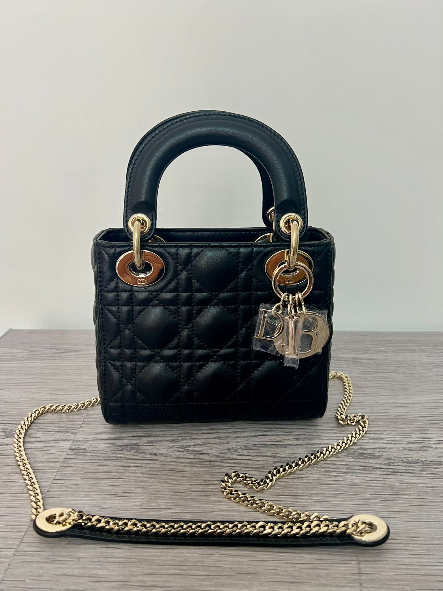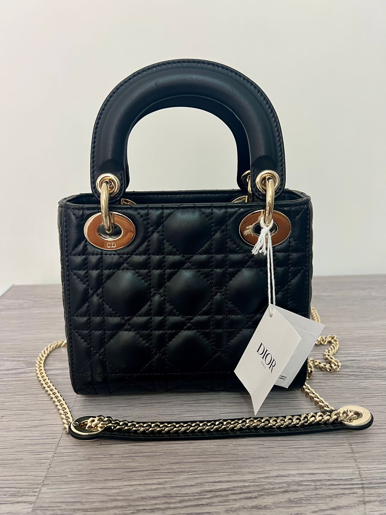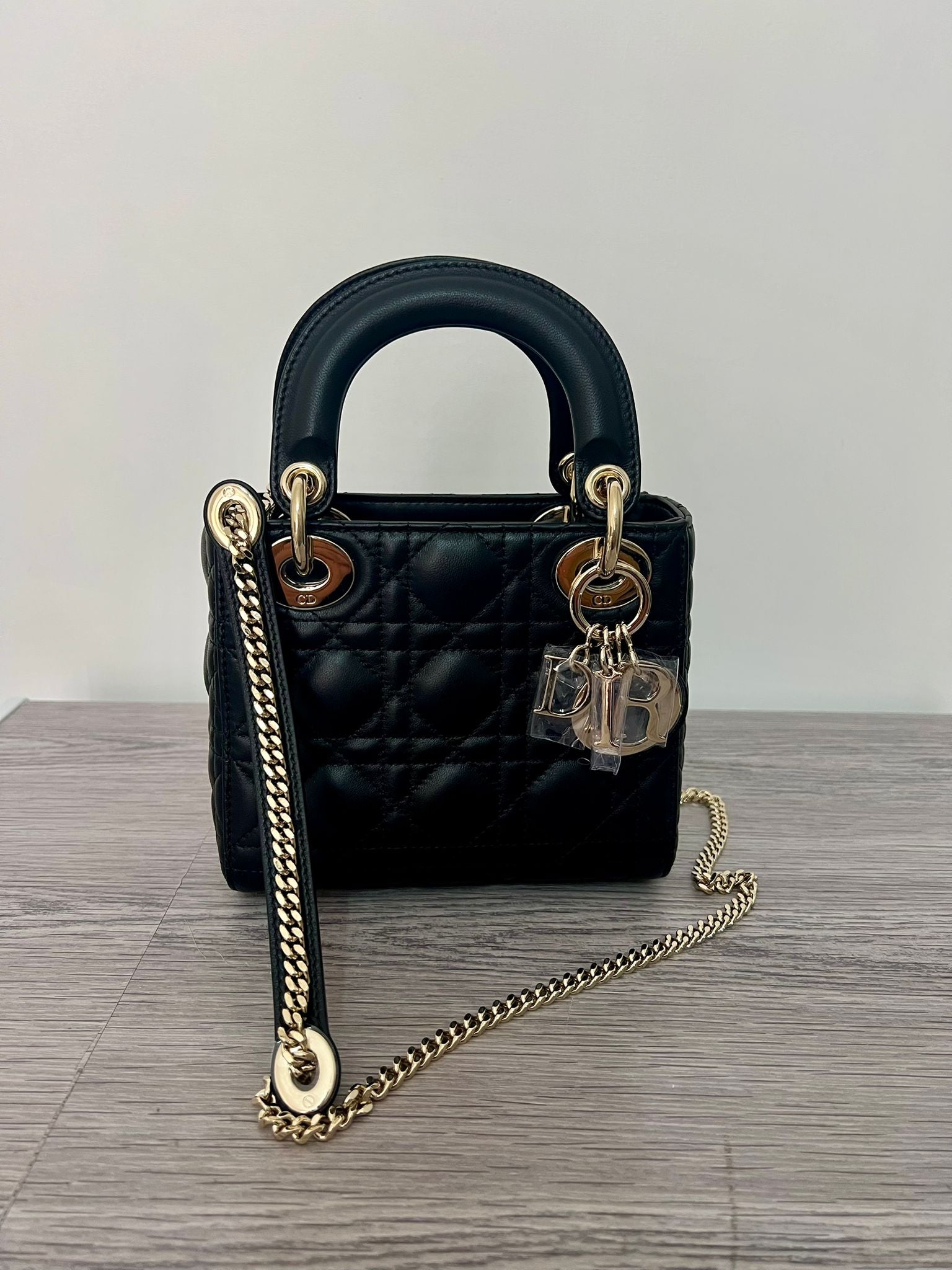 The Mini Lady Dior bag embodies the elegance and craftsmanship of the House of Dior. Crafted from exquisite black lambskin with the iconic Cannage stitching, it is a sophisticated and timeless accessory.