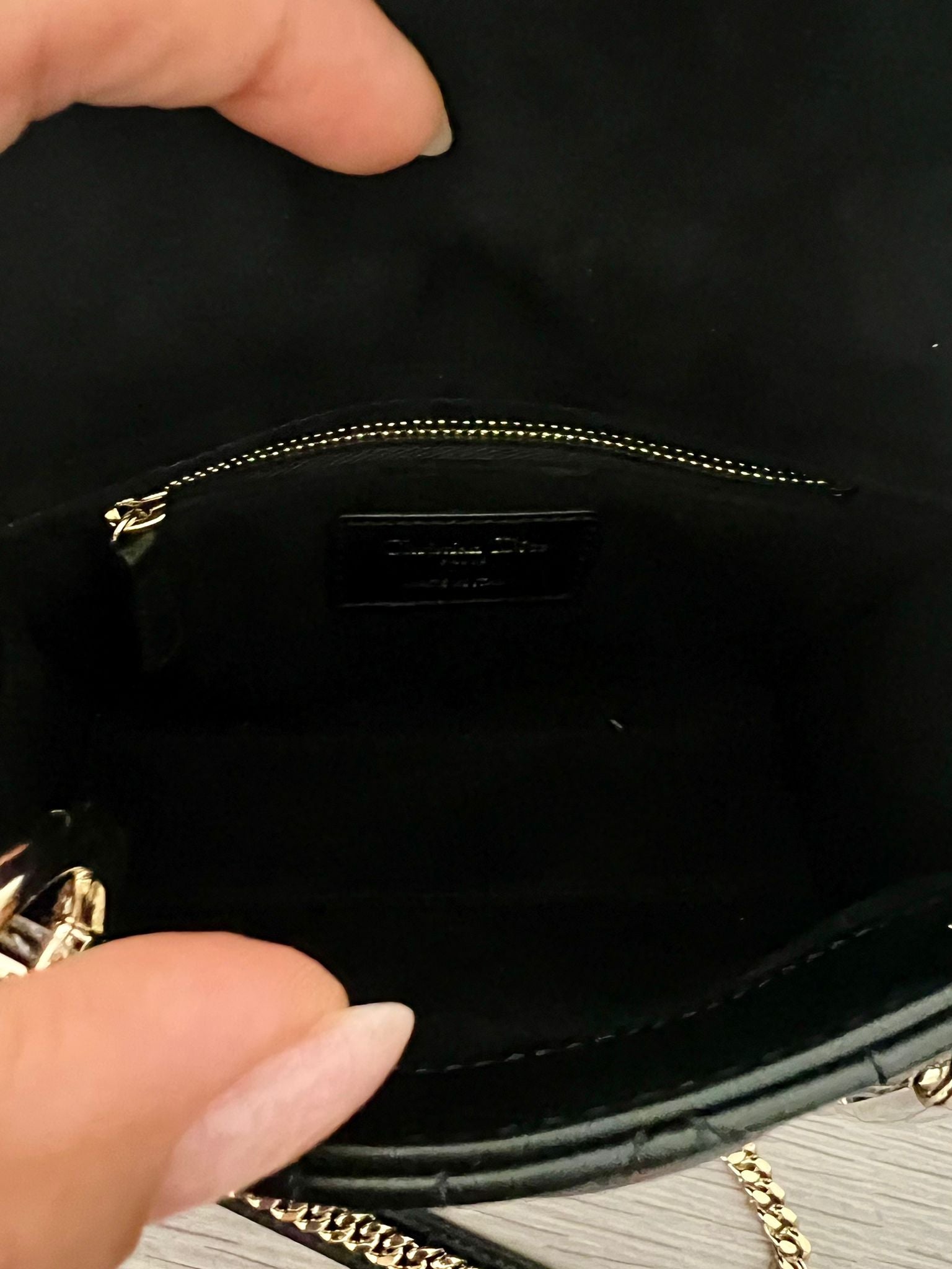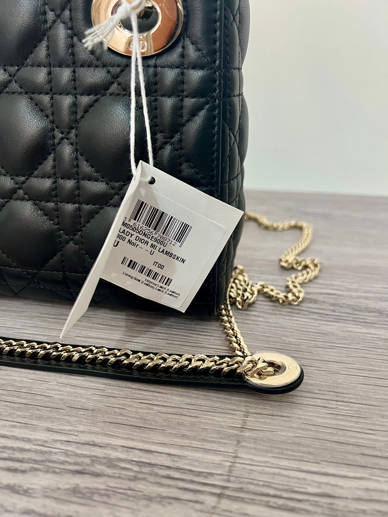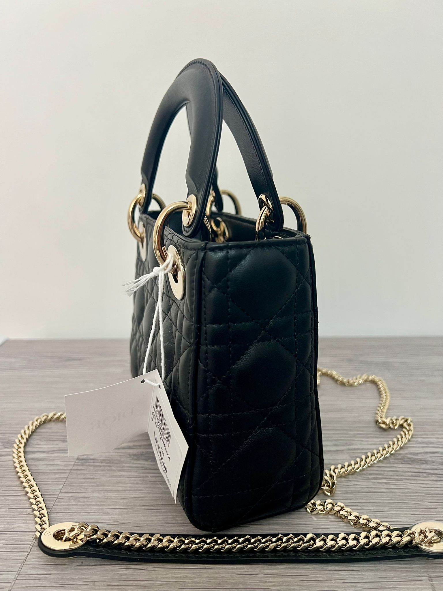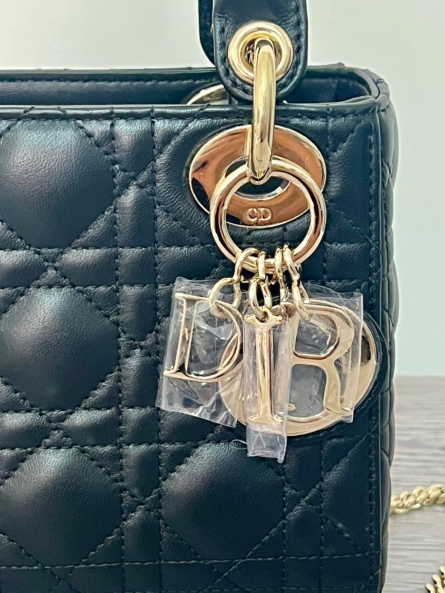 The Mini Lady Dior bag embodies the elegance and craftsmanship of the House of Dior. Crafted from exquisite black lambskin with the iconic Cannage stitching, it is a sophisticated and timeless accessory.
