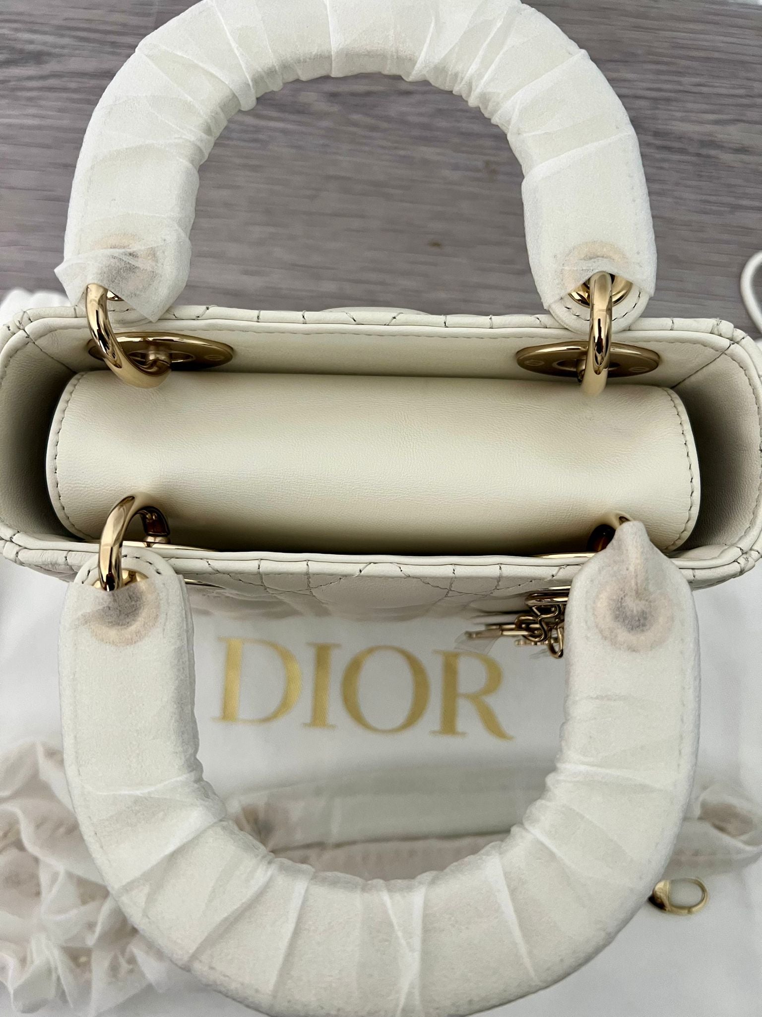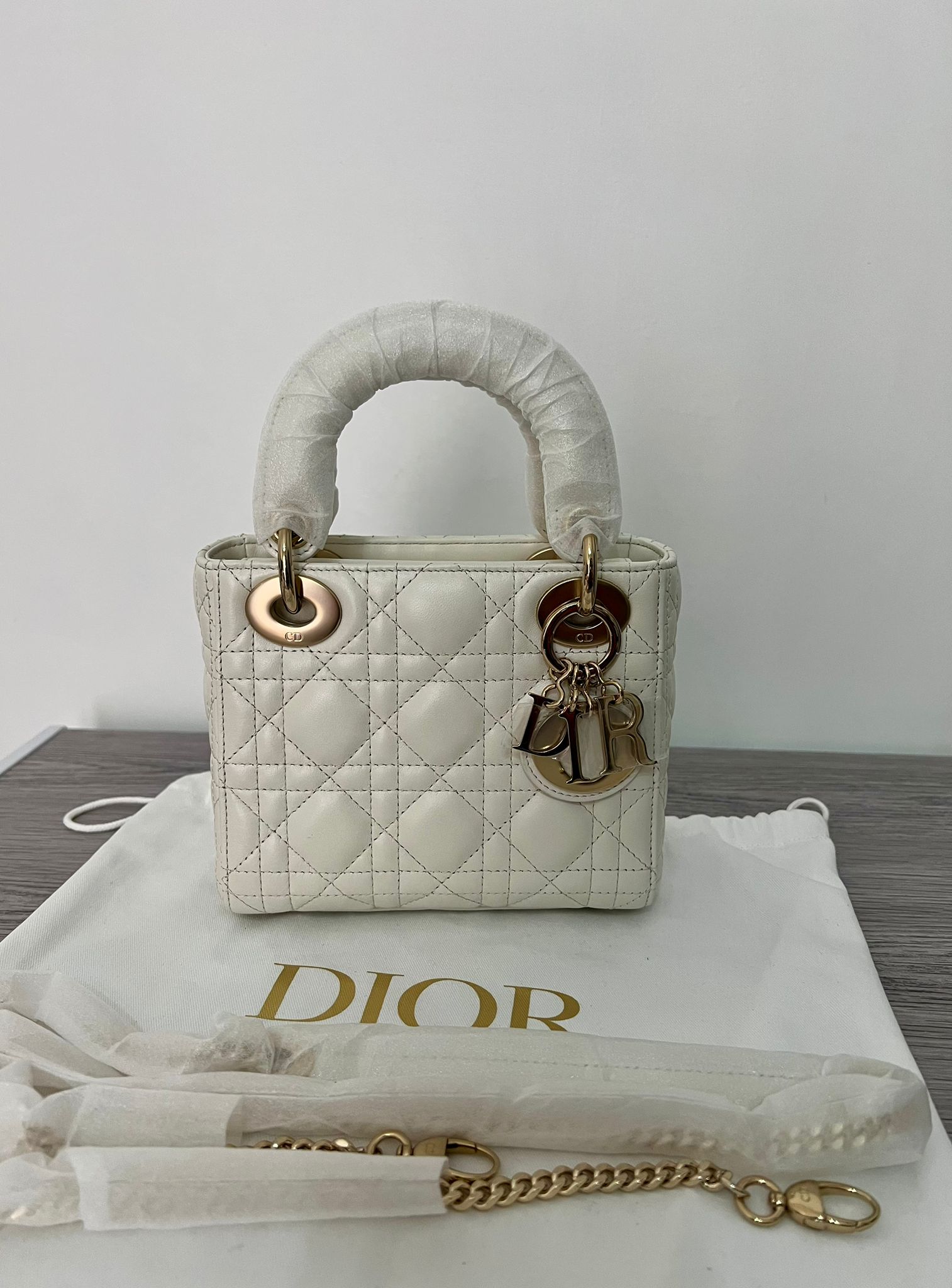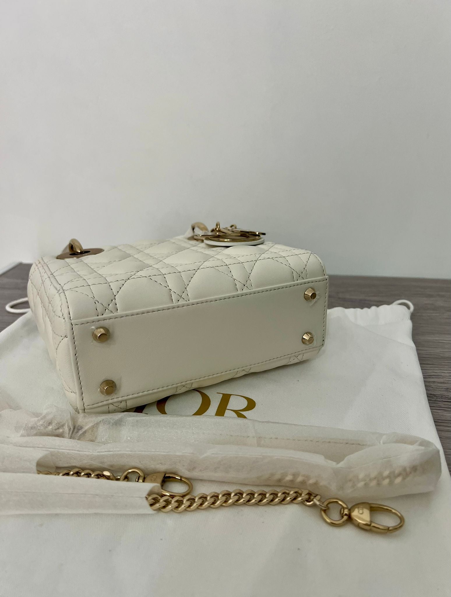 The Mini Lady Dior bag embodies the elegance and craftsmanship of the House of Dior. Crafted from exquisite white lambskin with the iconic Cannage stitching, it is a sophisticated and timeless accessory.