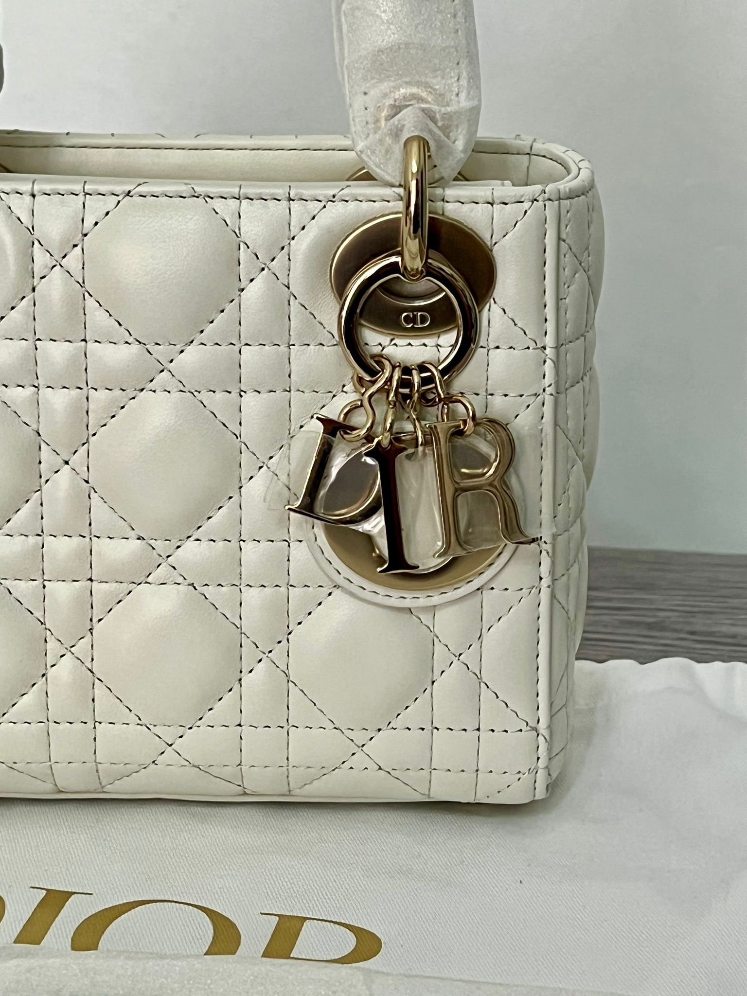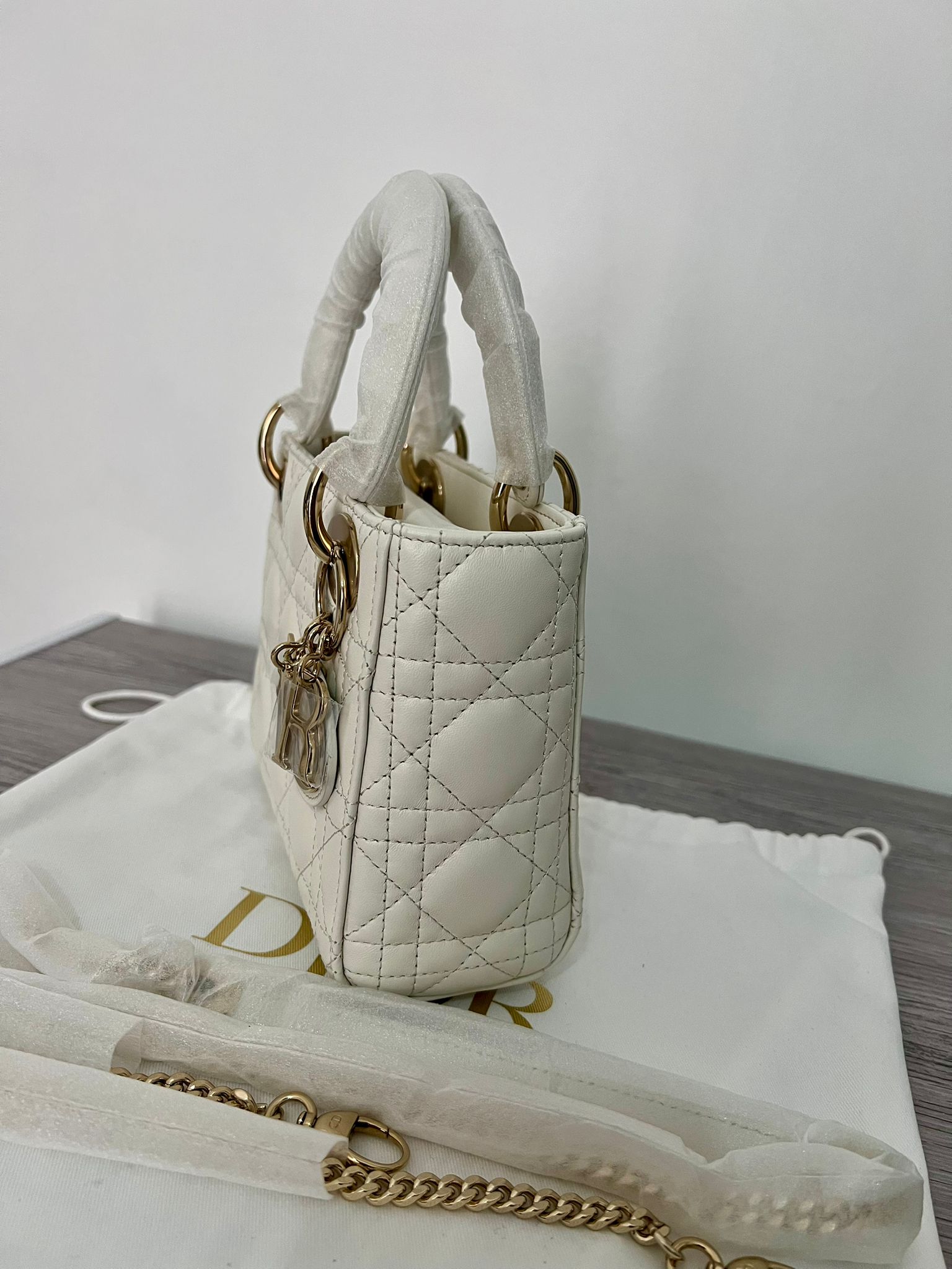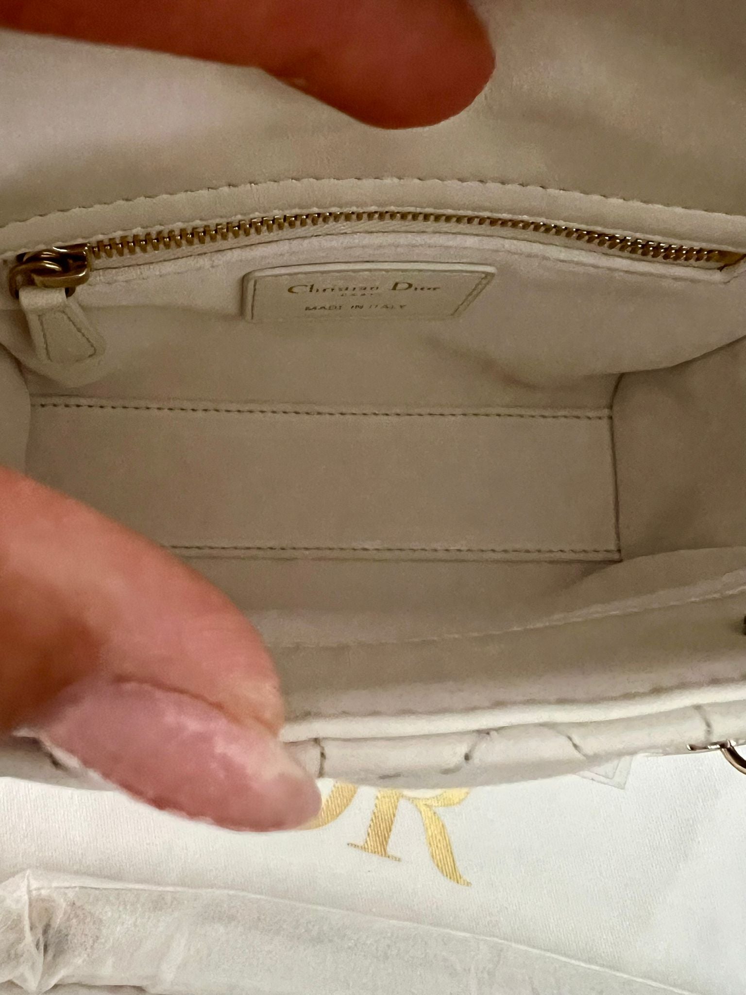 The Mini Lady Dior bag embodies the elegance and craftsmanship of the House of Dior. Crafted from exquisite white lambskin with the iconic Cannage stitching, it is a sophisticated and timeless accessory.
