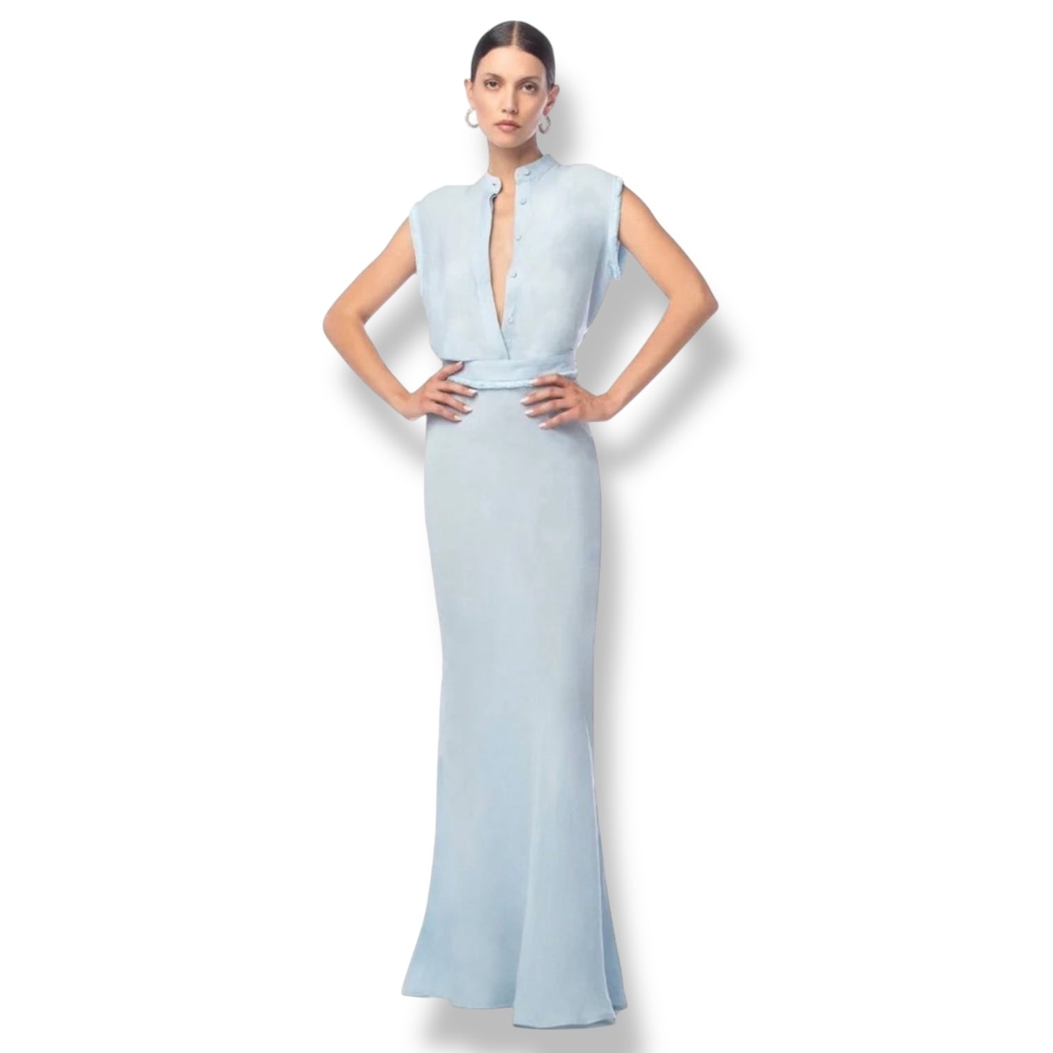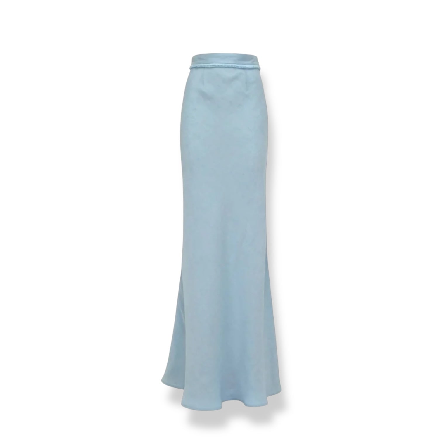 Introducing the MVP maxi skirt in a delicate shade of blue, a piece that combines elegance and versatility. This long skirt stands out for its linear and sophisticated design, perfect for creating refined and trendy looks.