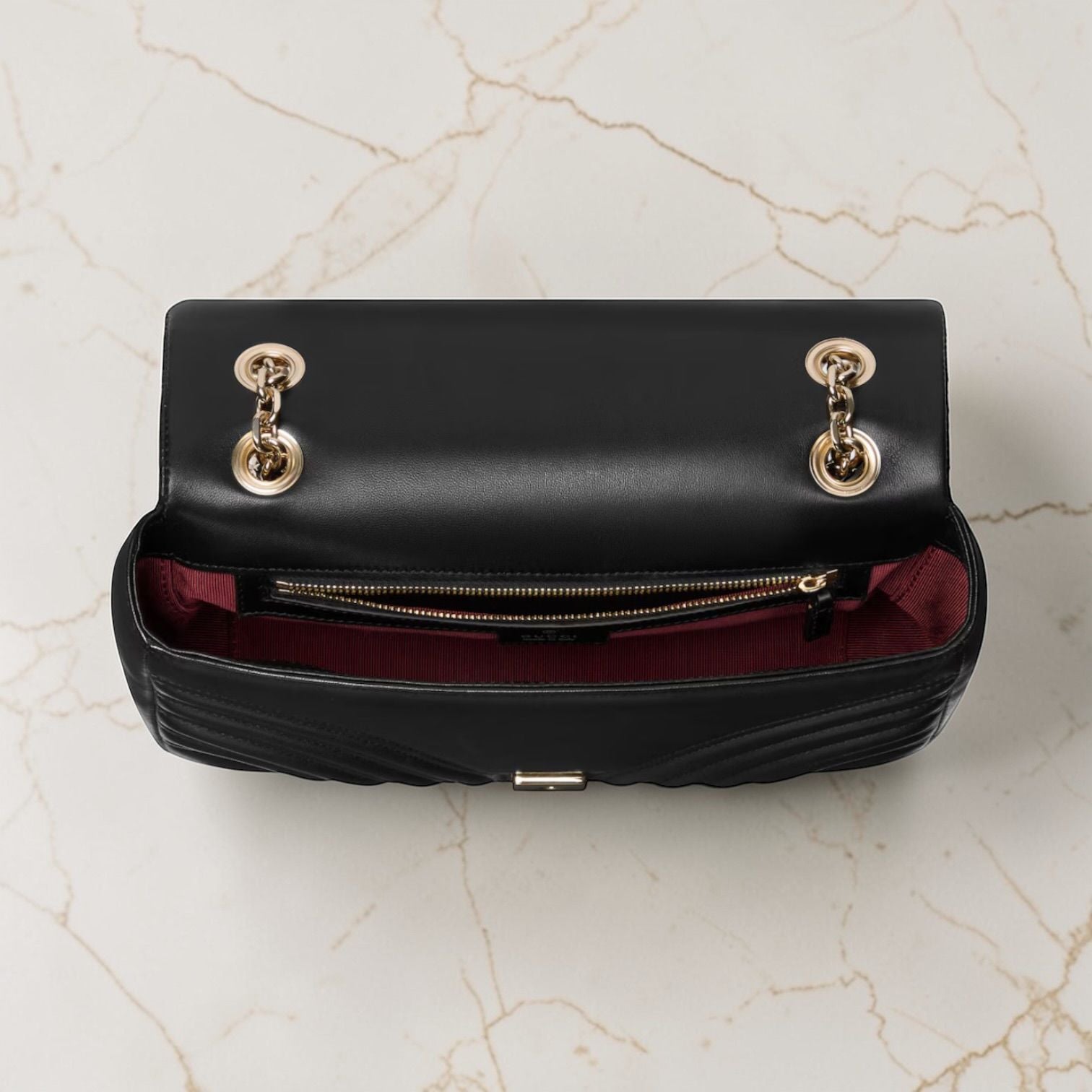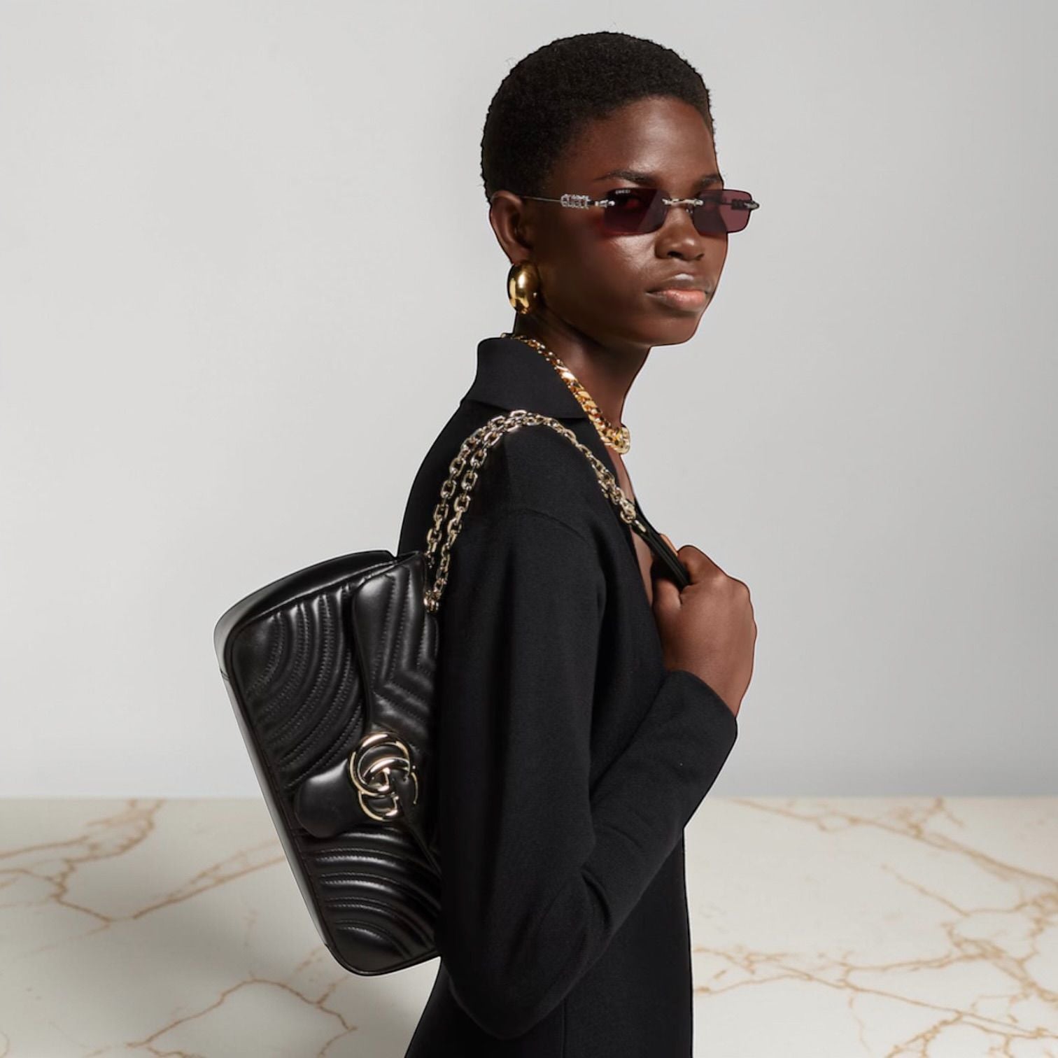 La Gucci GG Marmont è una delle borse più iconiche della Maison, caratterizzata da un’eleganza senza tempo e da un design sofisticato. Realizzata in pelle di agnello matelassé nera con motivo chevron, unisce stile e funzionalità, rendendola perfetta per ogni occasione.