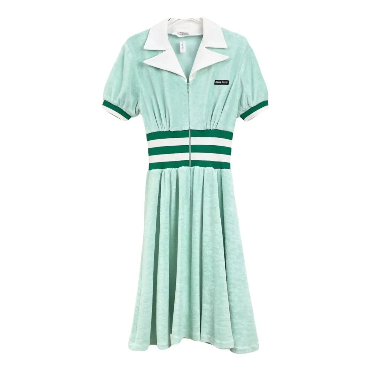 This elegant Miu Miu mid-length dress is crafted from soft, high-quality cotton. Its mid-calf cut makes it perfect for a feminine and sophisticated look. The vibrant green color adds a touch of personality, making it ideal for both casual days and semi-formal occasions. The fit is designed to flatter the figure while maintaining comfort and style.