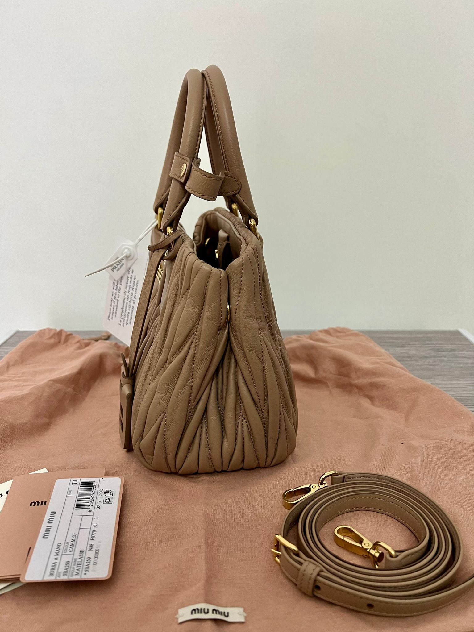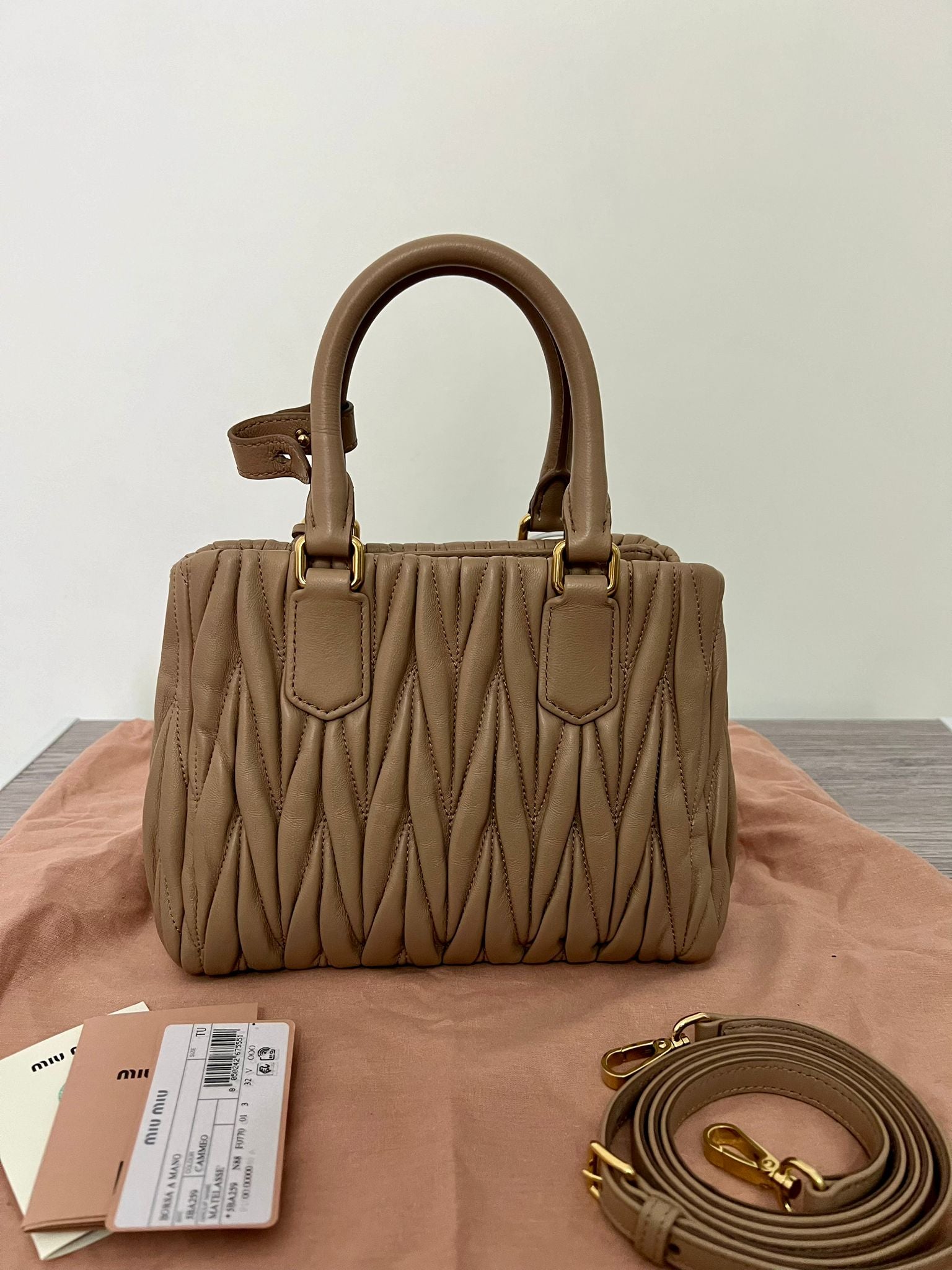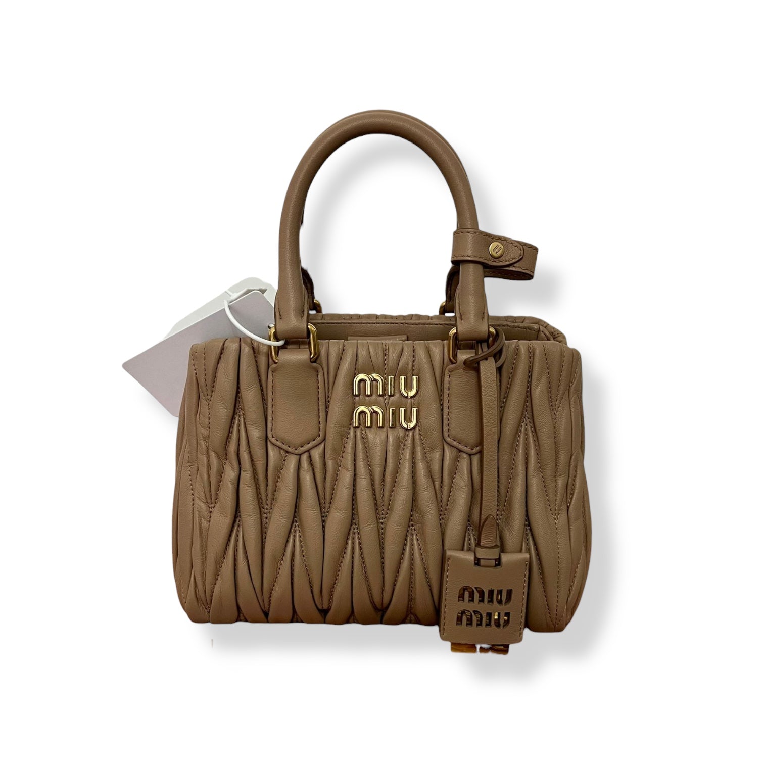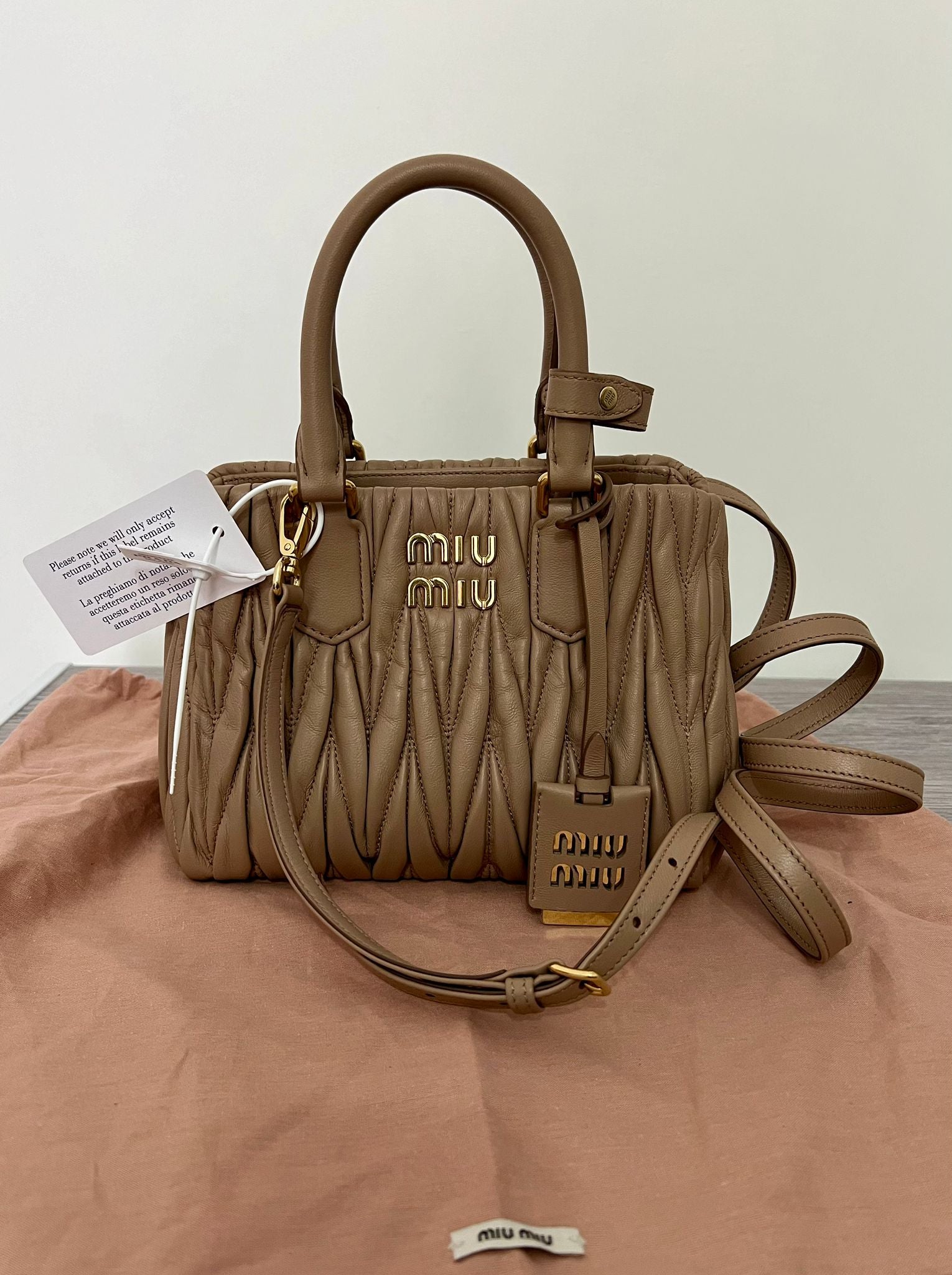 The Miu Miu Arcadie bag is a refined accessory in quilted nappa leather, featuring an iconic design that creates a three-dimensional effect and a soft texture. The caramel color enhances its elegance and versatility, making it ideal for both day and evening.