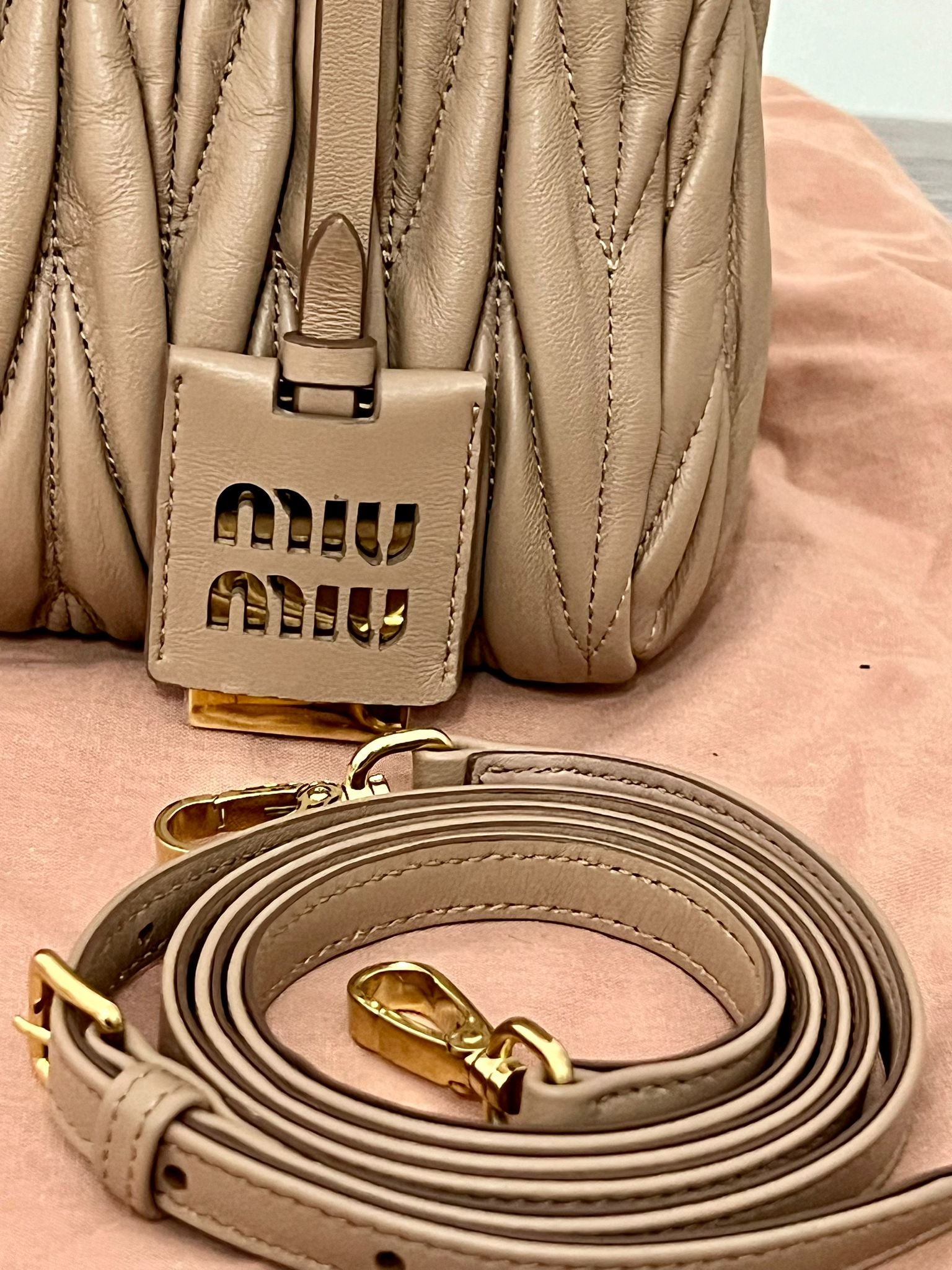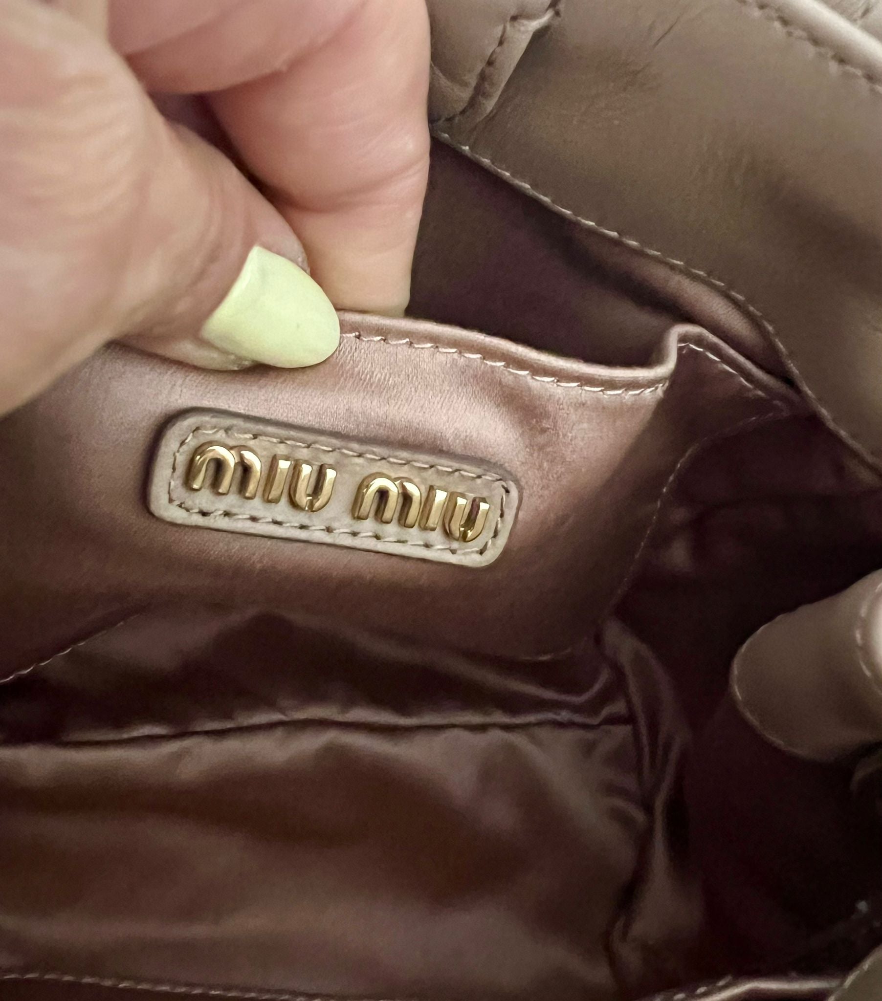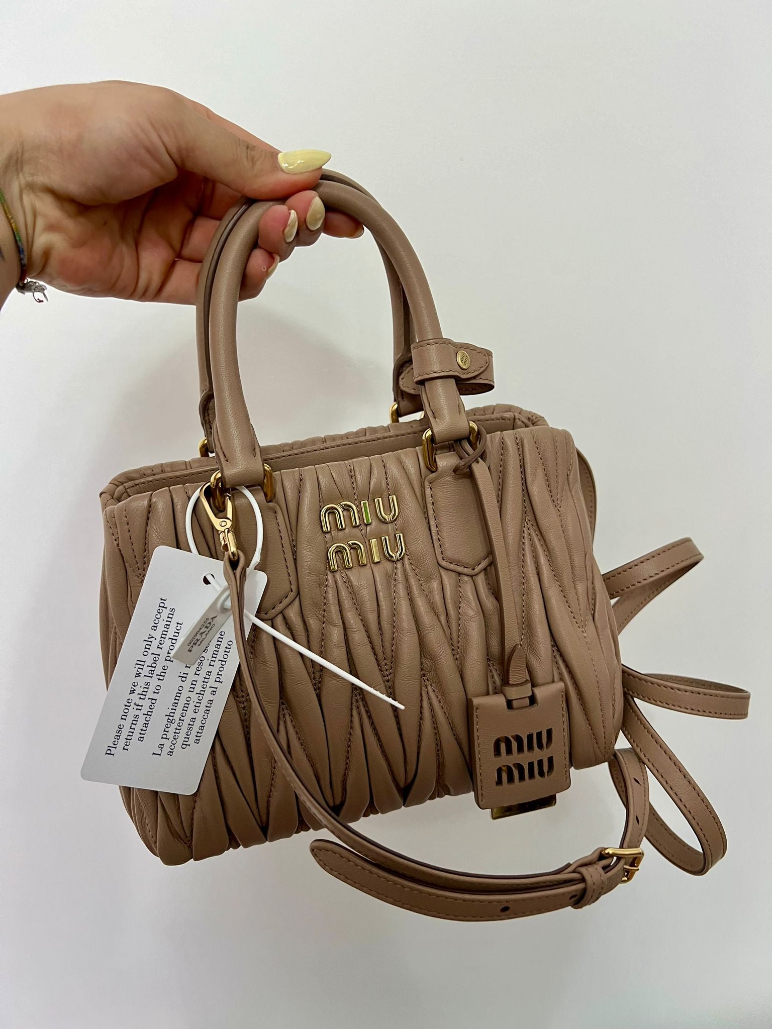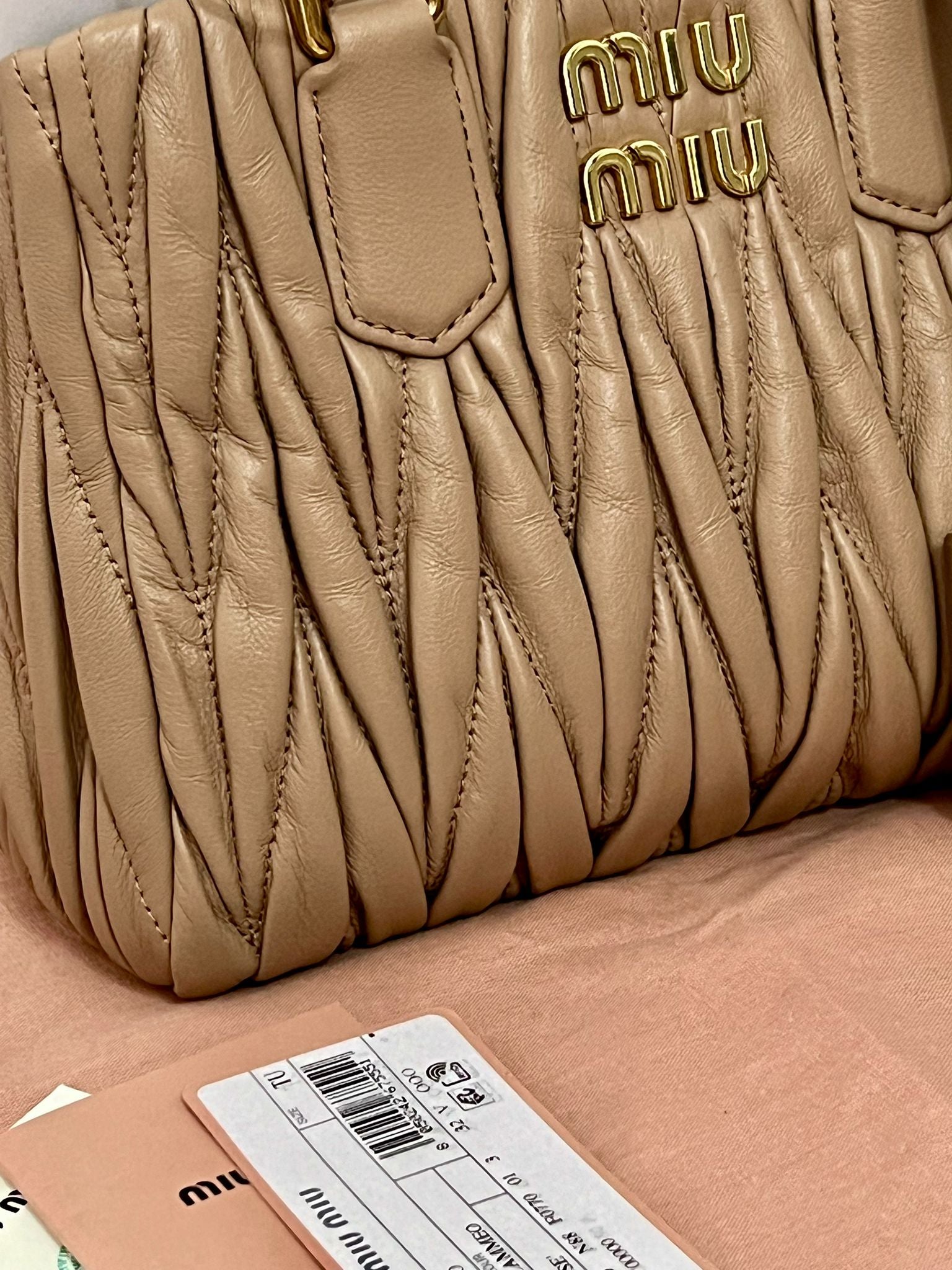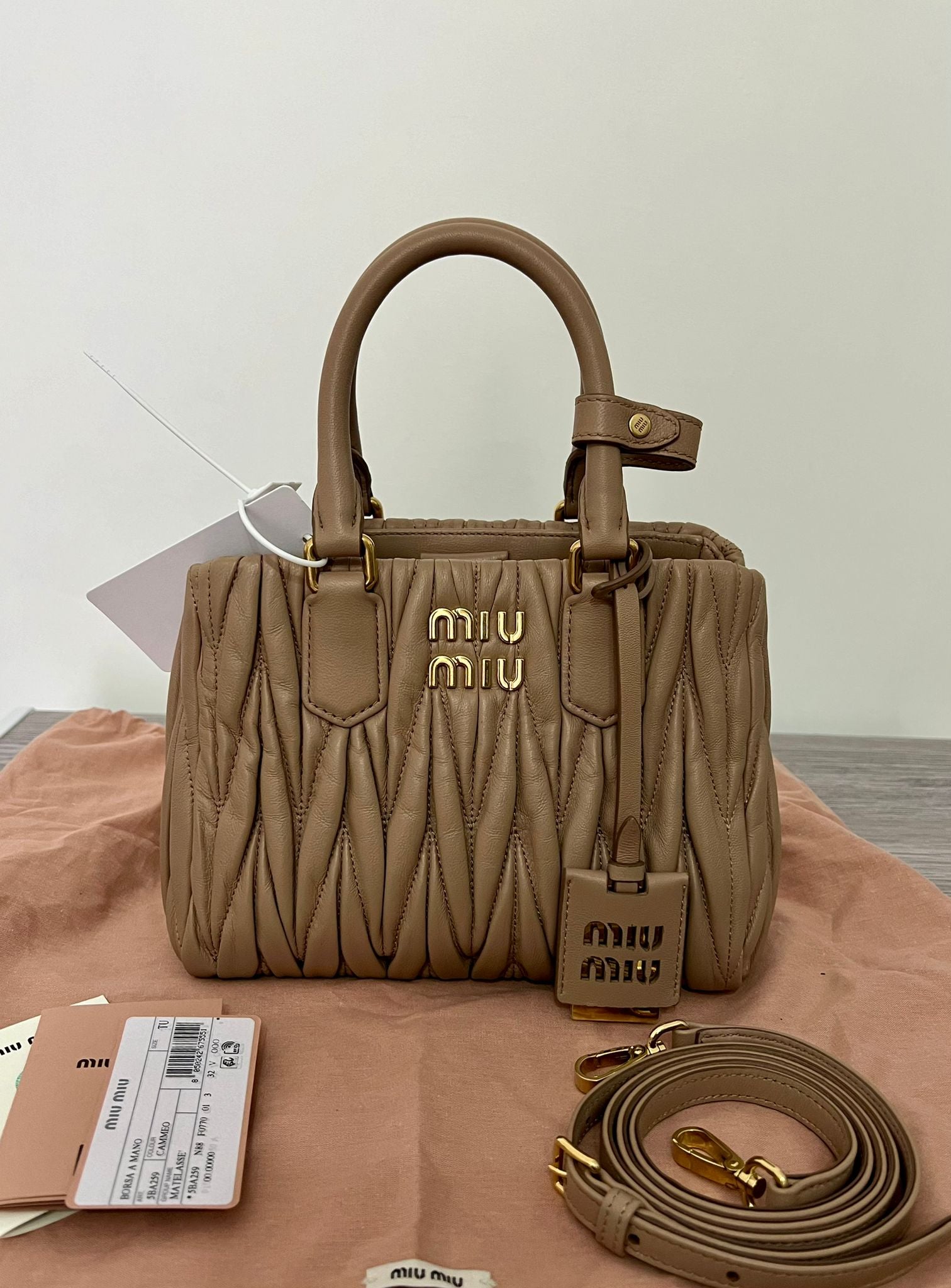 The Miu Miu Arcadie bag is a refined accessory in quilted nappa leather, featuring an iconic design that creates a three-dimensional effect and a soft texture. The caramel color enhances its elegance and versatility, making it ideal for both day and evening.