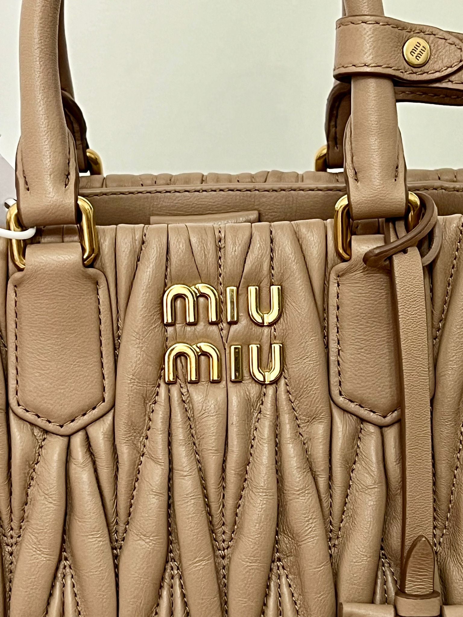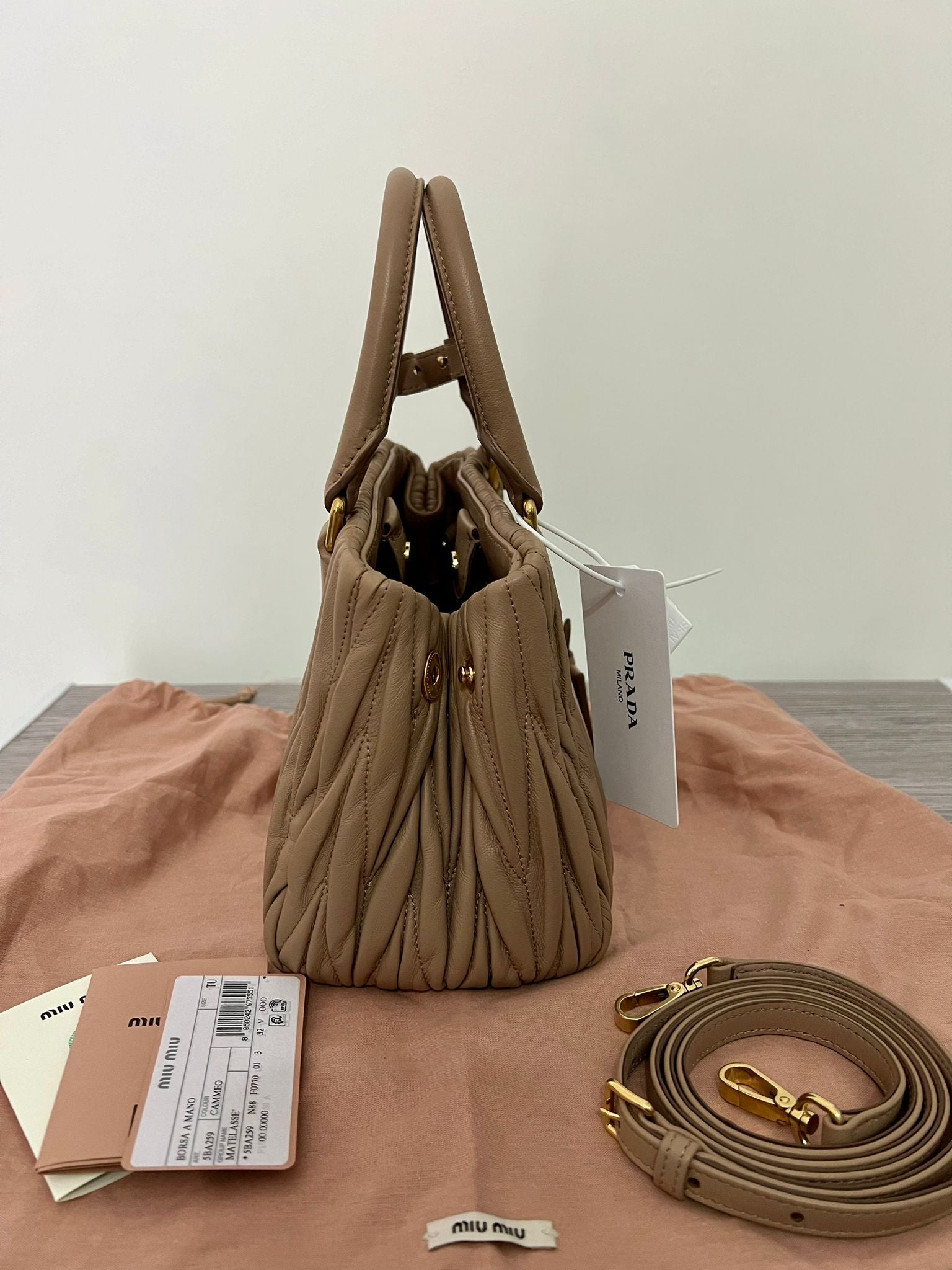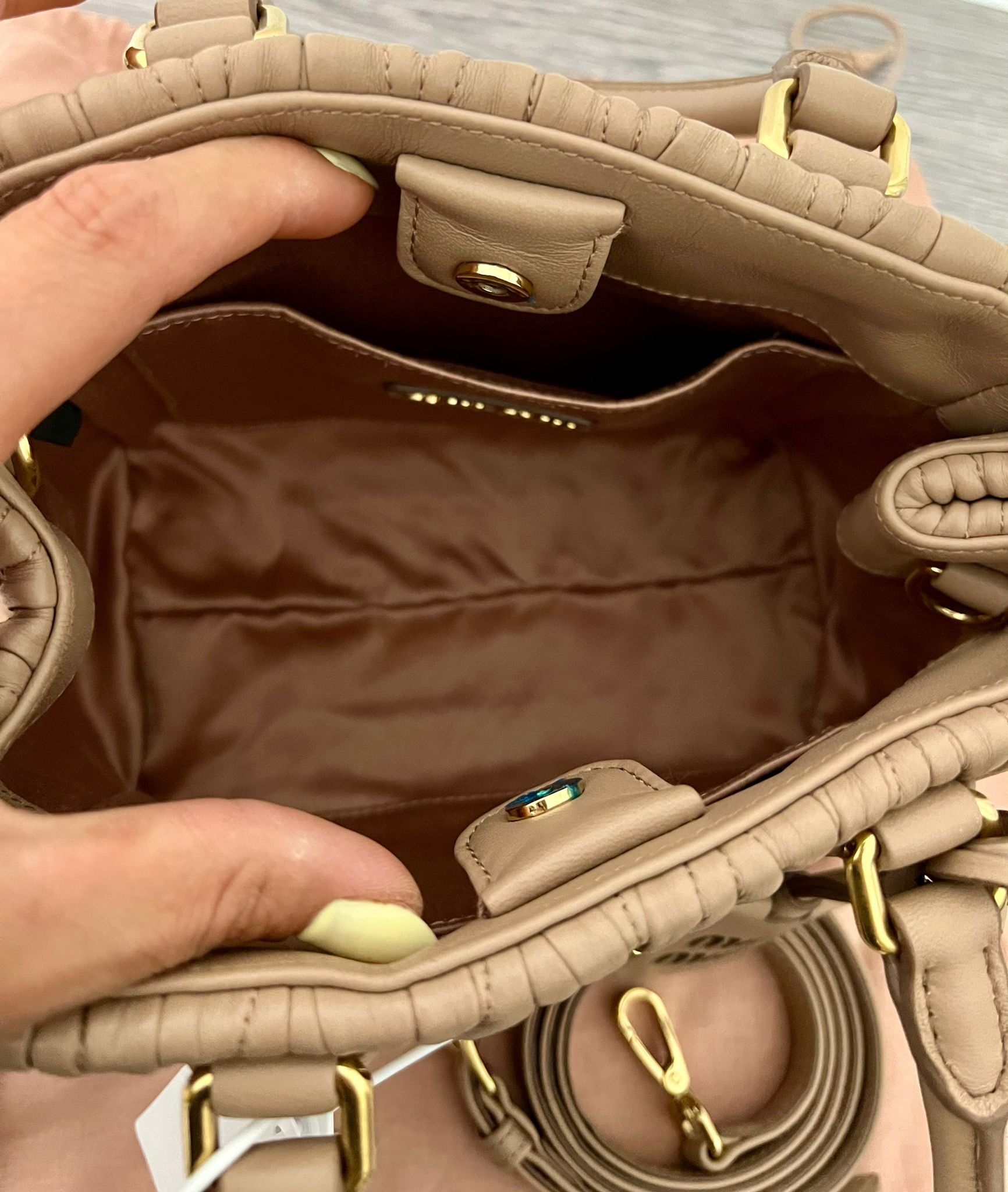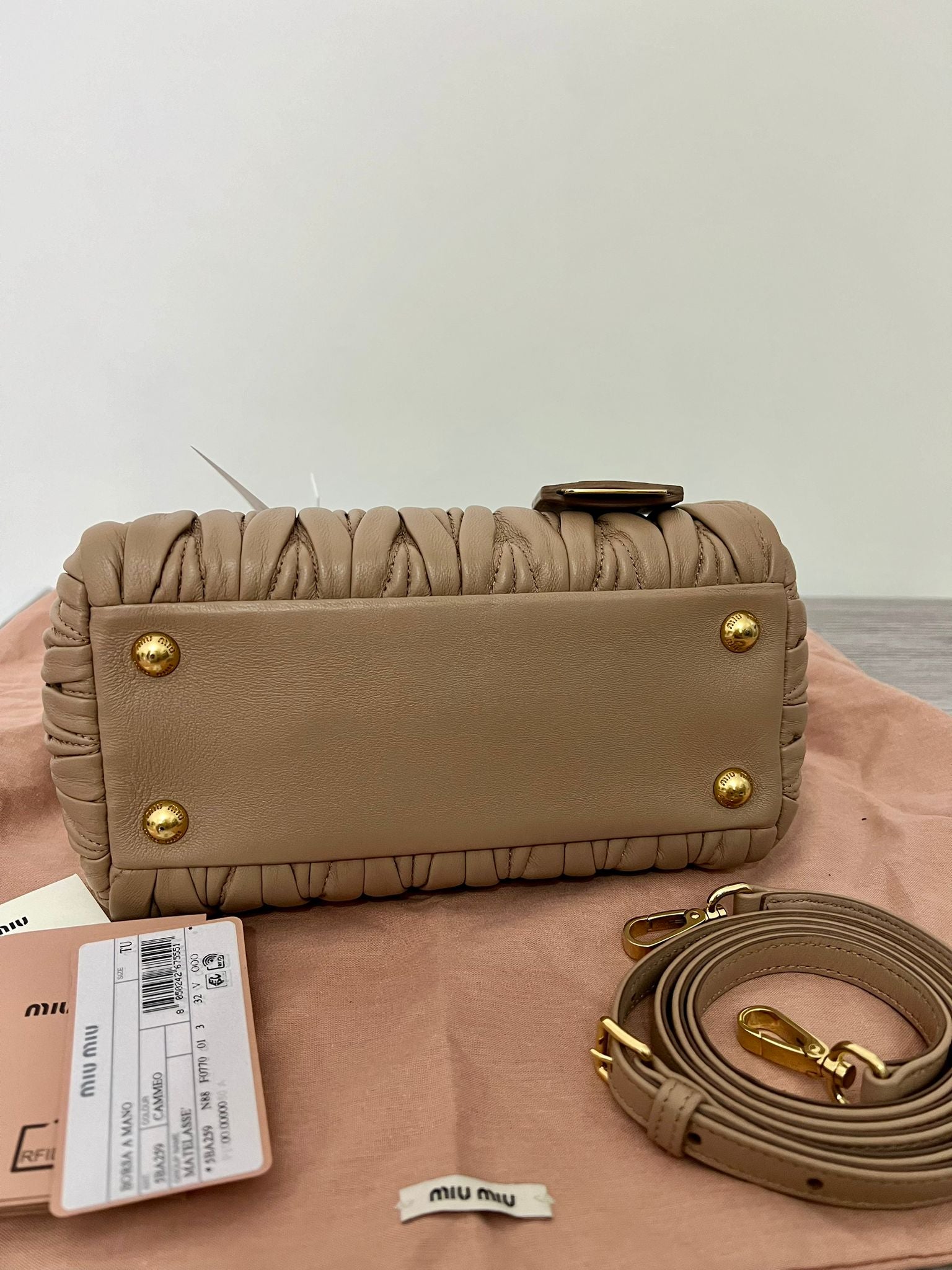 The Miu Miu Arcadie bag is a refined accessory in quilted nappa leather, featuring an iconic design that creates a three-dimensional effect and a soft texture. The caramel color enhances its elegance and versatility, making it ideal for both day and evening.