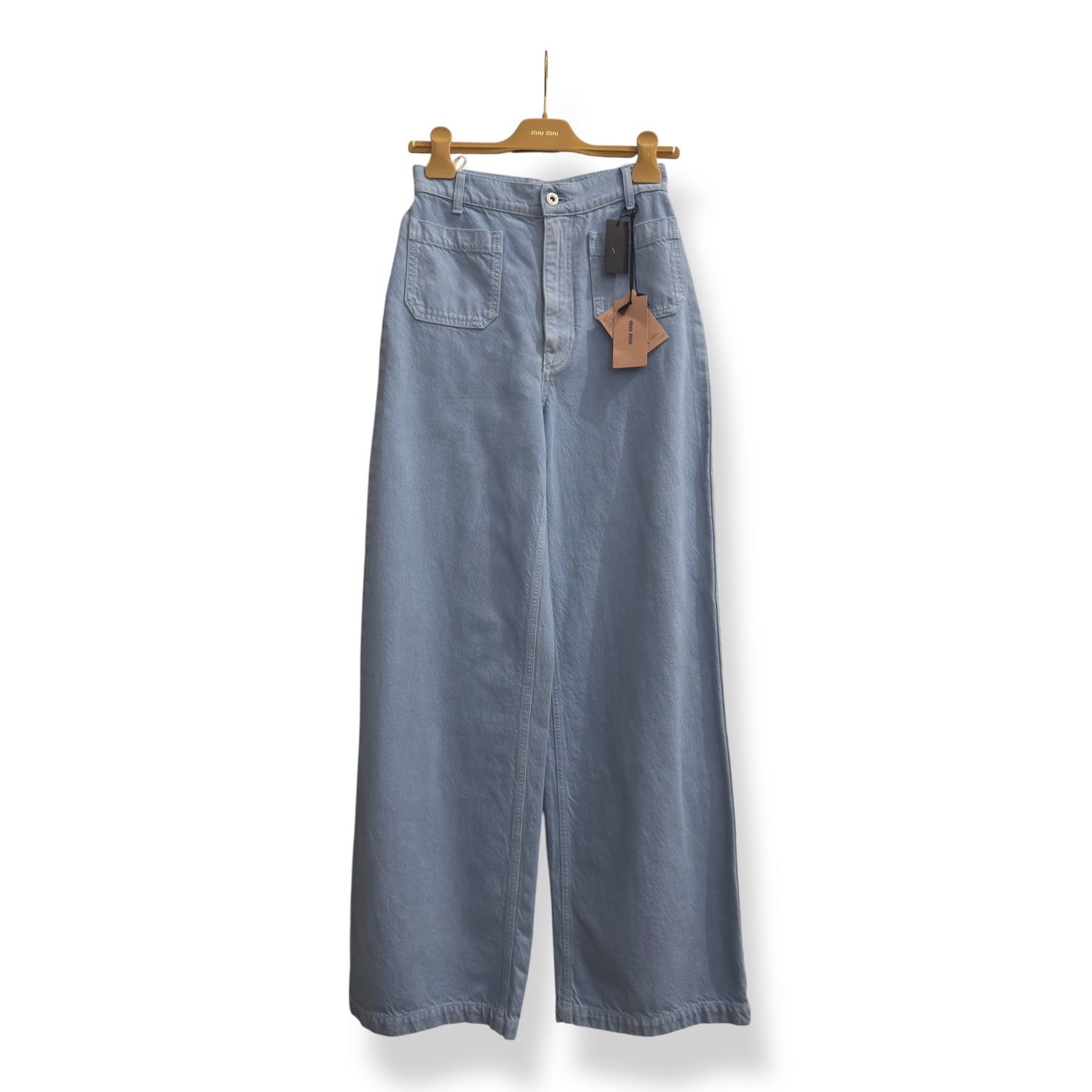 Description: Wide-leg jeans by Miu Miu, crafted from pure cotton denim. Featuring a patch or embroidered logo on the back, a regular waist, four pockets, and a button and concealed zip fastening. The wide-leg cut combines comfort with a modern, urban aesthetic, perfect for minimalist yet distinctive looks.