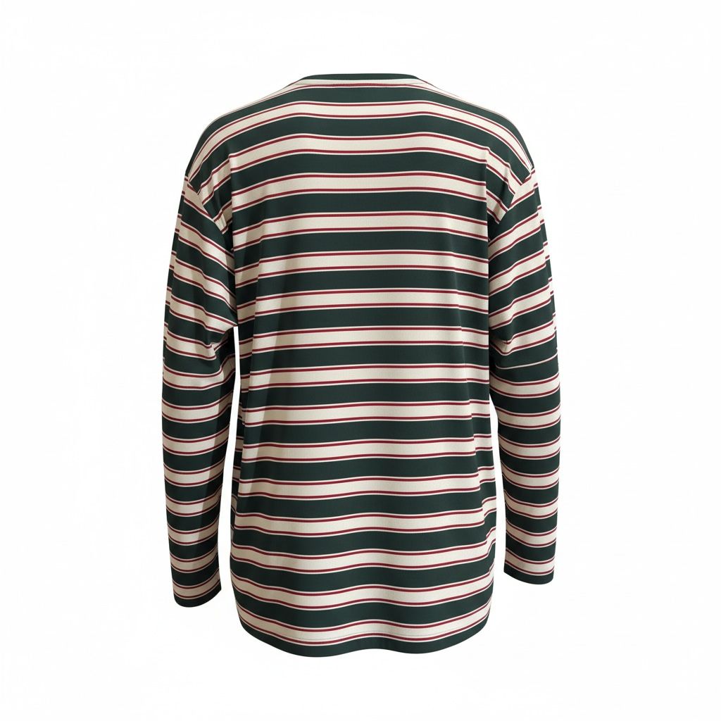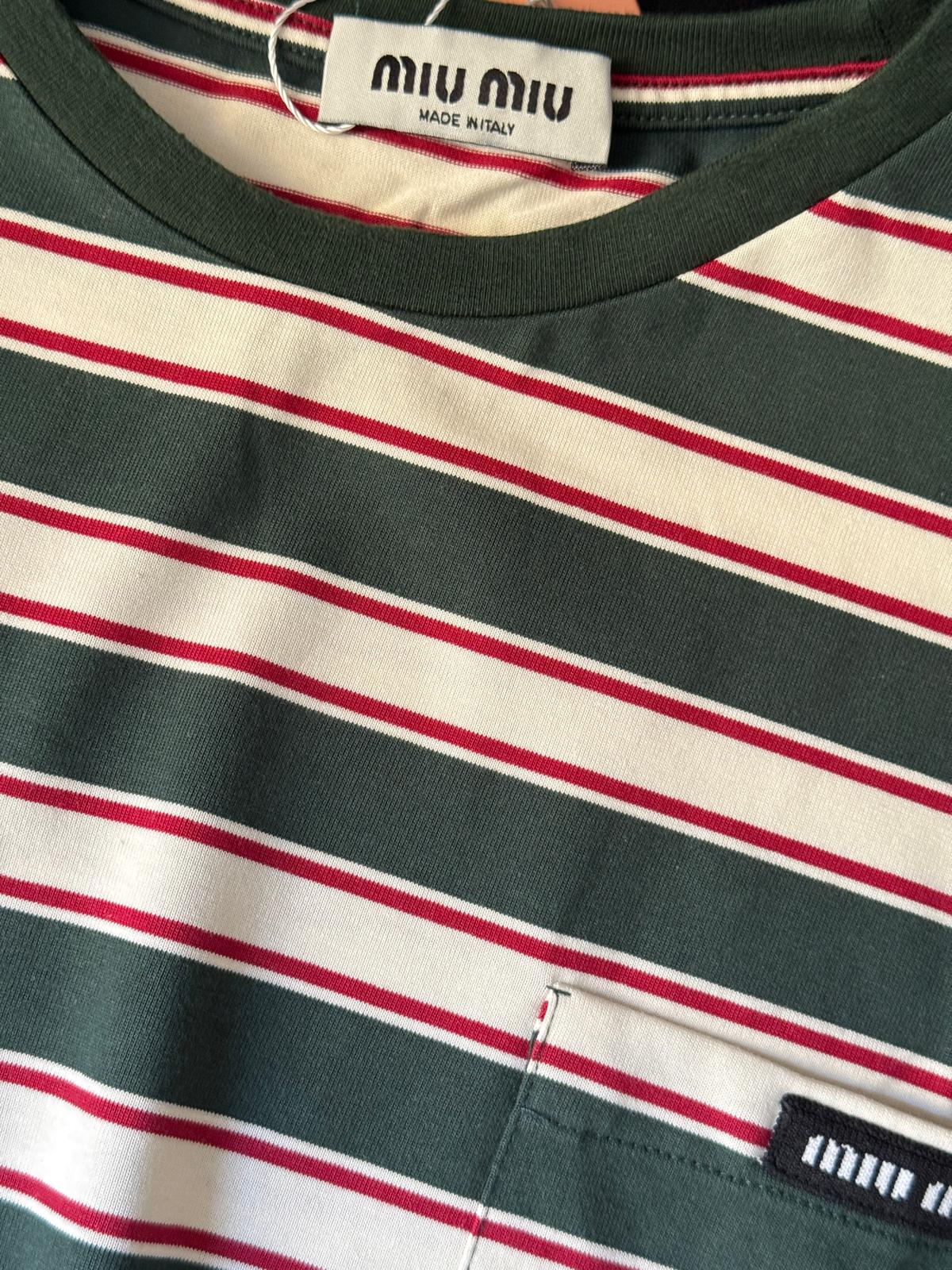 T shirt Miu Miu dal design casual-chic con motivo a righe orizzontali nei toni del verde scuro, avorio e rosso bordeaux. Un capo versatile e di tendenza, perfetto per completare outfit quotidiani con un tocco luxury. Il taglio morbido e la linea pulita la rendono ideale sia per look sporty che per abbinamenti più ricercati.
