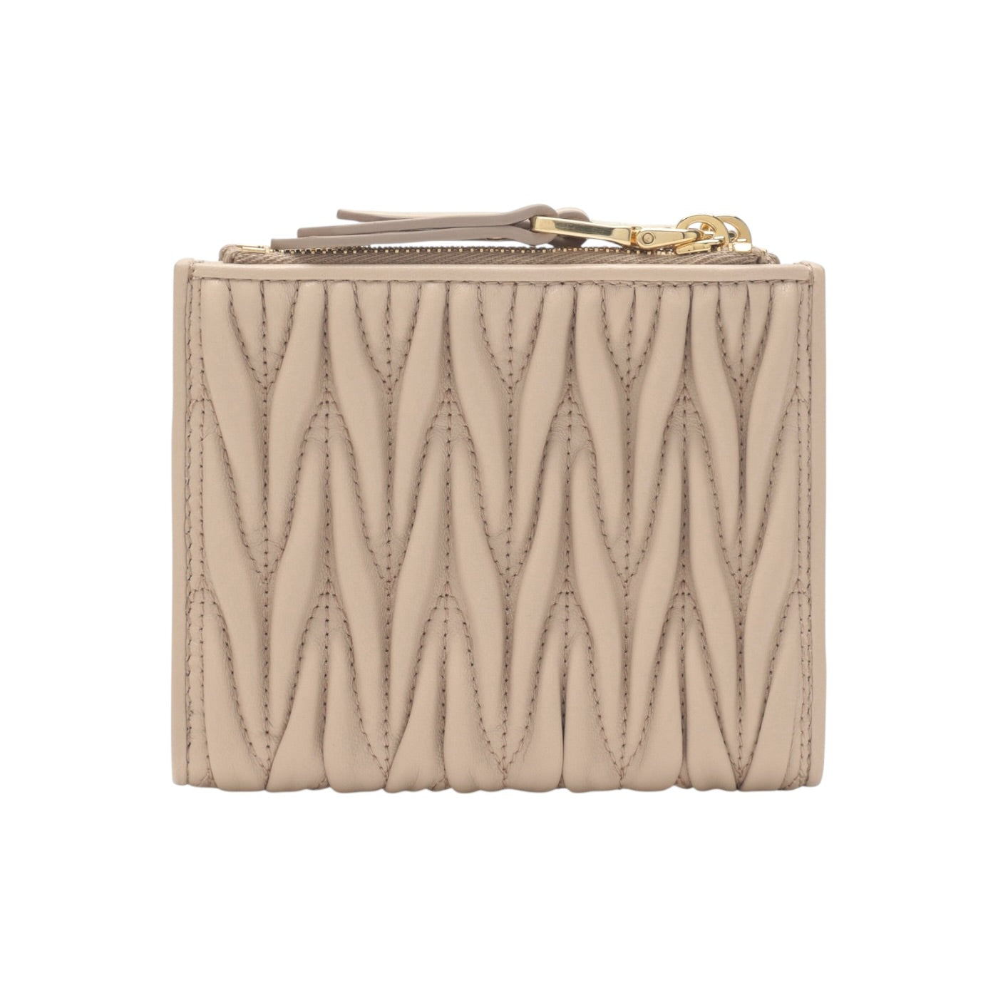 Elegante e raffinato, il portafoglio Miu Miu in nappa matelassé color perla è un accessorio compatto dal fascino senza tempo. Realizzato in morbida pelle di nappa con iconica lavorazione matelassé, esprime tutta la femminilità e l’estetica sofisticata della Maison
