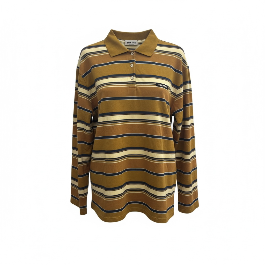Miu Miu long-sleeved cotton polo shirt featuring a horizontal striped pattern in shades of mustard, olive green, white, and blue. The style features a classic collar, a button closure on the front, and a Miu Miu logo label on the chest. Perfect for a casual yet trendy look, it stands out for its contemporary retro style and quality materials.