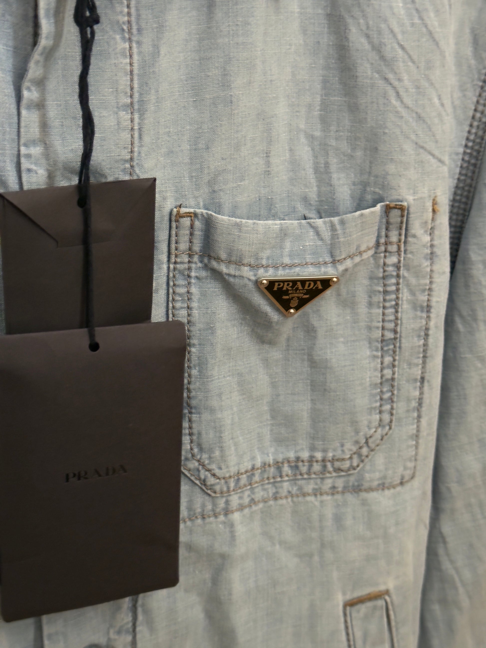- Logo: Prada metal triangle on the chest pocket, Prada and Milano logo on the hanger, Prada logo on the hanging labels