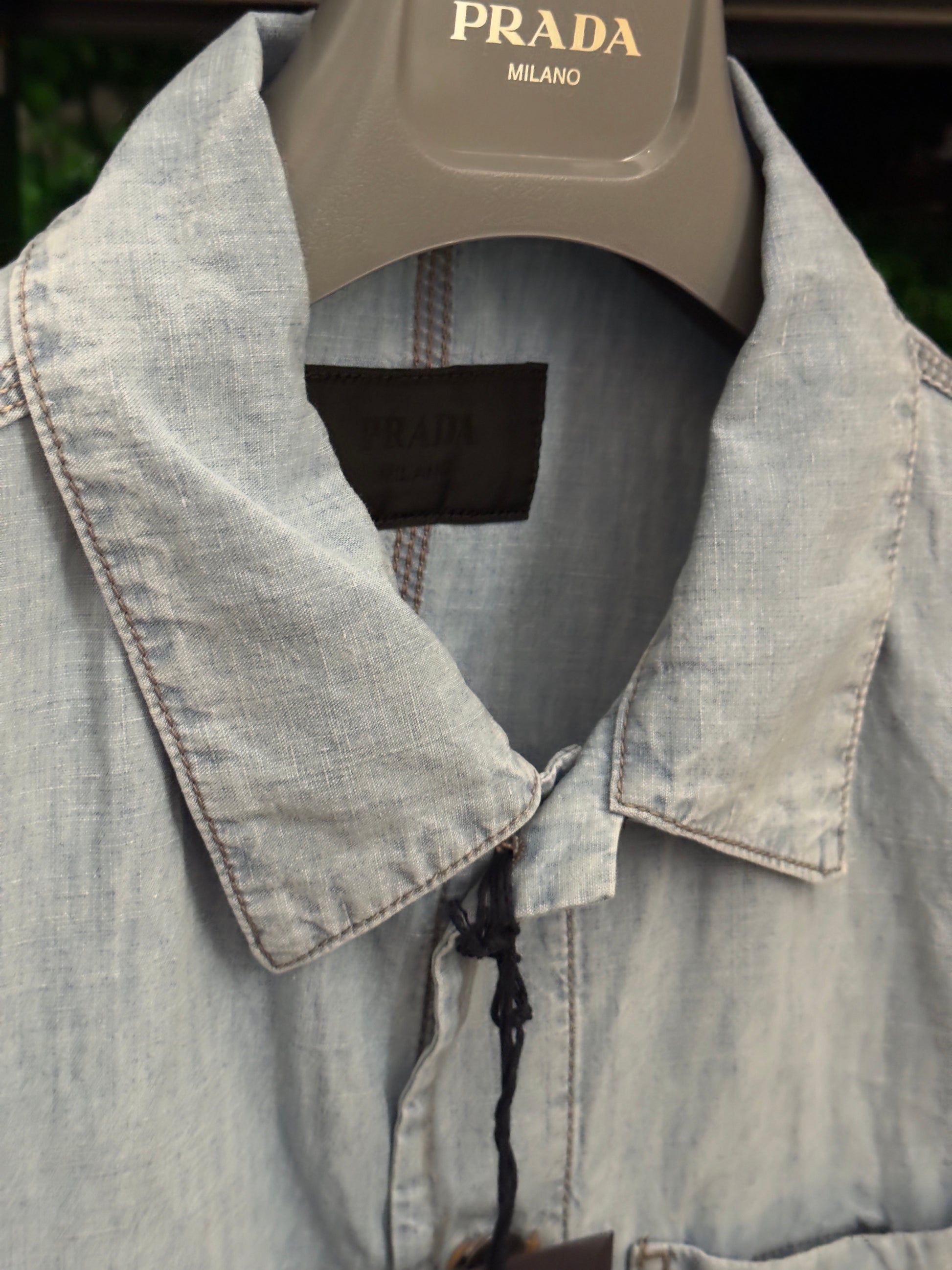 Description: Light denim jacket with a clean, contemporary design, embellished with the iconic Prada triangular logo on the chest pocket. The tailored details and classic silhouette make it a versatile and timeless piece, ideal for creating refined casual looks or adding a touch of luxury to sporty outfits. Perfect with both chinos and jeans, or over white t-shirts or shirts for a simple yet distinctive style.
