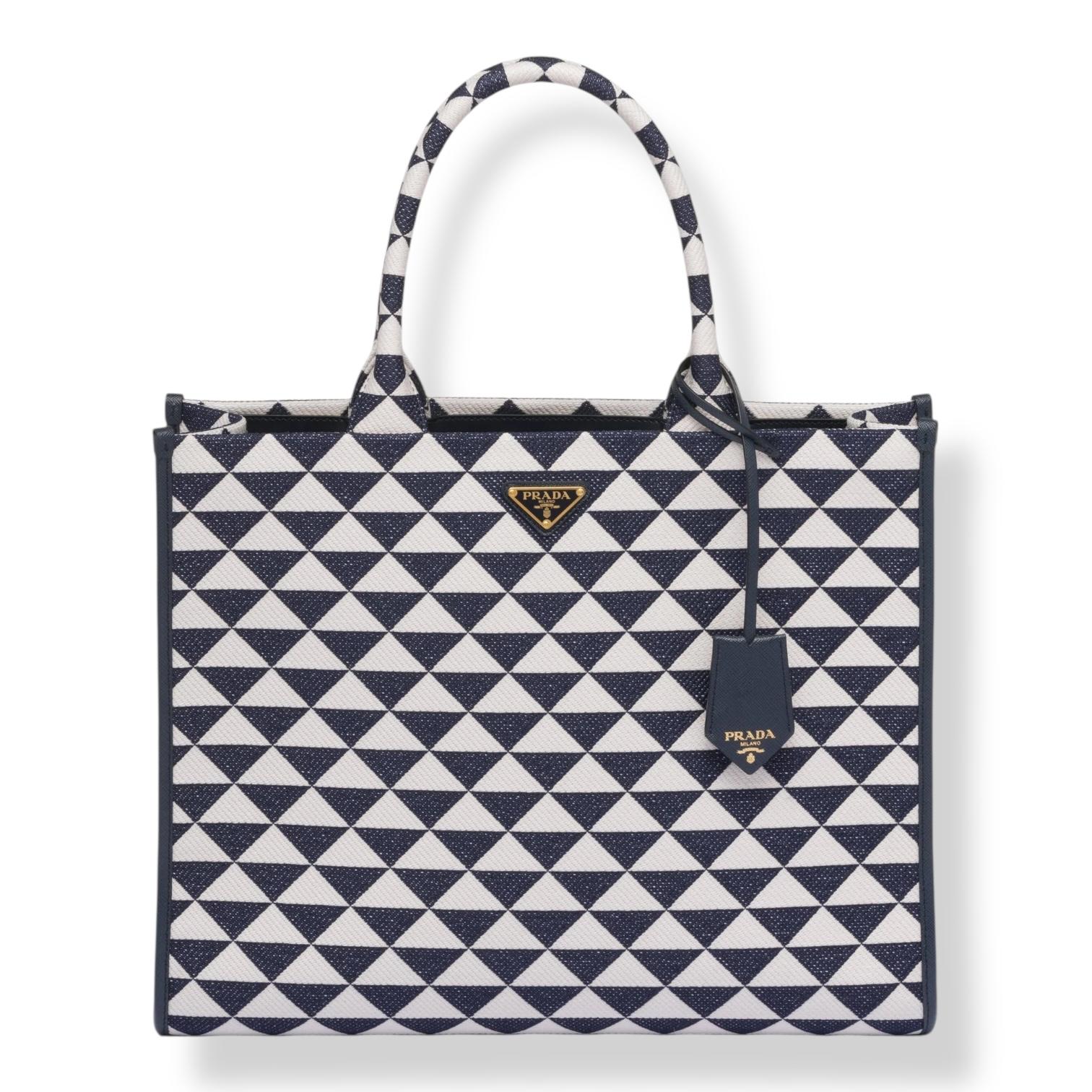 Discover the timeless elegance of the Prada Symbole tote bag , an icon of style and refinement. This model, offered in a sophisticated blue and white combination, is crafted from fine jacquard canvas with the unmistakable Prada geometric motif.