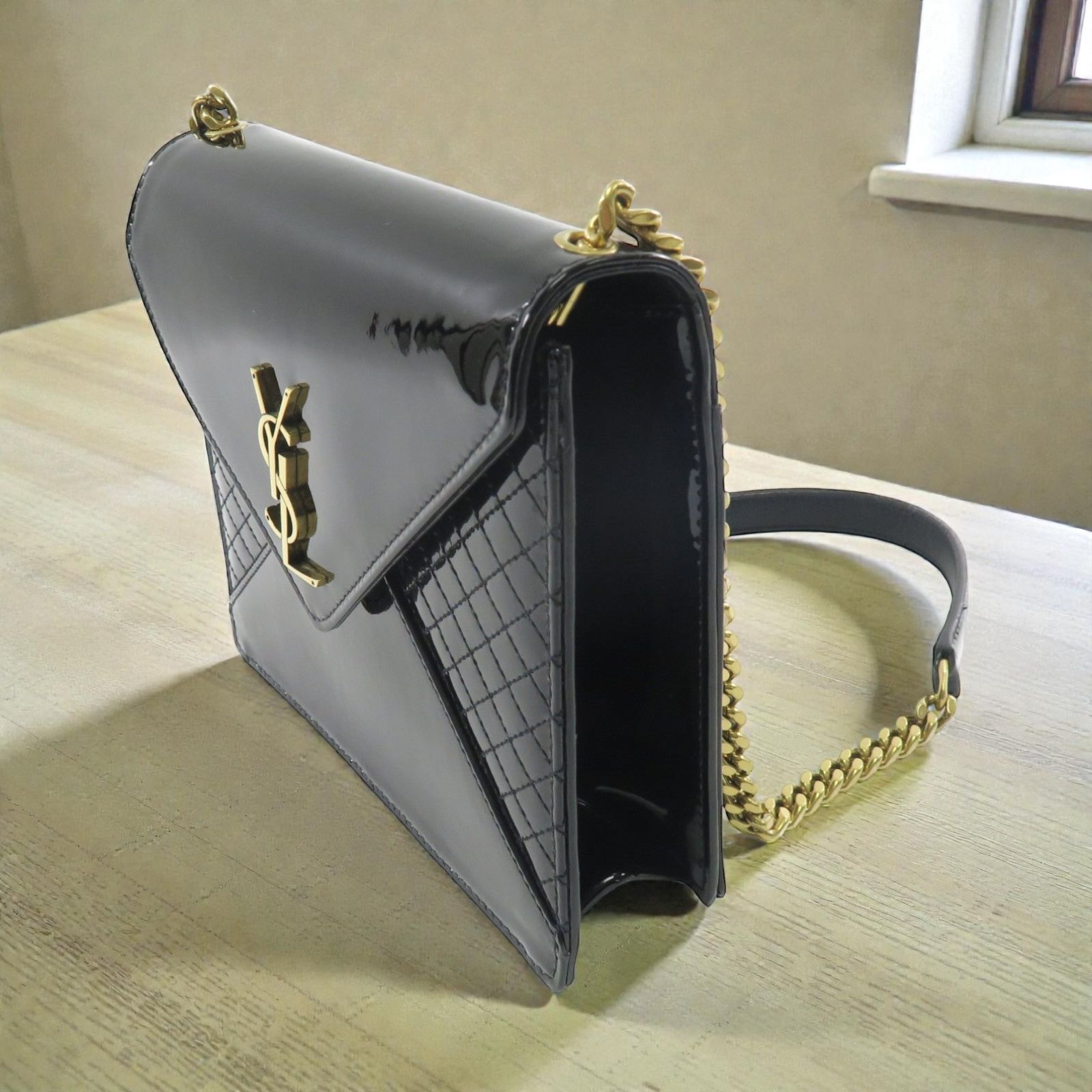 Saint Laurent Envelope Chain Bag in Pelle Verniciata Nera