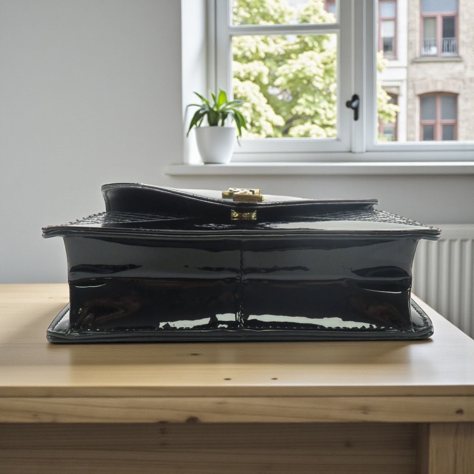 Raffinata e contemporanea, questa borsa Saint Laurent si distingue per il suo design strutturato a busta e per l’eleganza della pelle verniciata nera. Le impunture geometriche sui pannelli laterali e l’iconico logo YSL in metallo dorato conferiscono un tocco sofisticato e riconoscibile.