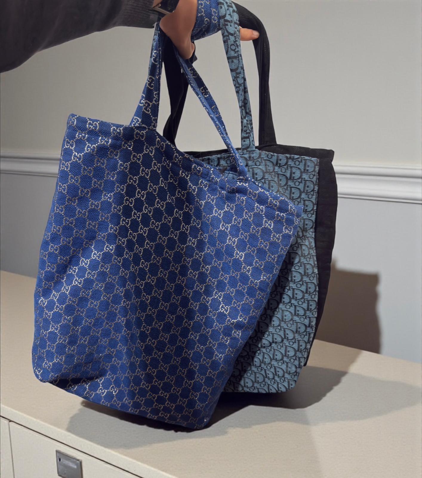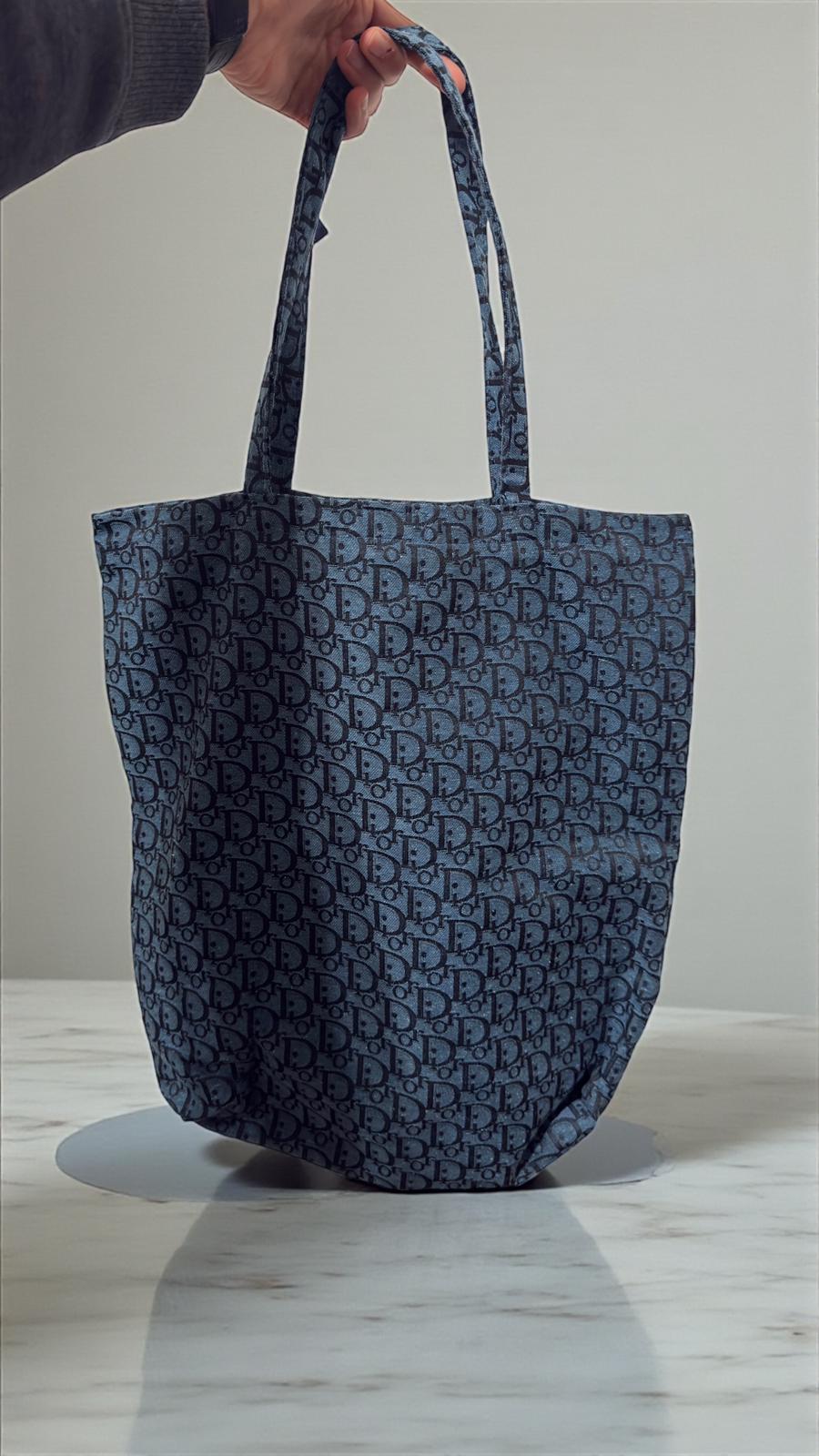 Il design capiente e leggero è impreziosito da un iconico motivo all-over, declinato in tonalità sofisticate di blu e nero che donano profondità e stile.