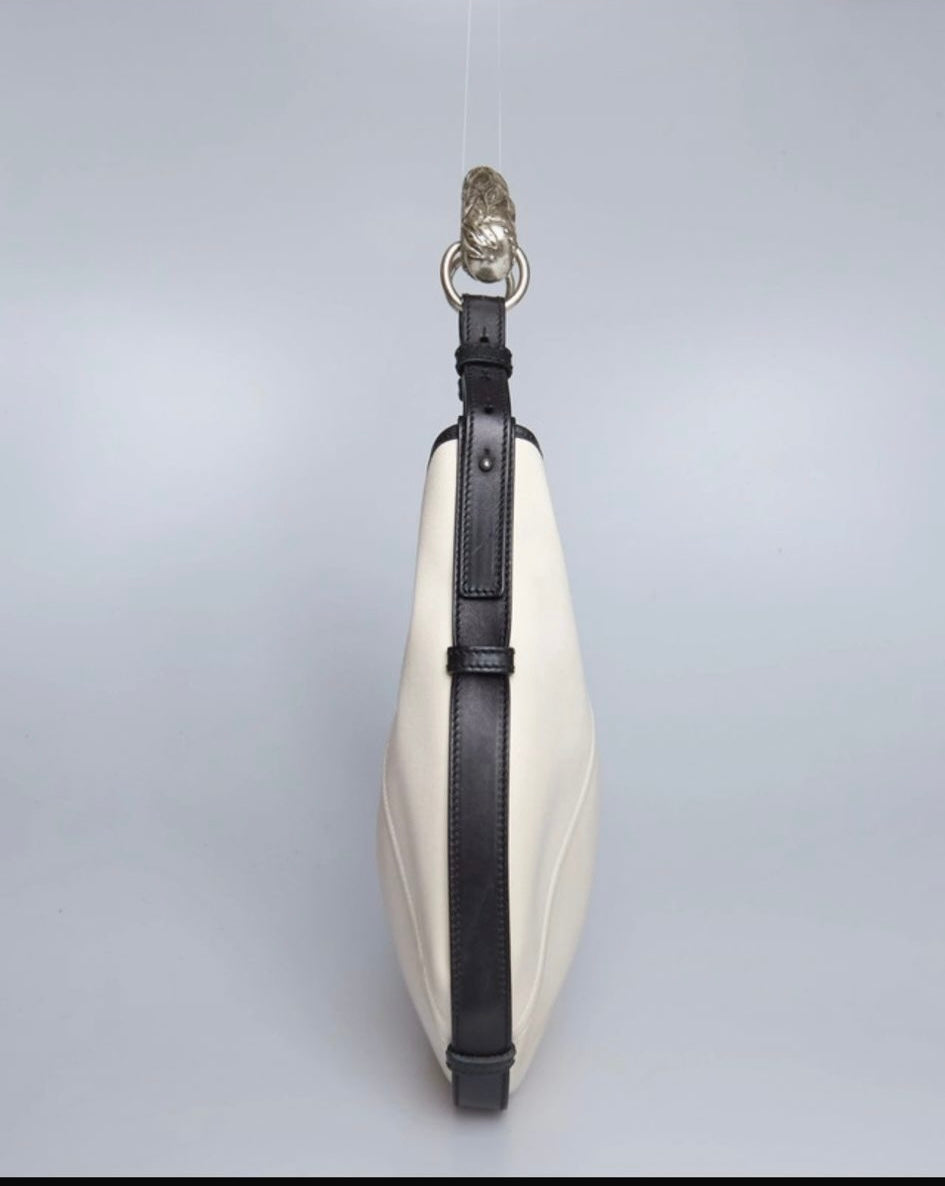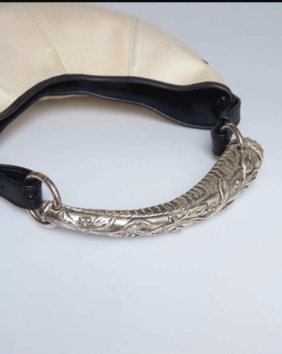 Questa borsa Saint Laurent Mombasa, disegnata da Tom Ford nel 2002, presenta un esterno in tessuto pelle. È impreziosita da una maniglia in corno con hardware in metallo color argento e finiture coordinate.