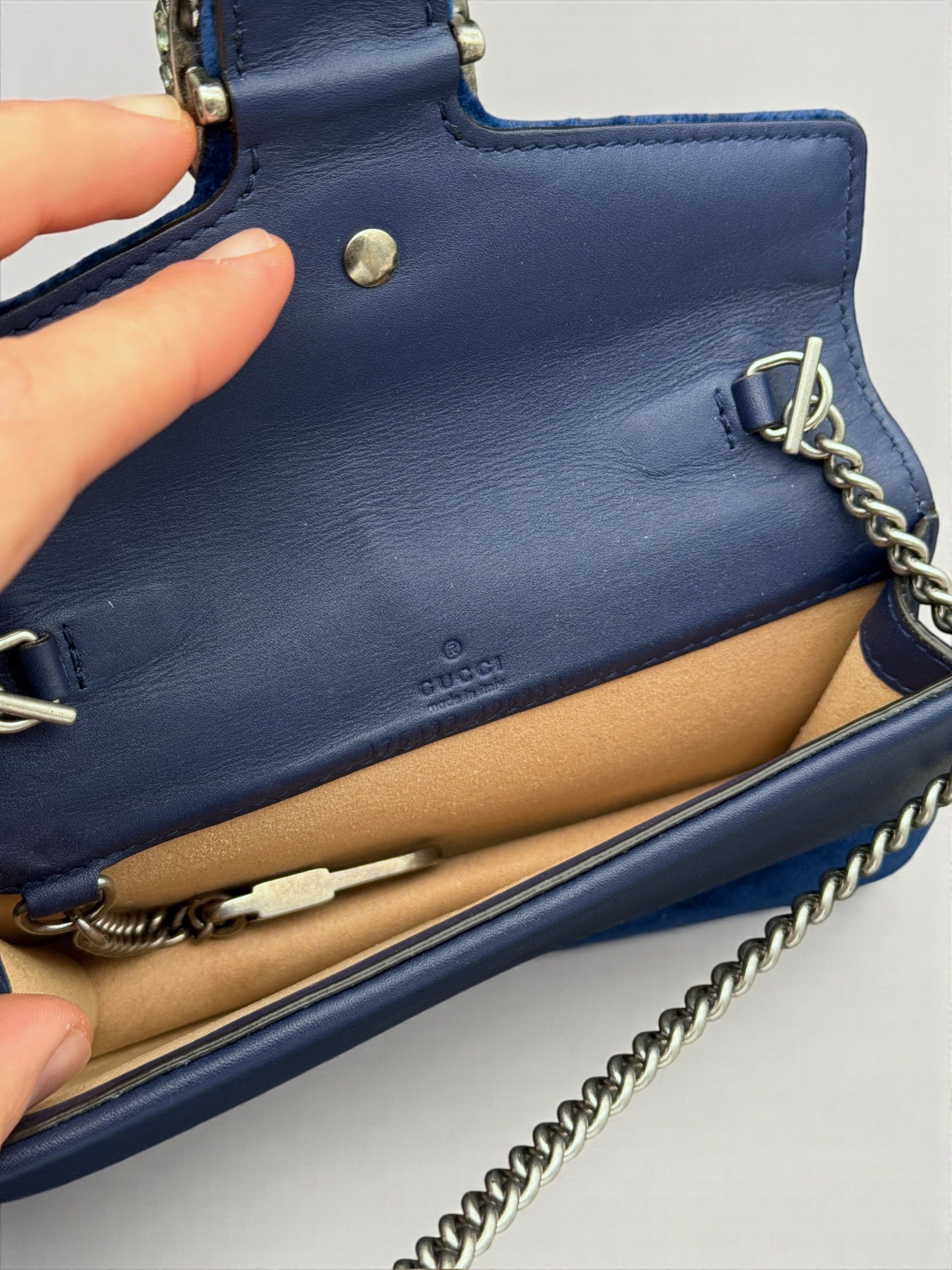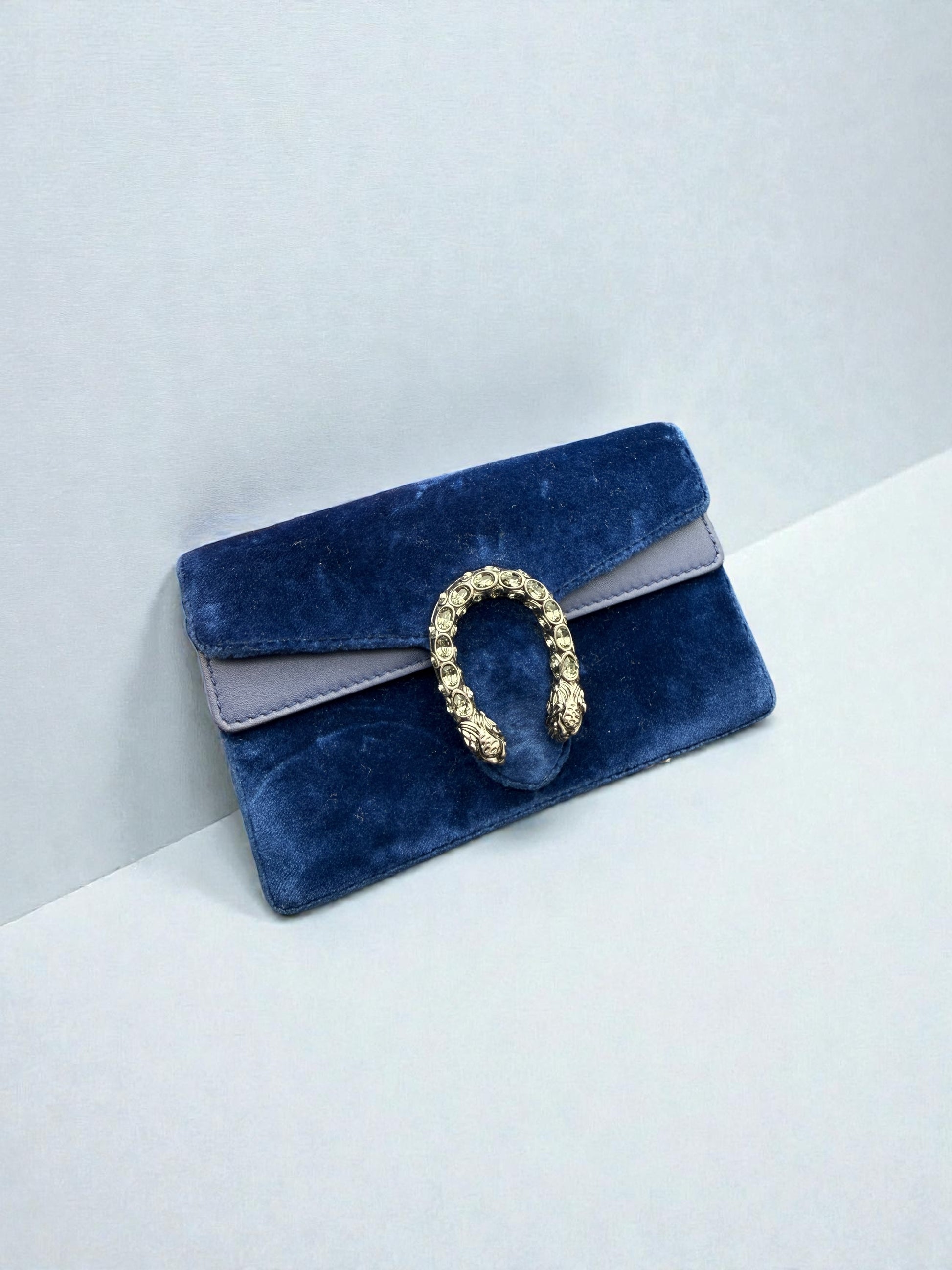 Elegante e ricercata, questa borsa Gucci presenta una struttura compatta e sofisticata, realizzata in velluto blu intenso che conferisce profondità e luminosità al design. L'iconica chiusura Dionysus in metallo anticato, impreziosita da dettagli scolpiti, aggiunge un carattere distintivo e immediatamente riconoscibile al modello.
