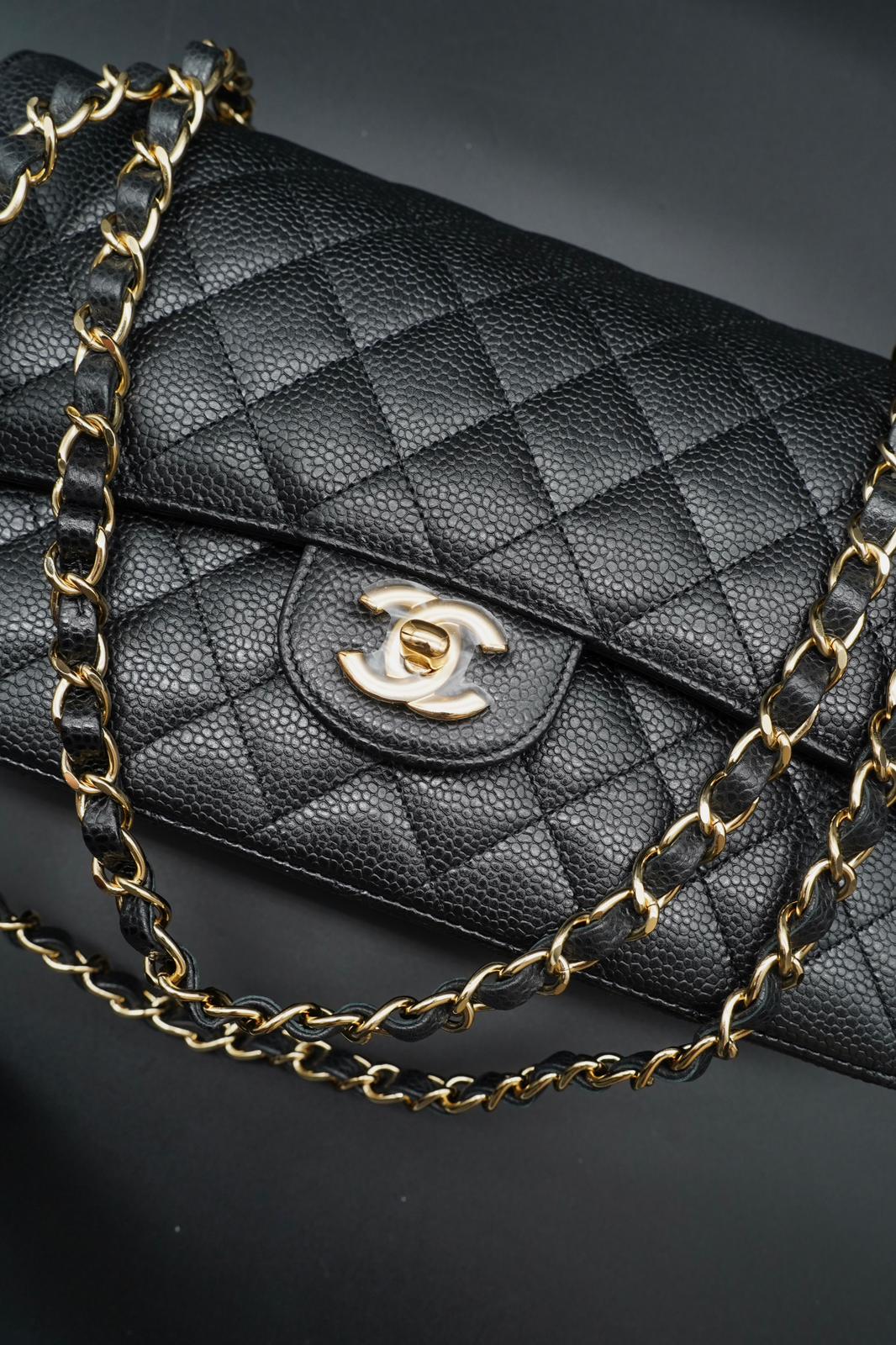 Raffinatezza senza tempo e artigianalità impeccabile definiscono questa Chanel Classic Flap Bag in pelle nera. Realizzata con lavorazione matelassé e dettagli in metallo dorato, è un’icona della Maison che unisce eleganza e funzionalità.