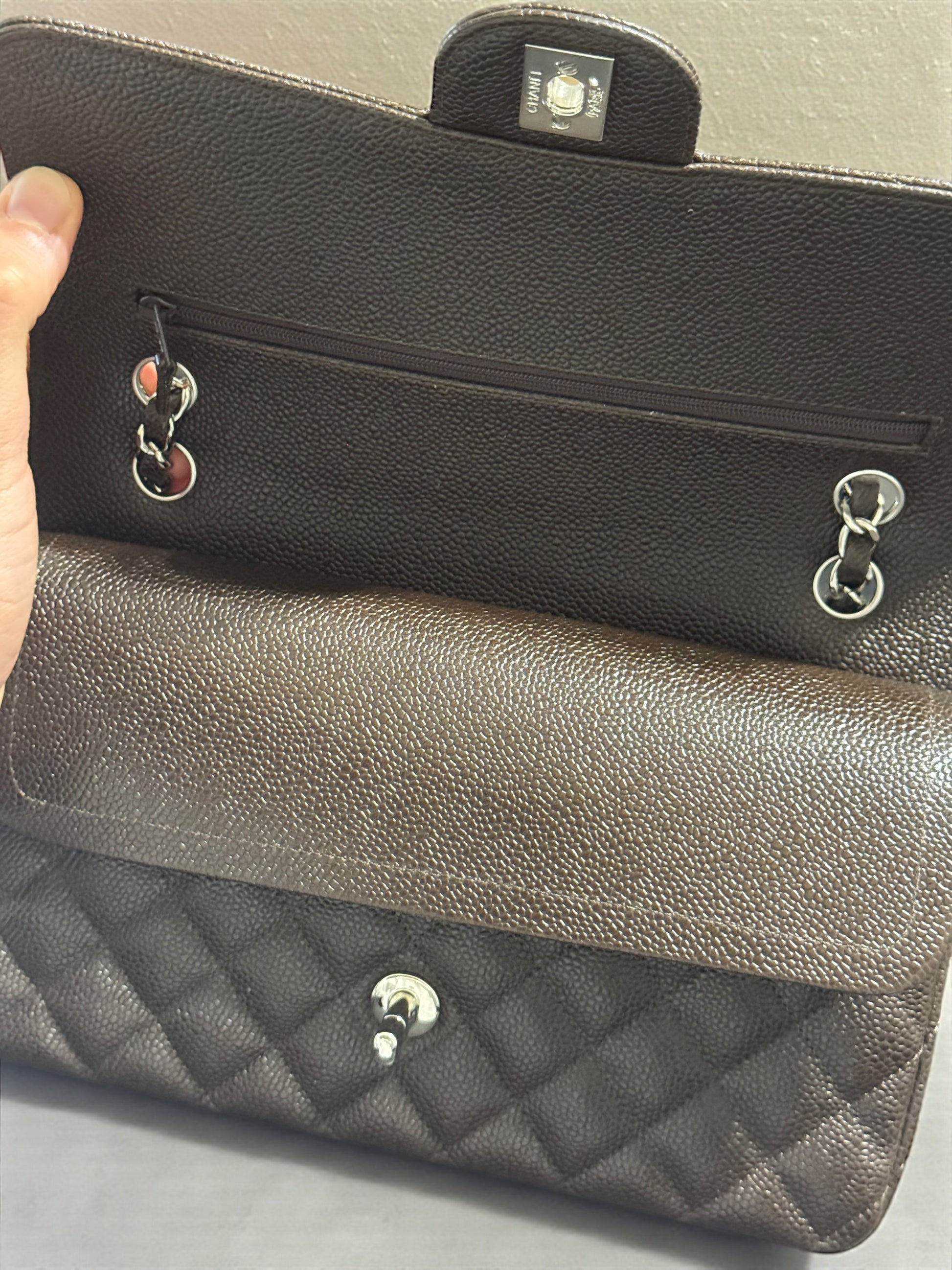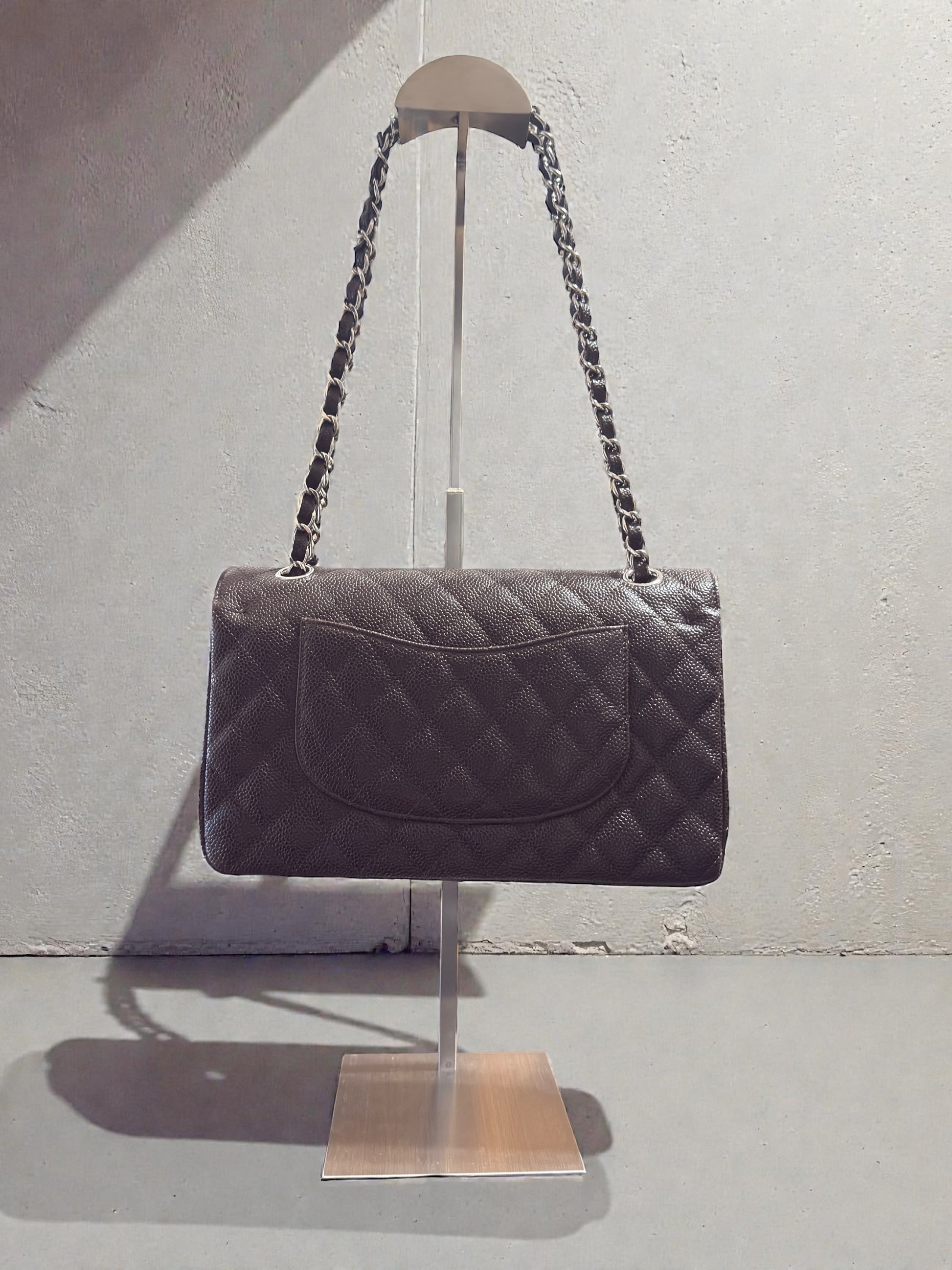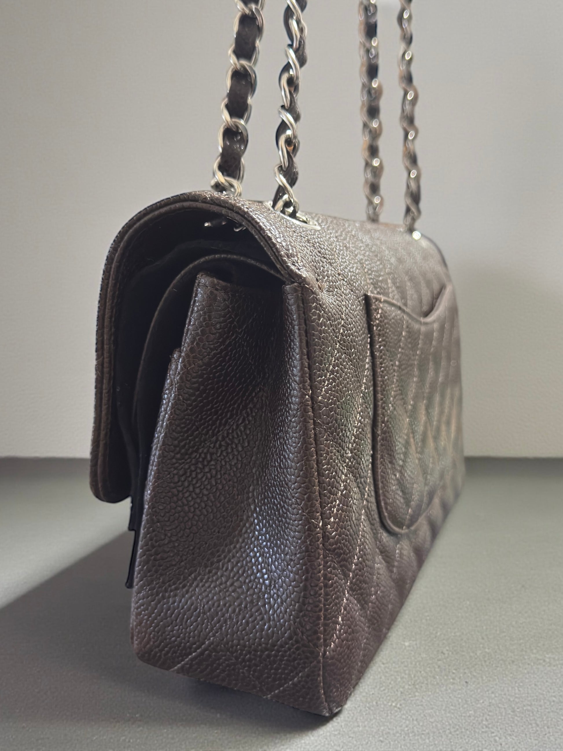Iconica Chanel Timeless Classic misura 25,5 cm, realizzata in pregiata pelle color testa di moro (con tonalità marrone intensa) e rifinita con hardware argento. Un modello senza tempo, simbolo di eleganza e raffinatezza, perfetto per ogni occasione.