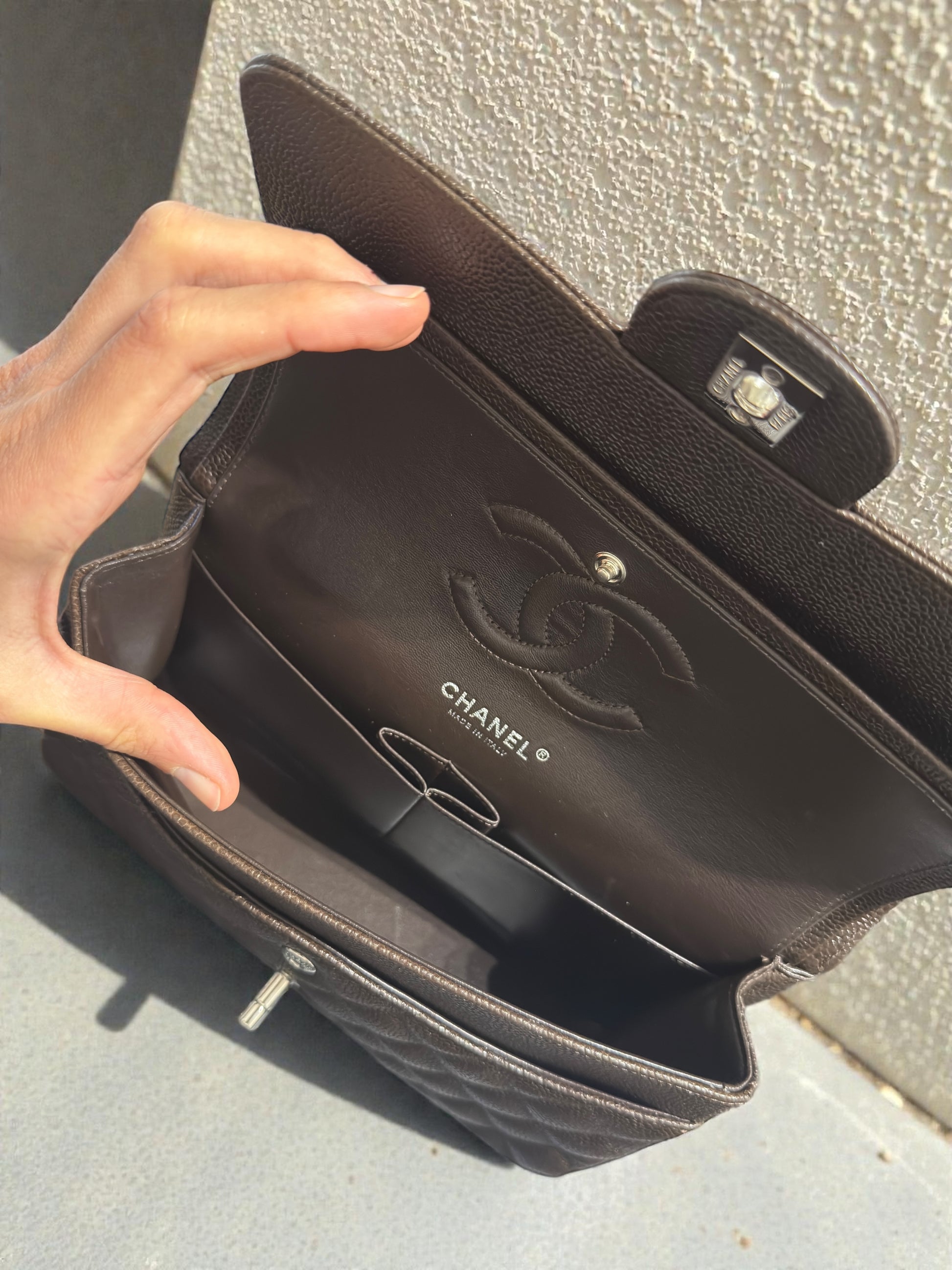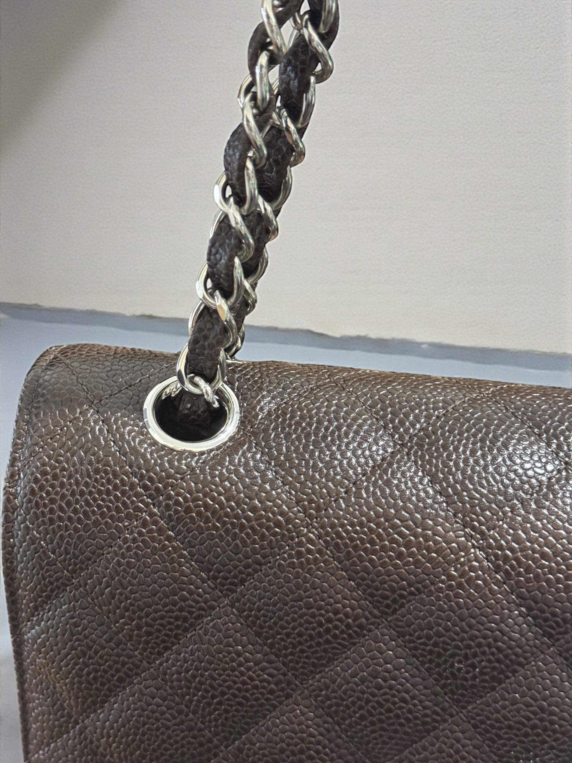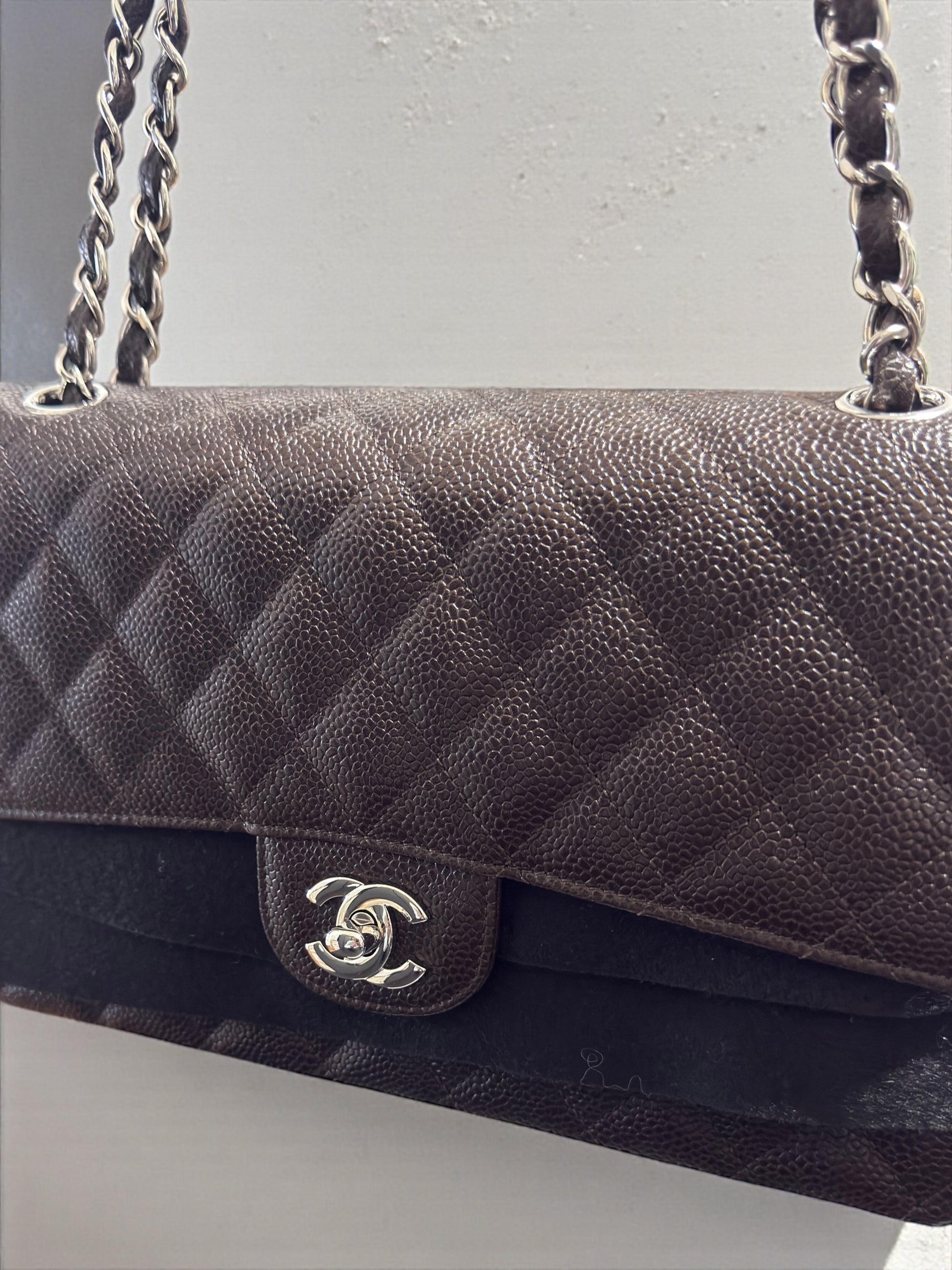 Iconica Chanel Timeless Classic misura 25,5 cm, realizzata in pregiata pelle color testa di moro (con tonalità marrone intensa) e rifinita con hardware argento. Un modello senza tempo, simbolo di eleganza e raffinatezza, perfetto per ogni occasione.