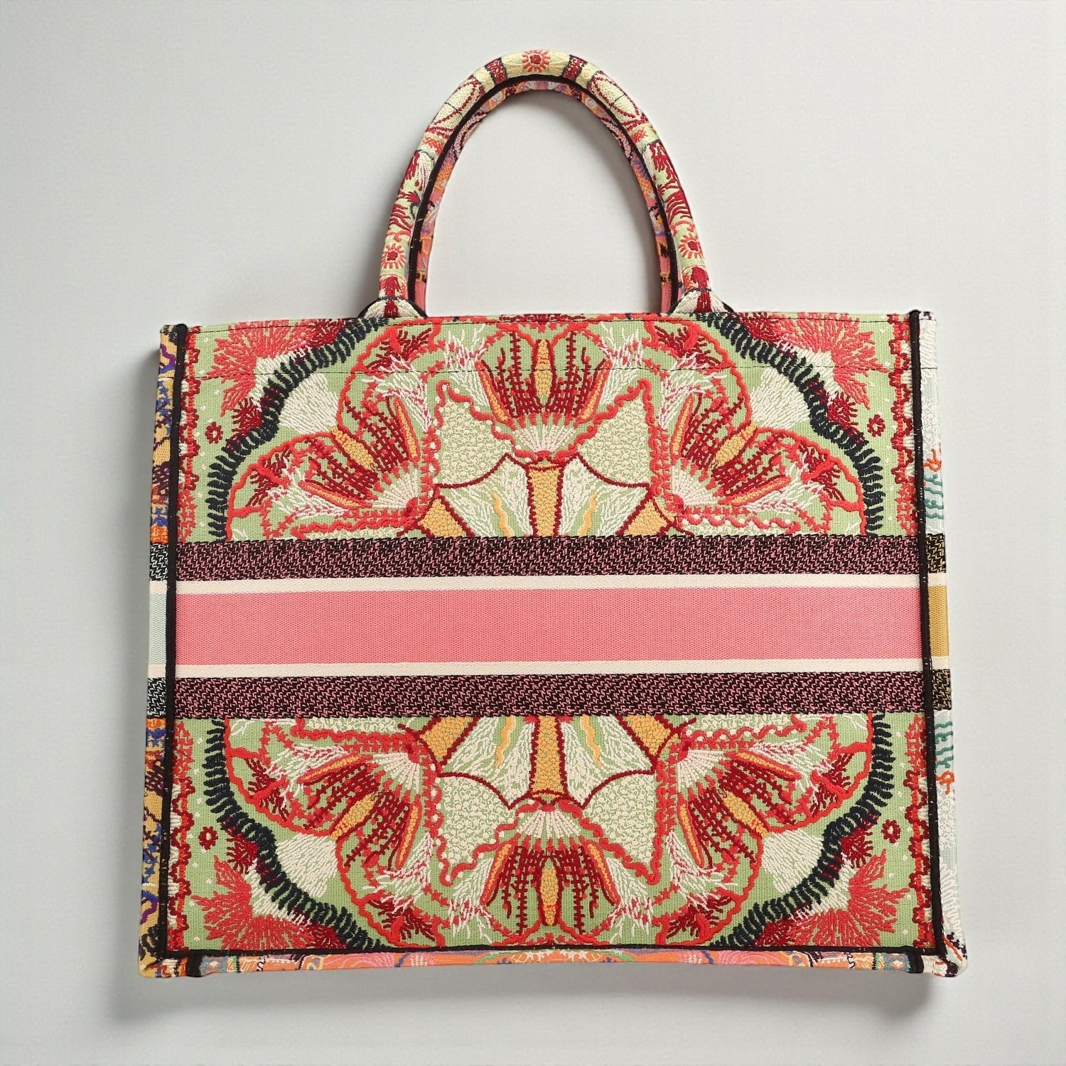 kQuesta Dior Book Tote è un'icona della Maison, caratterizzata da un elaborato ricamo multicolore che richiama motivi floreali e mandala. Il design presenta tonalità vivaci come rosa, arancio, verde e lilla, sapientemente intrecciate per creare un effetto artistico e sofisticato.