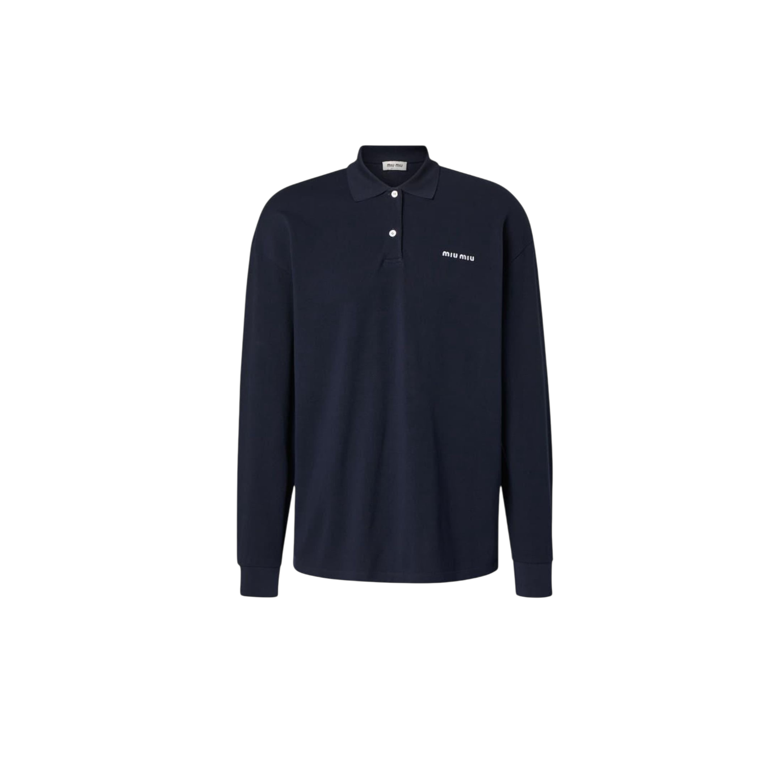 Raffinata polo Miu Miu realizzata in cotone piqué, dal design elegante e senza tempo. Il colore blu intenso viene impreziosito dal logo Miu Miu ricamato, per un tocco distintivo e sofisticato. Le maniche lunghe aggiungono un’allure versatile, adatta a ogni stagione.