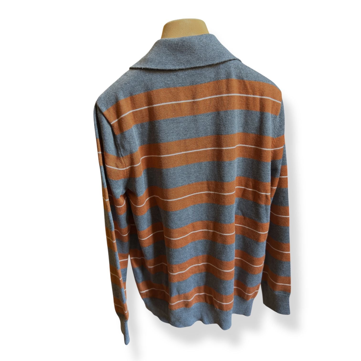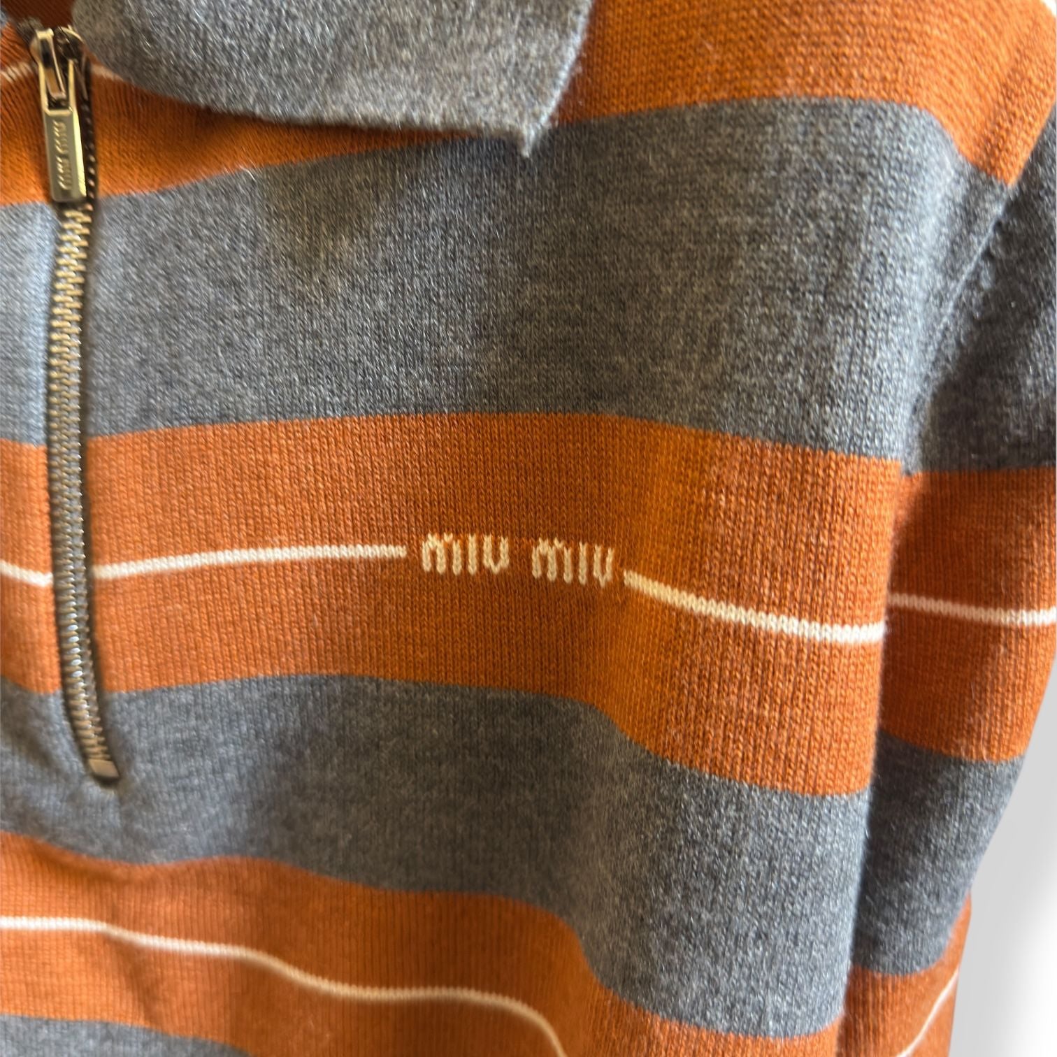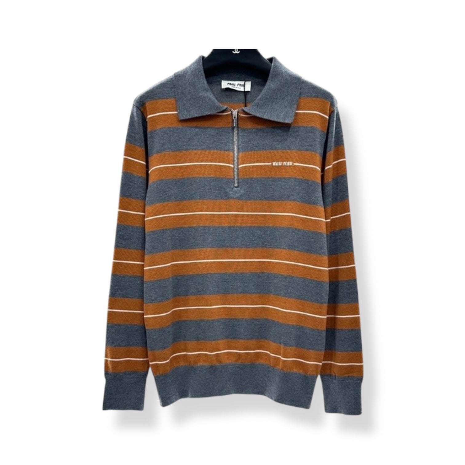 La polo Miu Miu grigia a righe, realizzata in 100% lana, unisce eleganza e comfort in un capo dallo stile contemporaneo. Morbida e calda, rappresenta la scelta ideale per chi cerca un look raffinato ma versatile, adatto sia a contesti casual che più sofisticati.