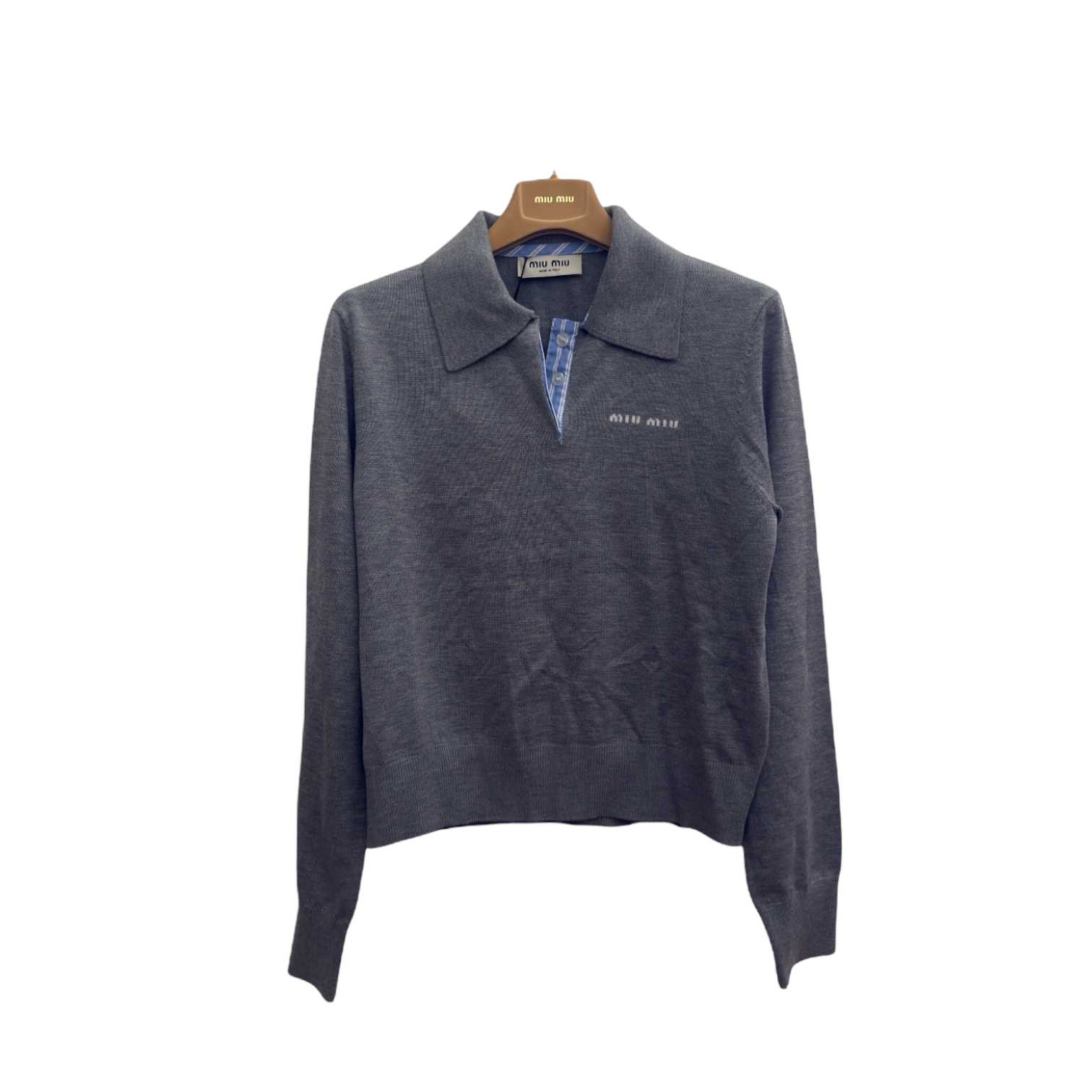 La polo Miu Miu grigia, realizzata in 100% lana, unisce eleganza e comfort in un capo dallo stile contemporaneo. Morbida e calda, rappresenta la scelta ideale per chi cerca un look raffinato ma versatile, adatto sia a contesti casual che più sofisticati.