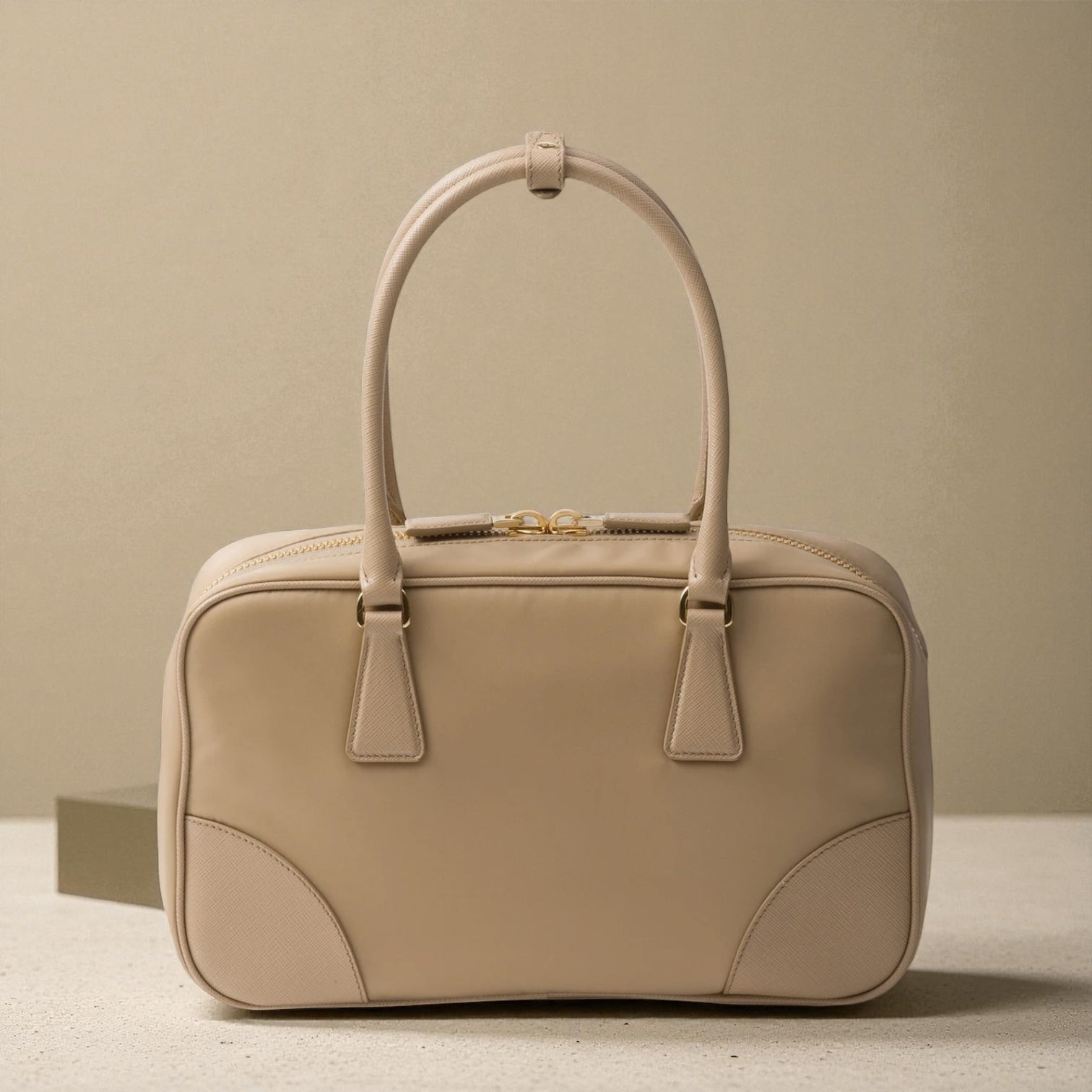 Il Bauletto in Re-Nylon e Saffiano Medium di Prada reinterpreta una silhouette d’archivio in chiave moderna: realizzato in esterno con nylon rigenerato Re-Nylon e rifinito con dettagli in pelle Saffiano, unisce sostenibilità e stile iconico. Il logo triangolo in metallo smaltato firma il modello, mentre le finiture in metallo e i piedini protettivi completano l’estetica curataBrand: Prada