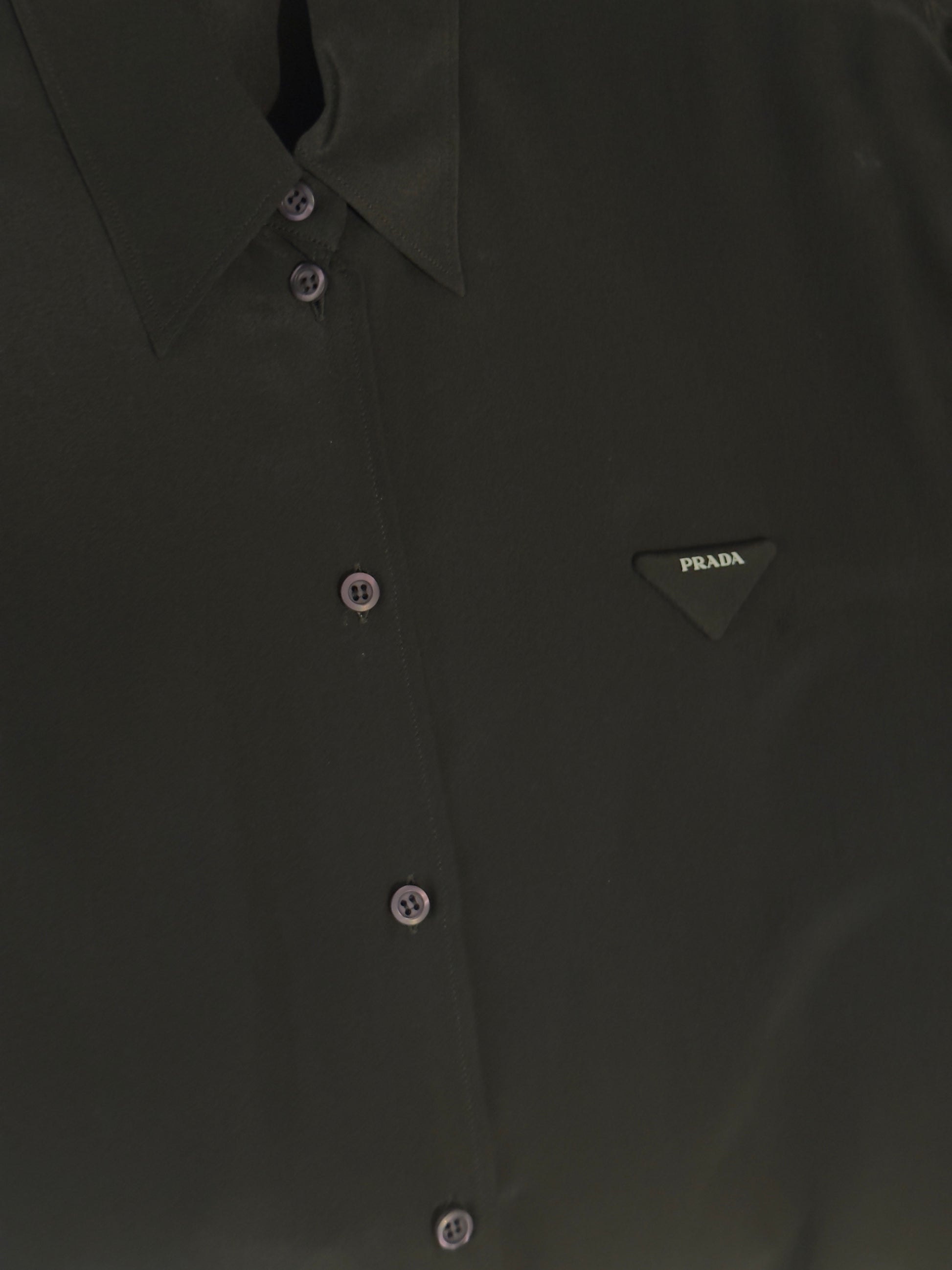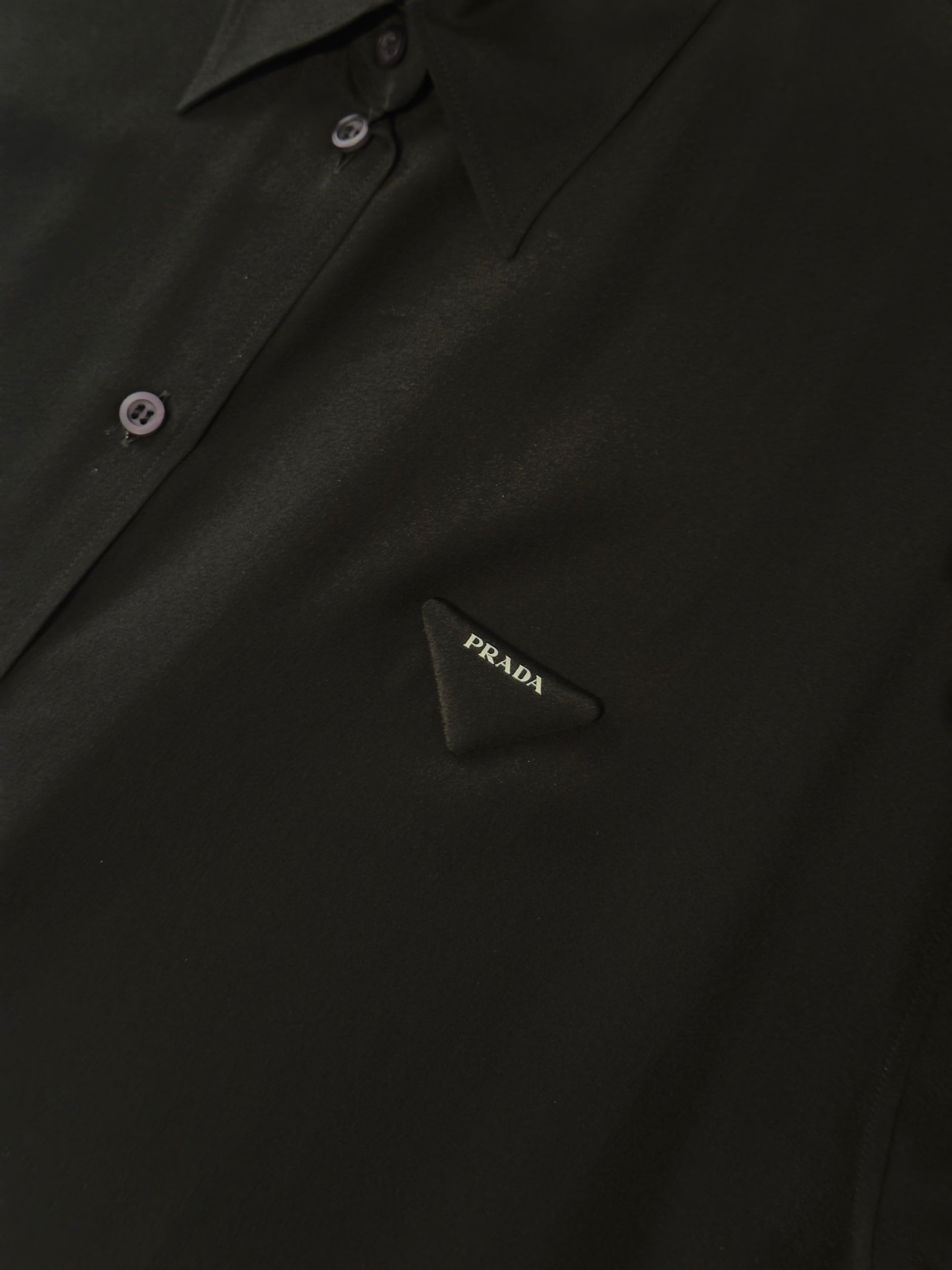 Questa camicia nera Prada incarna l’eleganza moderna e minimalista della Maison. Realizzata in tessuto tecnico leggero, offre una vestibilità rilassata e un comfort sofisticato, perfetto per ogni occasione.
