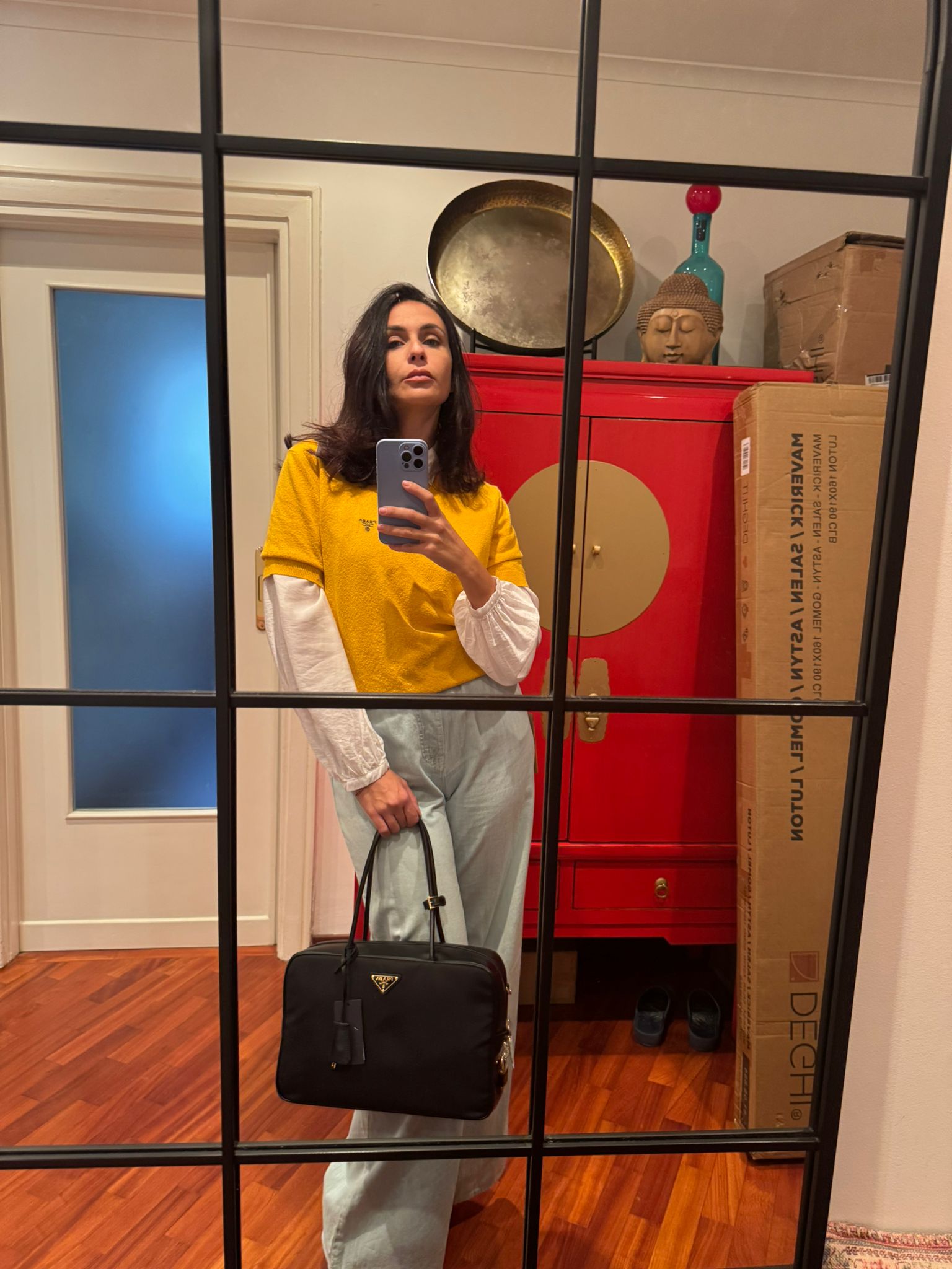 Un capo versatile e senza tempo, la maglia Prada color senape aggiunge un tocco di eleganza moderna e un accento di colore sofisticato a qualsiasi guardaroba.