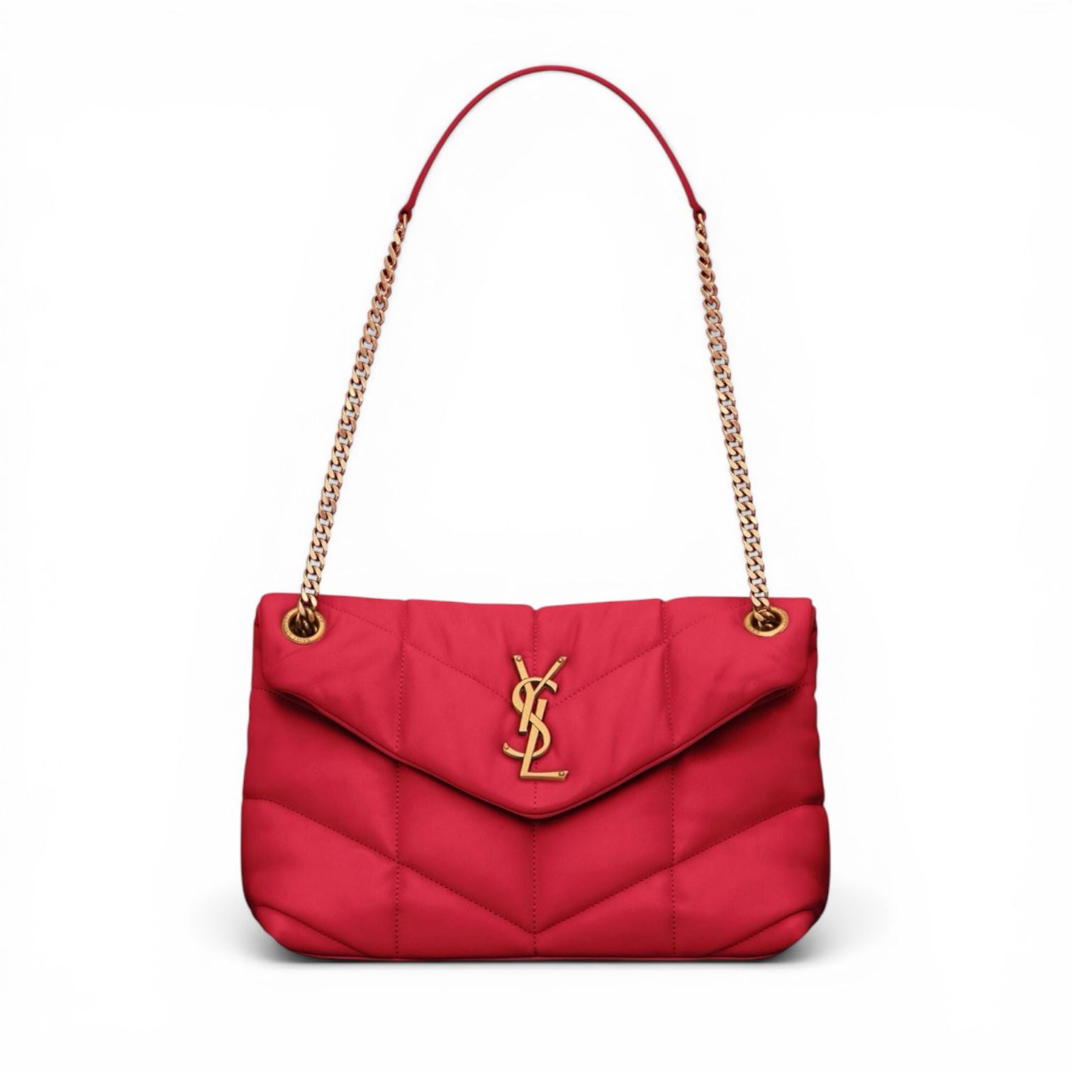 Femminile e d’impatto, la Puffer Toy di Saint Laurent è proposta in una raffinata versione in raso di seta color Guava Pink, una tonalità vivace e sofisticata che dona luminosità e carattere al look. La lavorazione trapuntata chevron esalta il volume morbido della borsa, rendendola iconica e contemporanea.