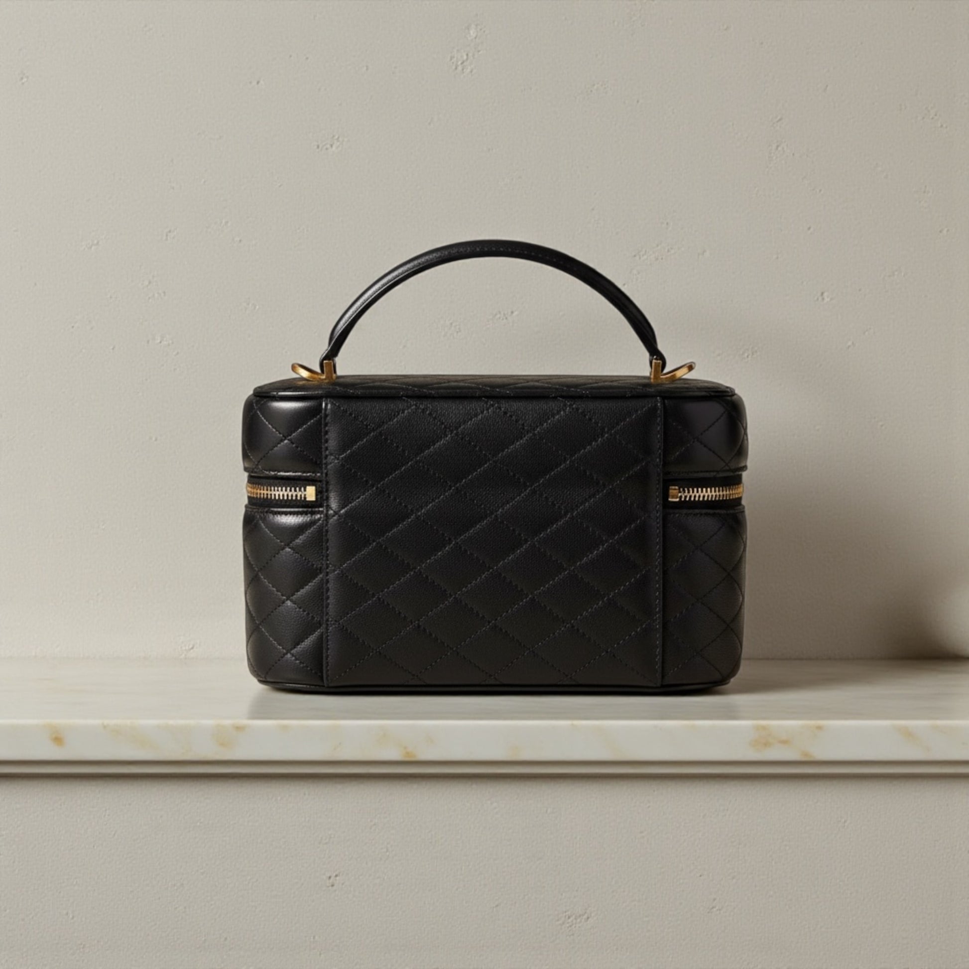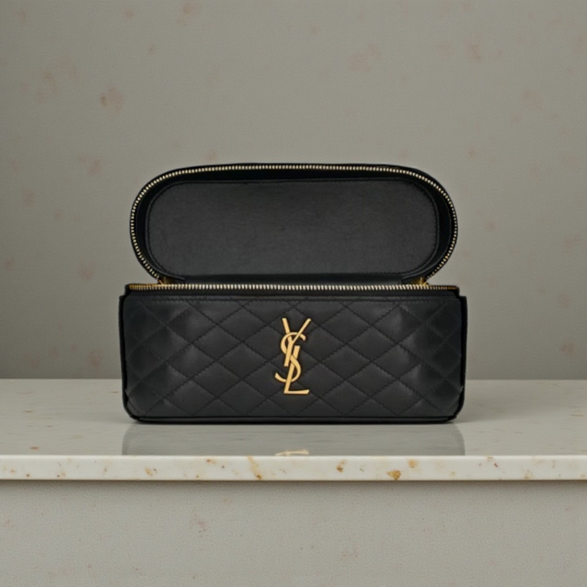 Raffinata ed essenziale, il Saint Laurent Vanity interpreta l’eleganza contemporanea della Maison attraverso un design compatto e strutturato. Realizzata in pelle nera, si distingue per le linee pulite e per l’estetica minimal, perfetta per un utilizzo versatile.