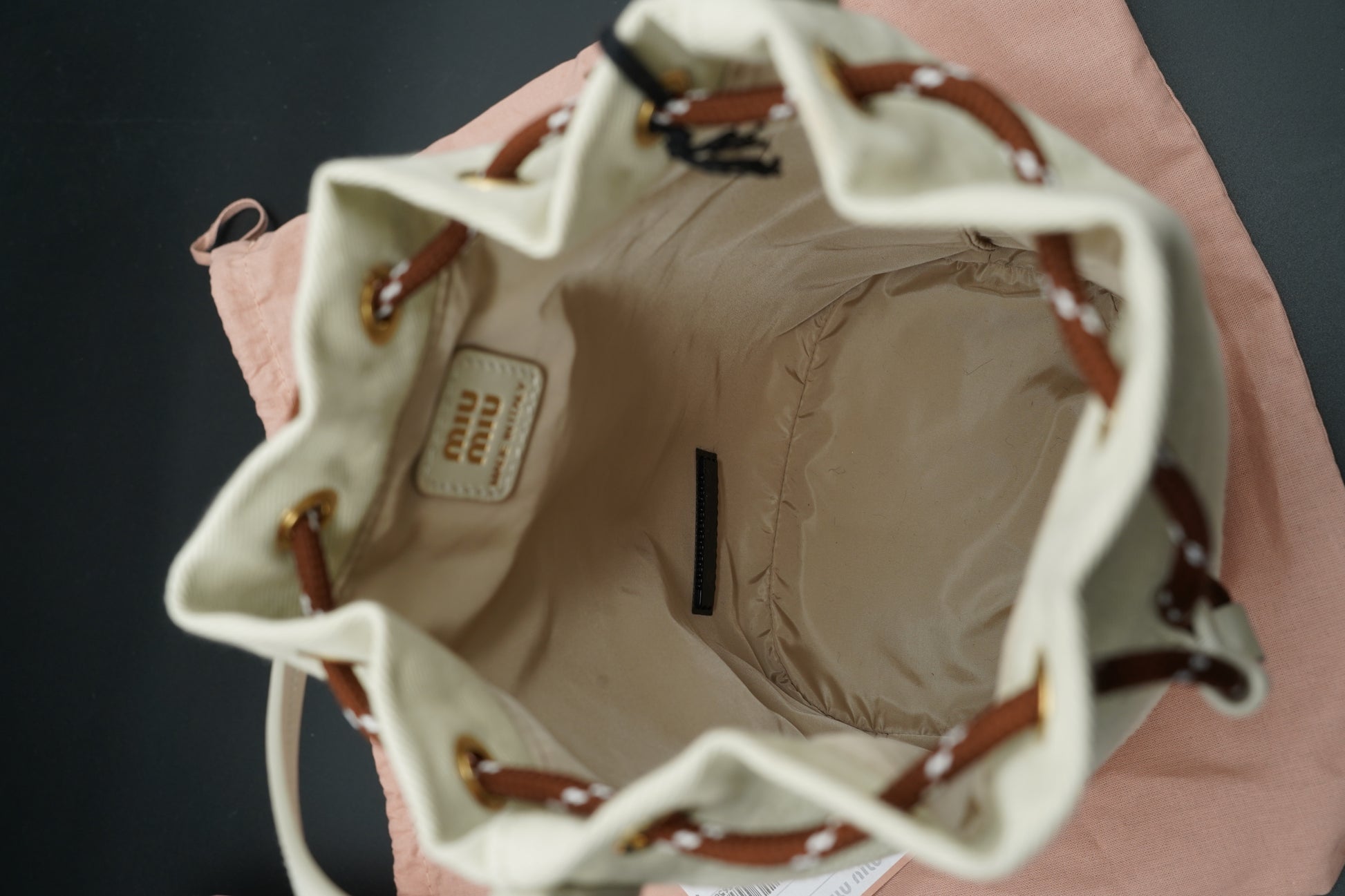Dal design essenziale e contemporaneo, questa borsa secchiello Miu Miu unisce funzionalità e raffinatezza in un modello compatto e versatile. Realizzata in canvas color avorio, si distingue per le linee morbide e per l’estetica minimal, impreziosita da dettagli curati.