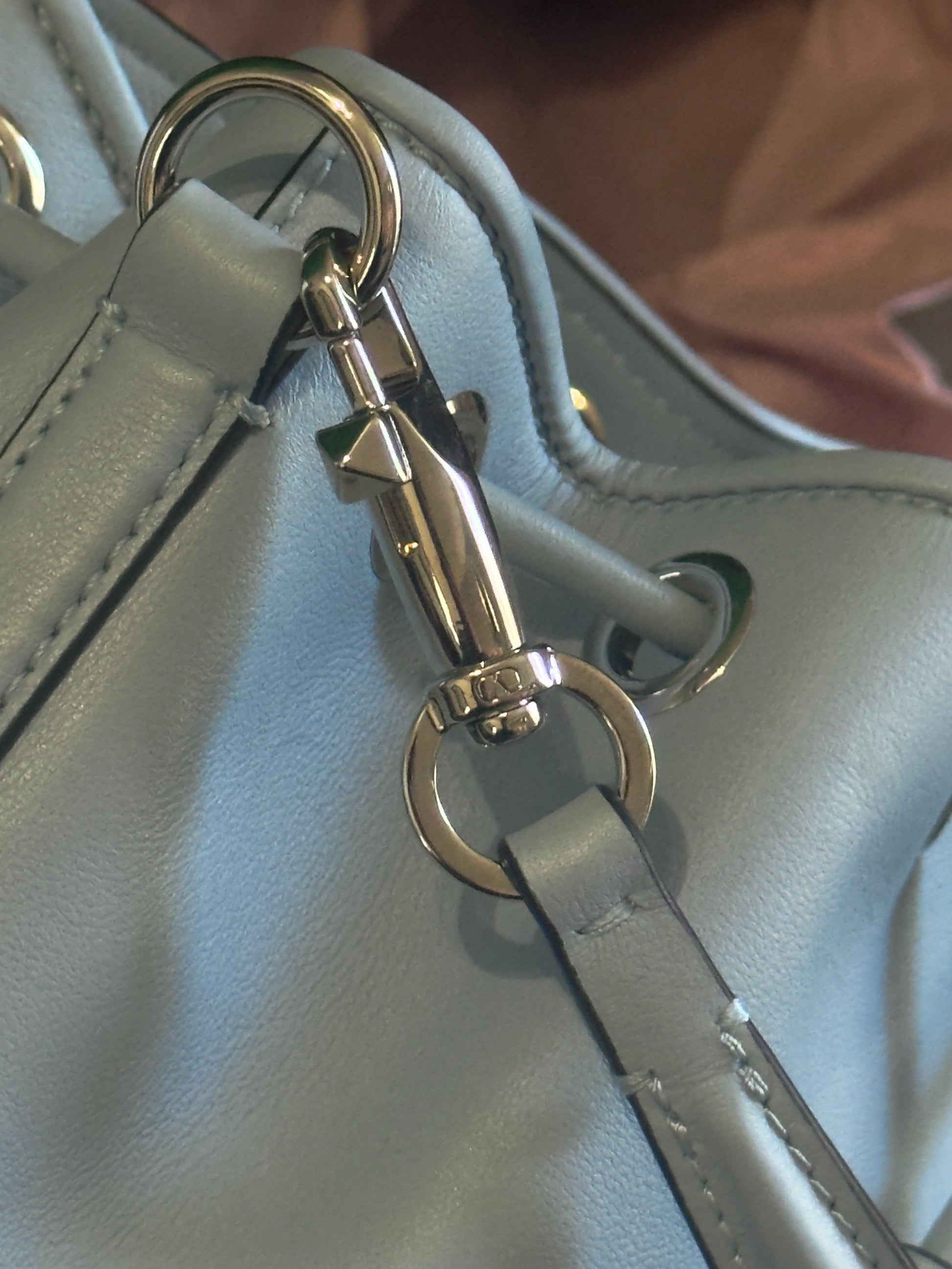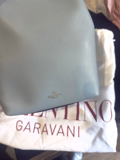 La Valentino VLogo Bucket Bag in tonalità light blue unisce eleganza contemporanea e artigianalità italiana. Realizzata in morbida pelle di vitello, presenta un design a secchiello raffinato e un 'identità distintiva grazie all’iconico VLogo frontale.